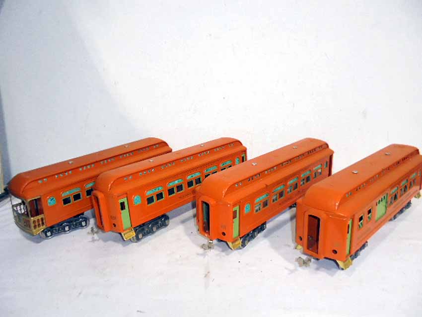 | Lot 146 | Lionel Standard Gauge #428/429/430/431 Orange Passenger Cars (Repainted) |
