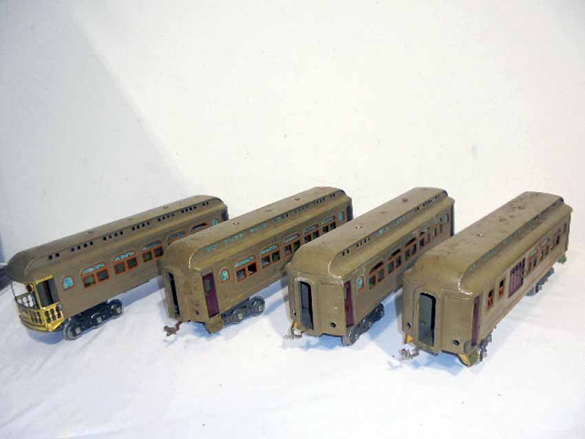 | Lot 149 | Lionel Standard Gauge #418 Mojave Combination Car, #419 Parlor Car, #431 Dinging Car, and #490 Observation Car/6 Wheel Trucks |