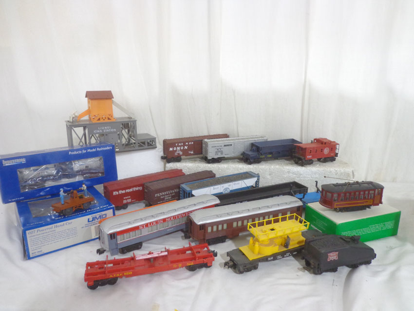 | Lot 233 | Assorted Manufactures St. Louis Southern Observation Car, Unmarked Passenger Car, #027 Hand Car, Trolley, Rock Island Tender and 13 Cars and Accessories/OBs |