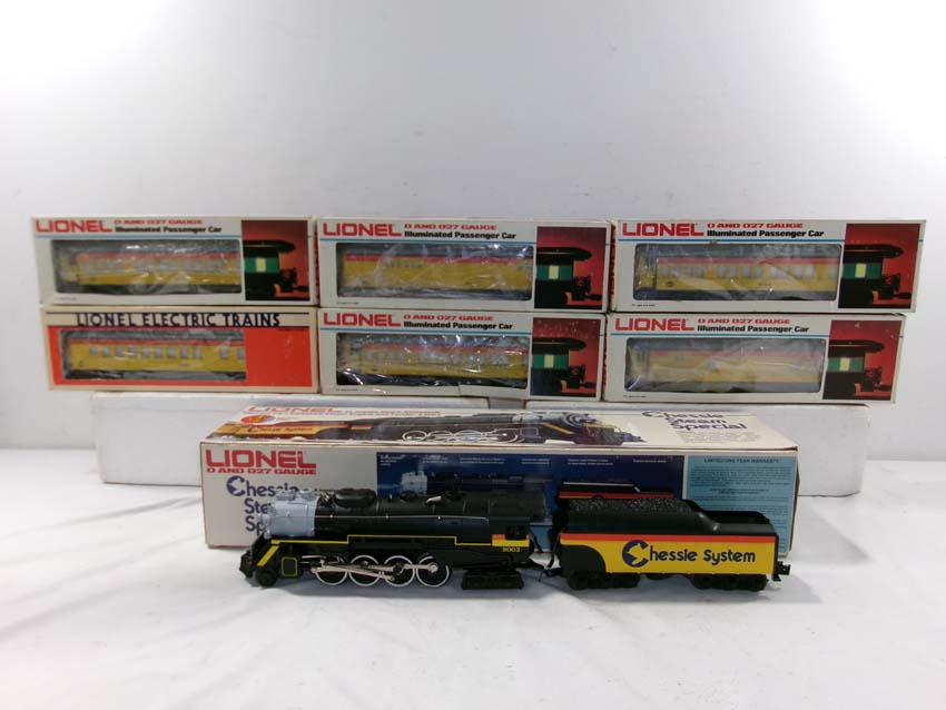 | Lot 250 | Lionel #8003 Chessie 2-8-4 Berkshire Steam Engine & Tender and #9581/9582/9583/9584/9585/9586 Passenger Cars/OBs |