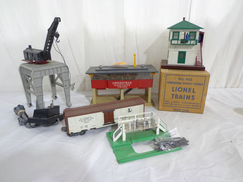 | Lot 330 | Lionel #445 Operating Switch Tower, #465 Sound Dispatching Station, #282R Bucyrus Erie Portal Gantry Crane, 3662-1 Operating Milk Car/OB | |||