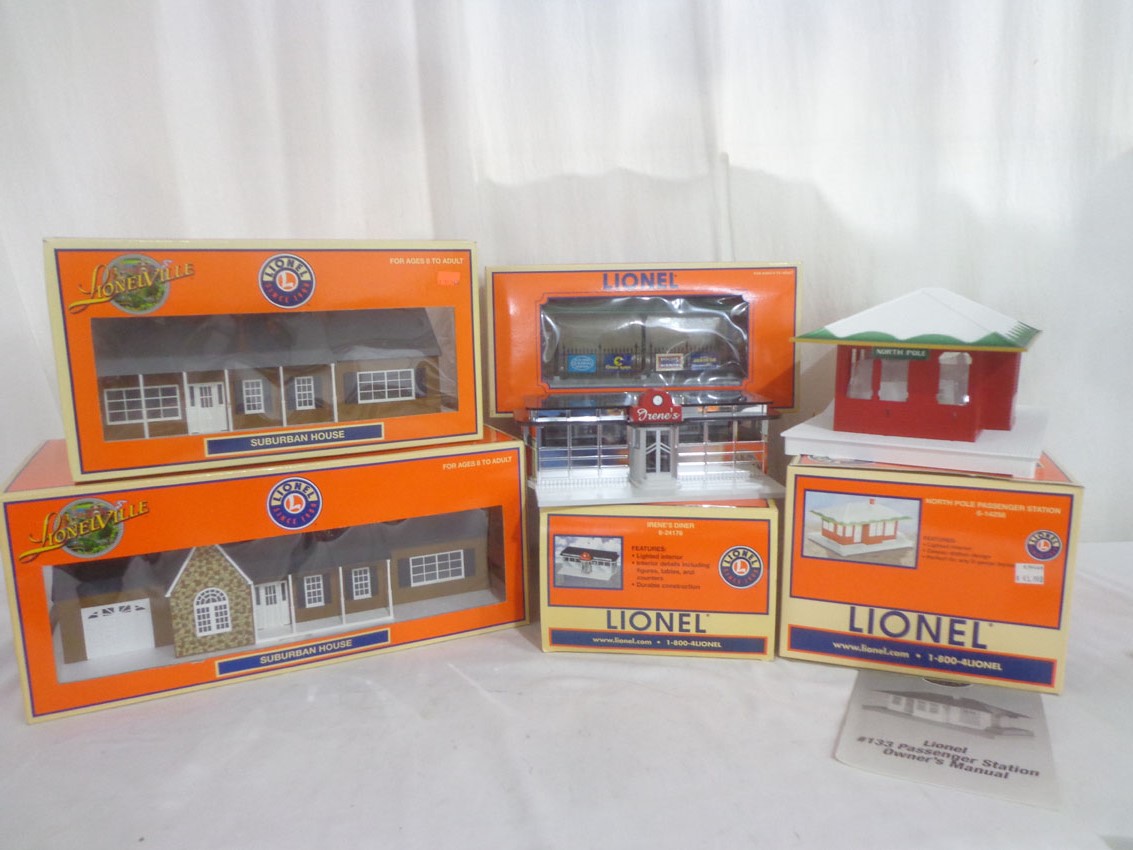 | Lot 378 | Mint Lionel #14258 North Pole Passenger Station, #24176 Irene Diner, #14096 Station Platform, #34109 Large Suburban House, and #34110 Estate House/OBs |