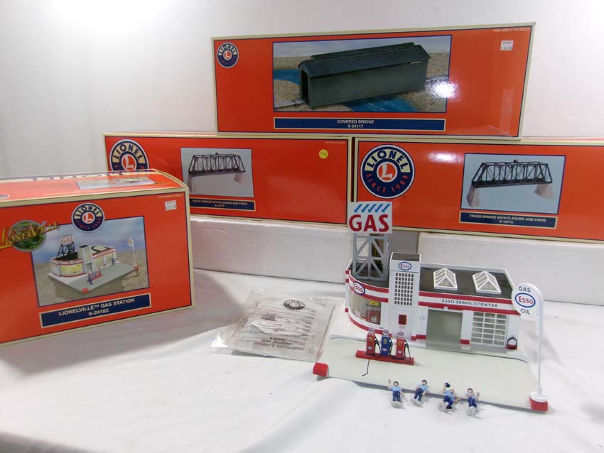 | Lot 377 | Lionel #24183 Lionelville Gas Station, 2 #12772 Trestle Bridges w/Flashers & Piers, and #24117 Covered Bridge/OBs |