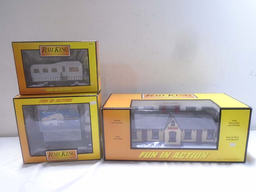 | Lot 365 | MTH #30-9051 Myerstown Passenger Station, #30-90005 Mobile Home, and #30-90088 Amtrak Lighted Billboard/OB |