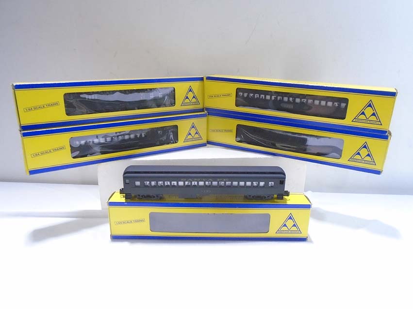 | Lot 43 | American Models S Gauge: #3379 SF Green Heavyweight Baggage Car, #3382 SF Combine Car, #1517 SF RPO Car, #1114 SF Coach and #1191 SF Observation/OBs |