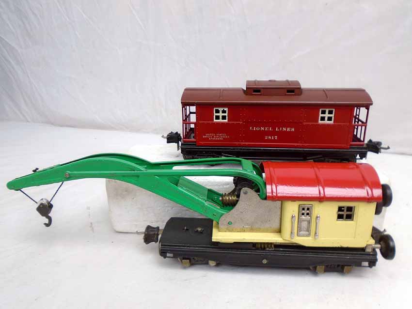 These are the O Gauge #3859 Dump Car, #810 Yellow Crane w/Green Boom, #2817 Caboose and #3651 Log Dump Car that Lionel made in the late 1930s. No Boxes. Examine very closely; what is pictured is what you will receive. Please add $45.00 for US-48 Shipping and Insurance (more west of the Mississippi).