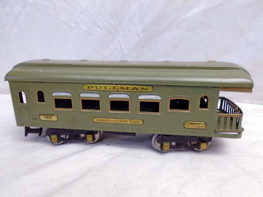 These are the Wide Gauge #184/185/186 Passenger Cars (mostly repainted) that Ives made in the 1920s. No Boxes. Examine very closely; what is shown is what you will receive. Please add $45.00 for US-48 Shipping and Insurance (more west of the Mississippi). |