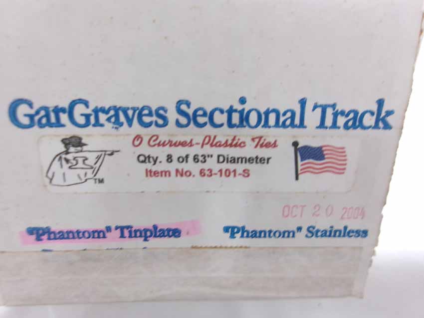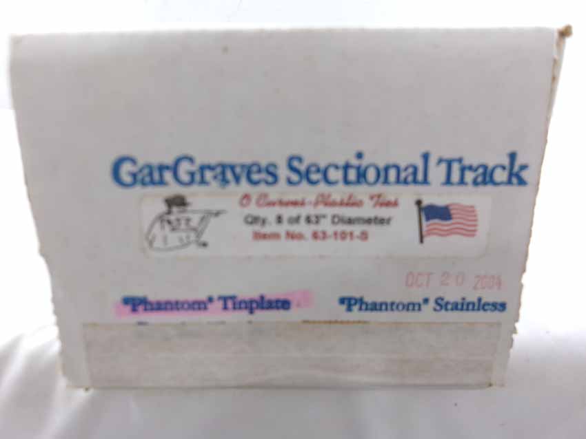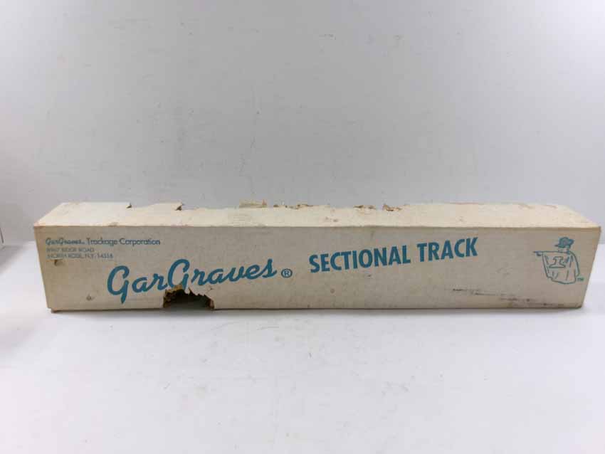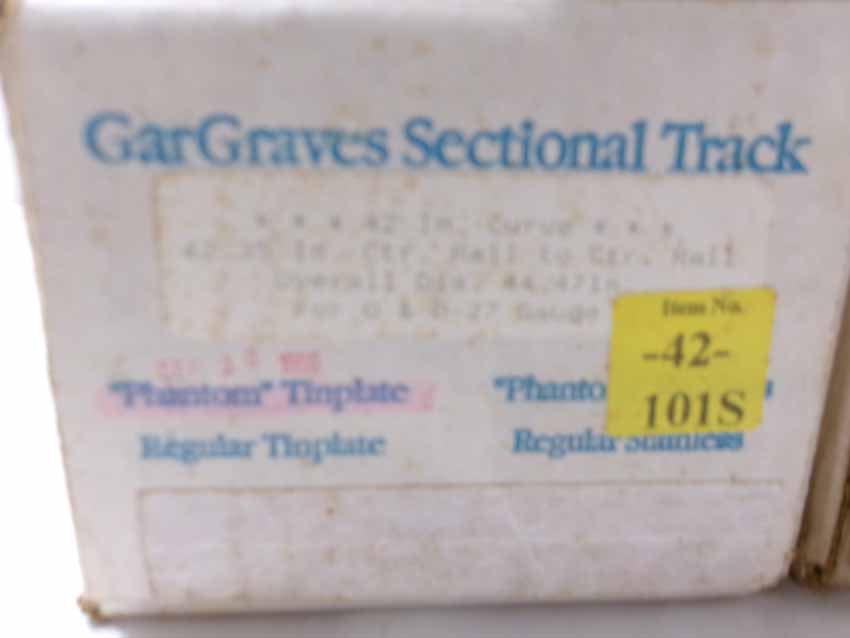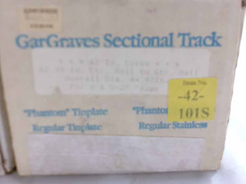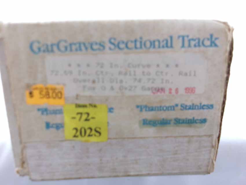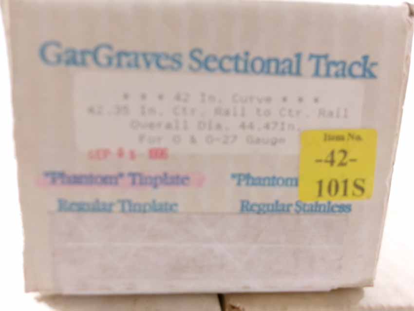 These are GarGraves three boxes of #42-101S Curved Track (24 sections, 42" dia.), box of #63-101S Curved Track (8 sections, 63" dia), and box of #72-202S Curved Track (8 sections, 72" dia.). Our Opinion is that they are generally in Mint Condition. Original Boxes. All Original in our Opinion. Please add $50.00 for US-48 Shipping and Insurance (more west of the Mississippi).