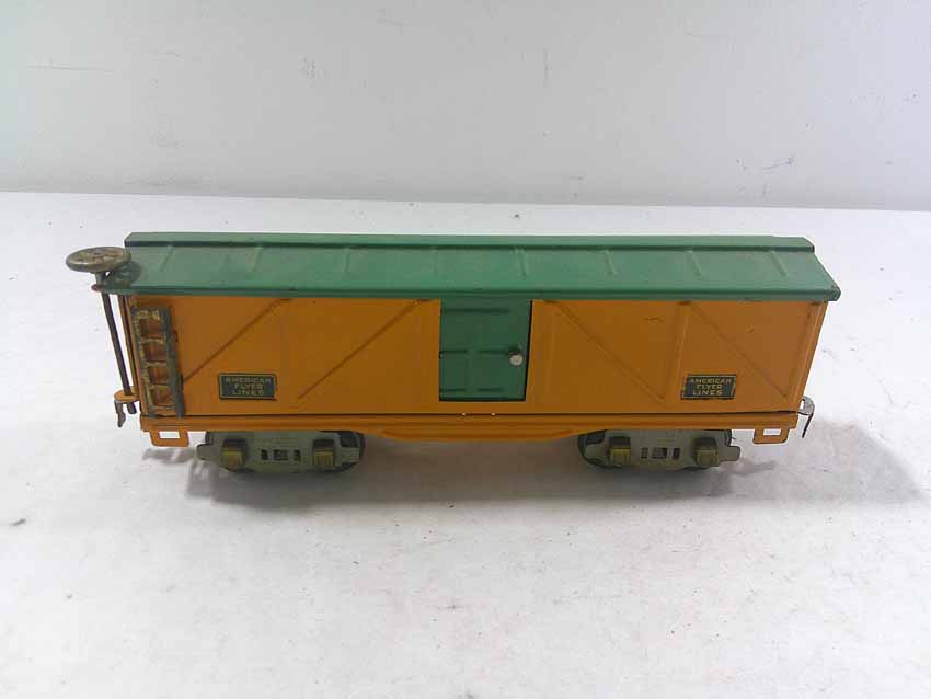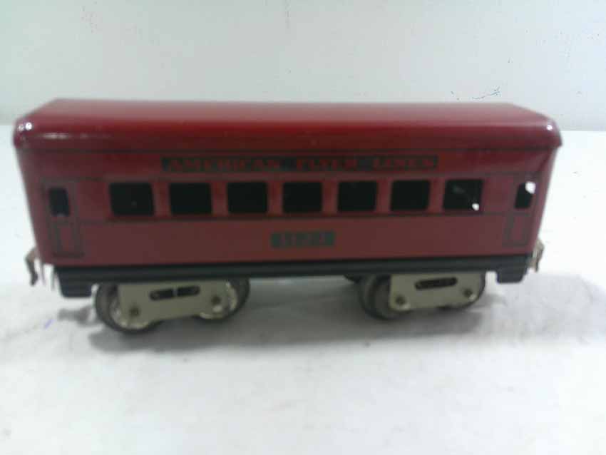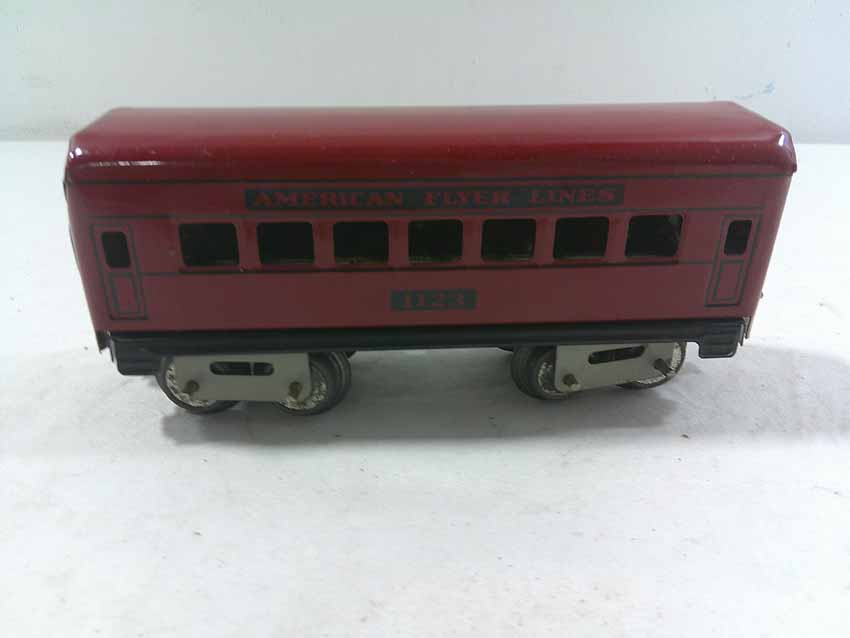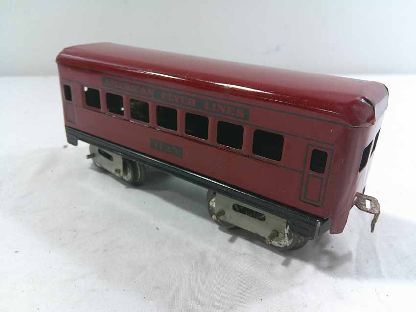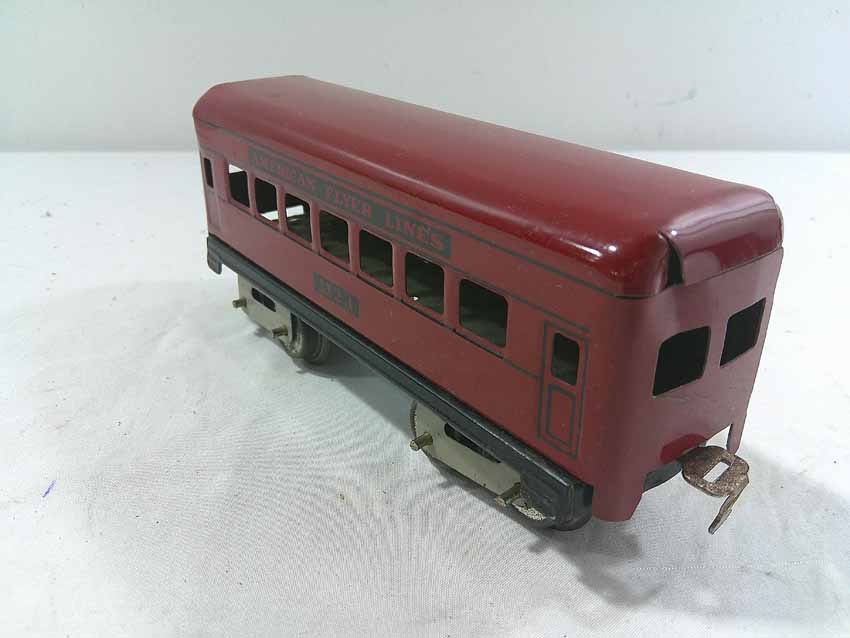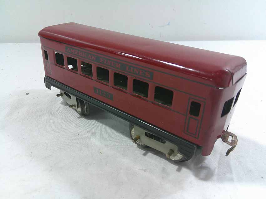 These are the American Flyer #1123/1123/1123 Passenger Coaches and four Assorted Freight Cars made Pre War. No Boxes. Examine very closely; what is pictured is what you will receive. Please add $45.00 for US-48 Shipping and Insurance (more west of the Mississippi). |