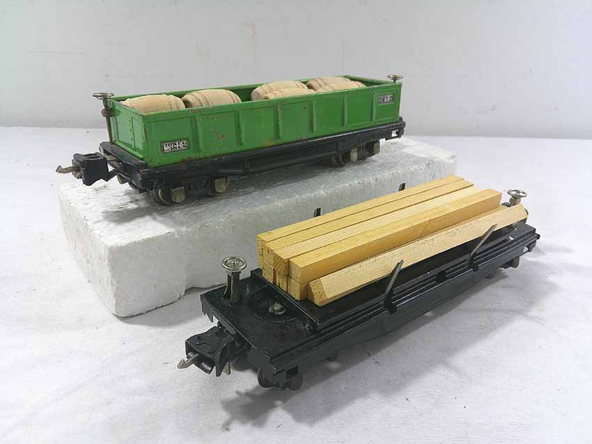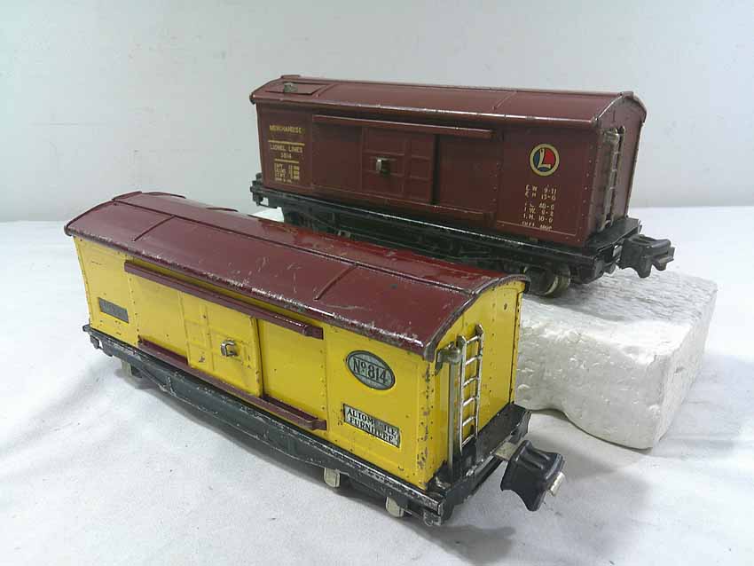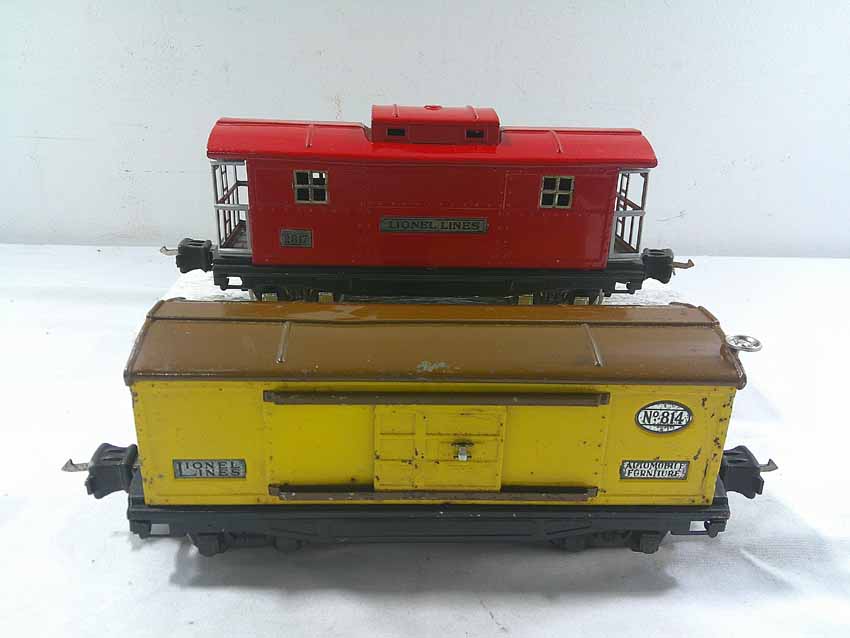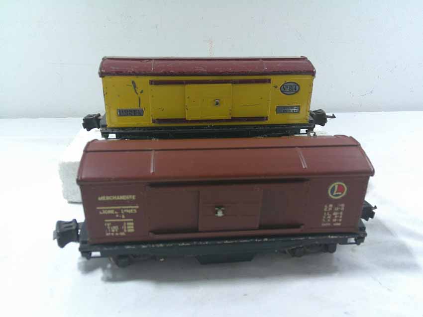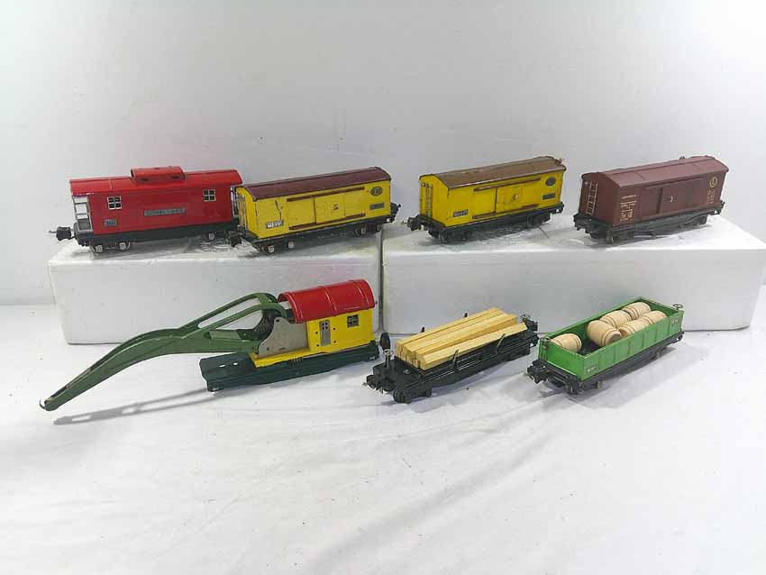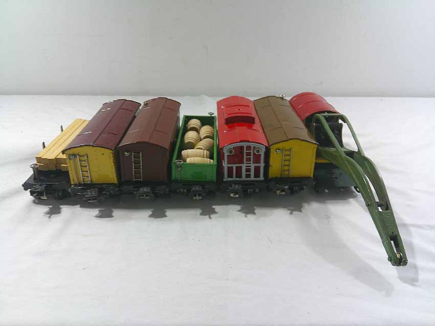 These are seven #800/2800 Series Assorted Freight Cars (three operating, crane missing parts) that Lionel made in the 1930s/early 1940s. No Boxes. Examine closely; what is pictured is what you will receive. Please add $50.00 for US-48 Shipping and Insurance (more west of the Mississippi).
