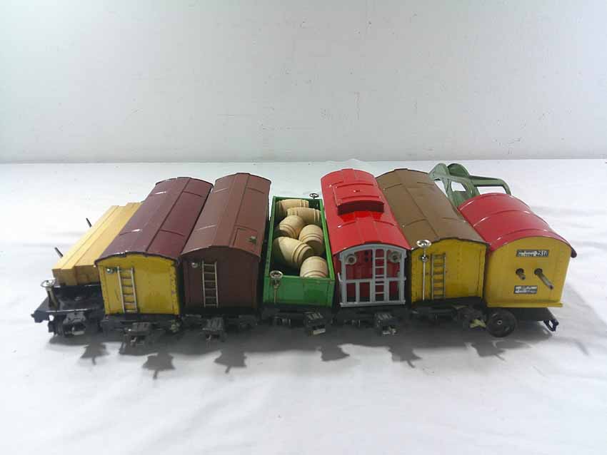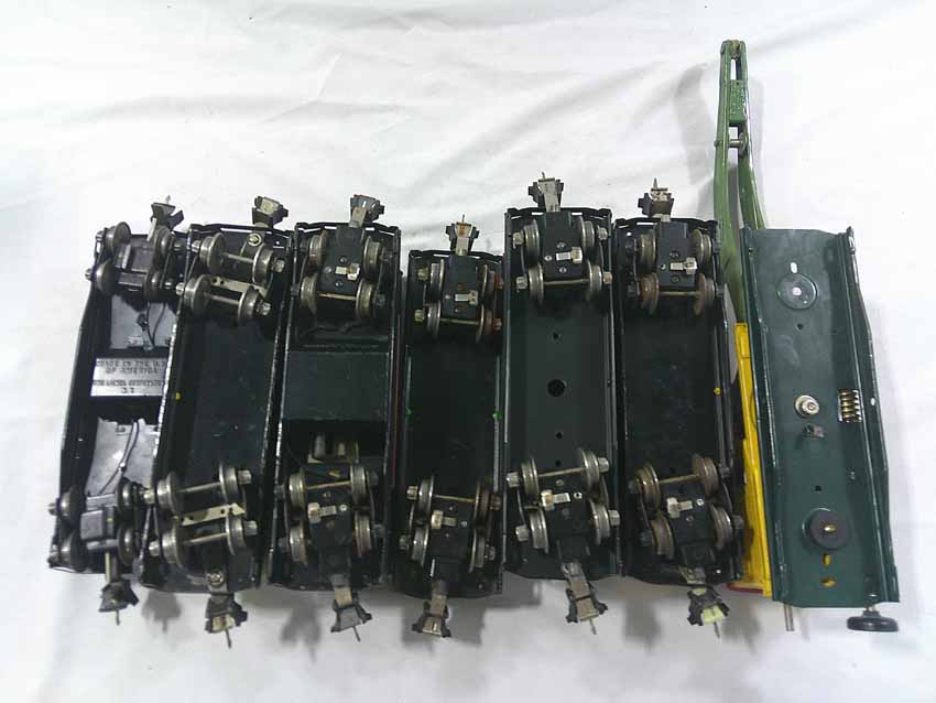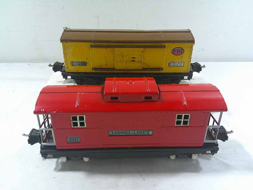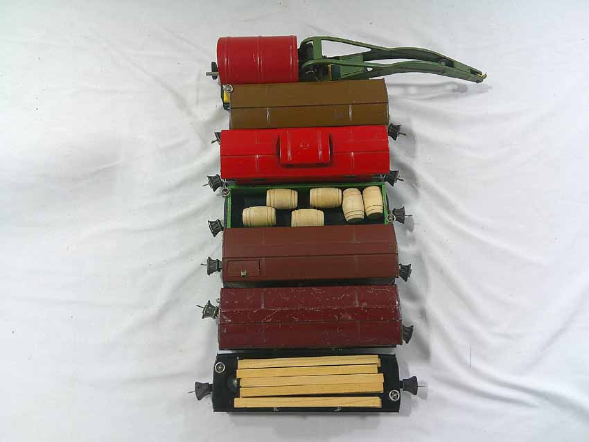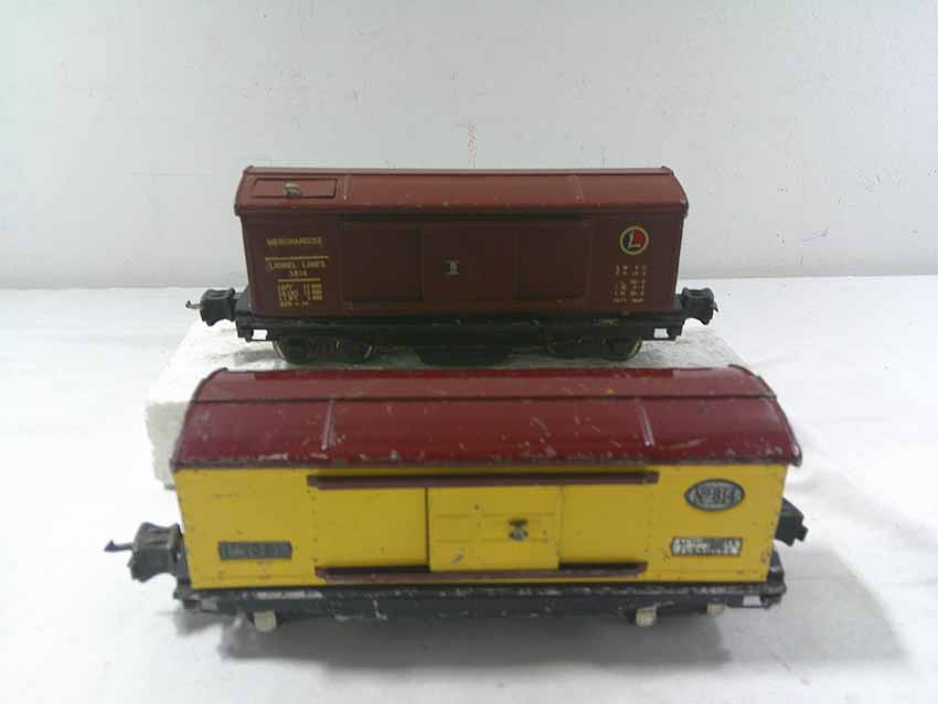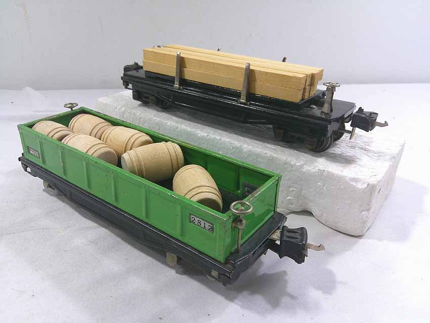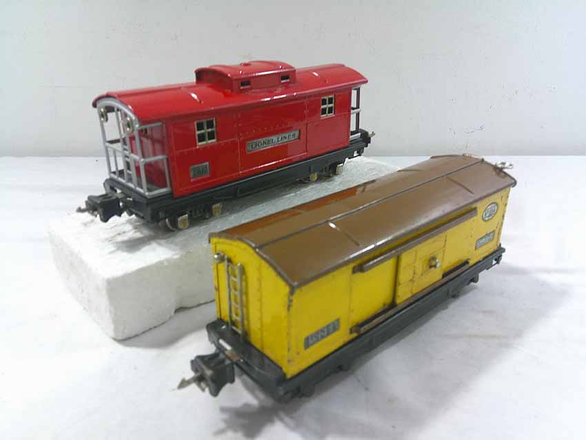 These are seven #800/2800 Series Assorted Freight Cars (three operating, crane missing parts) that Lionel made in the 1930s/early 1940s. No Boxes. Examine closely; what is pictured is what you will receive. Please add $50.00 for US-48 Shipping and Insurance (more west of the Mississippi).
