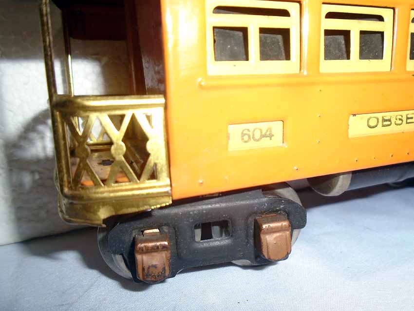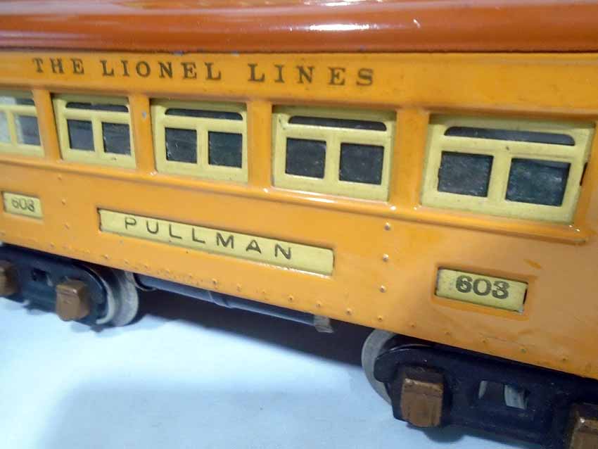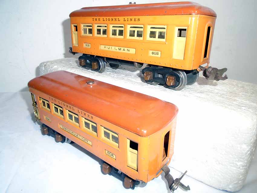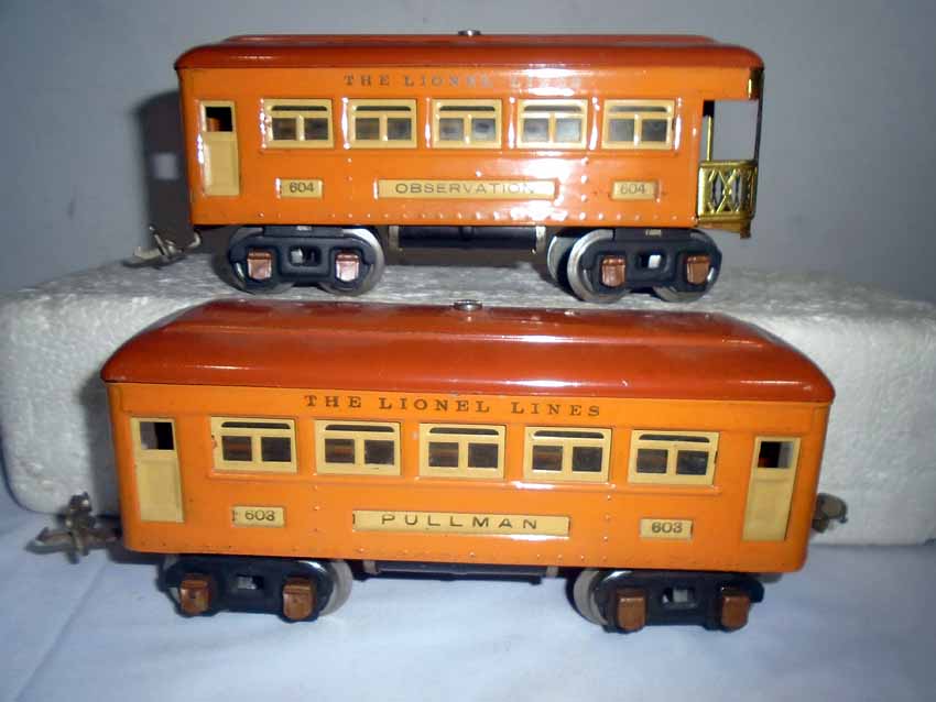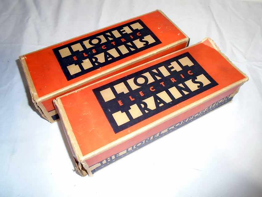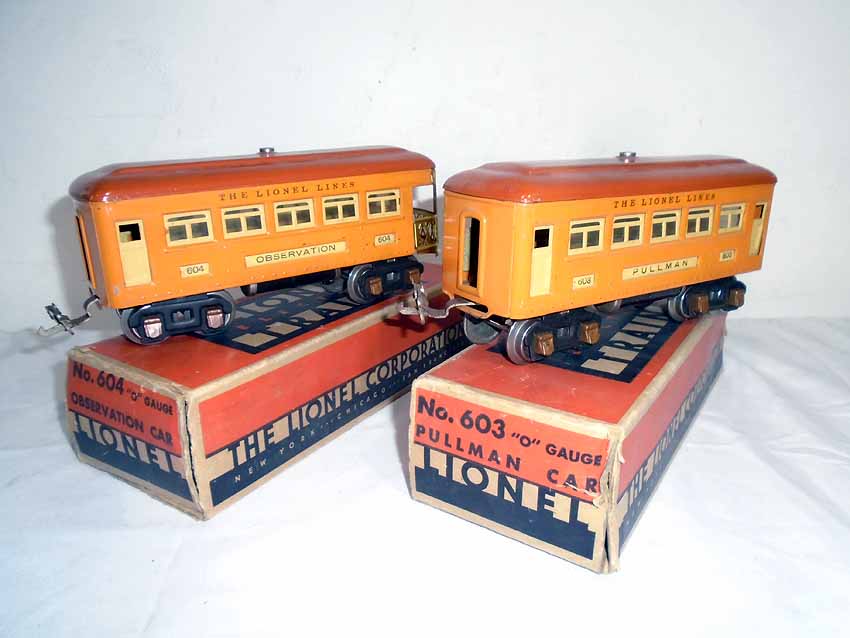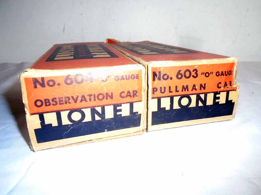 These are the #603/604 Two Tone Orange Passenger Cars that Lionel made in the late 1920s. Original Boxes (one missing one end flap). Examine very closely; what is pictured is what you will receive. Please add $30.00 for US-48 Shipping and Insurance (more west of the Mississippi).