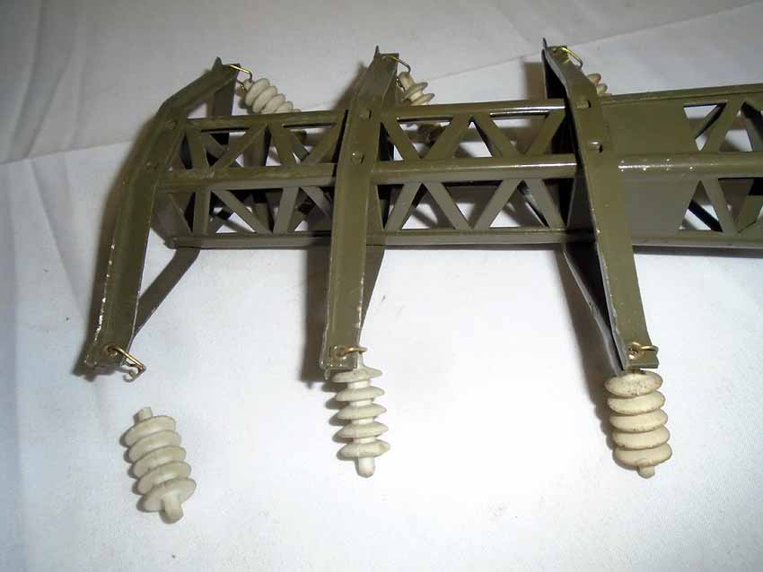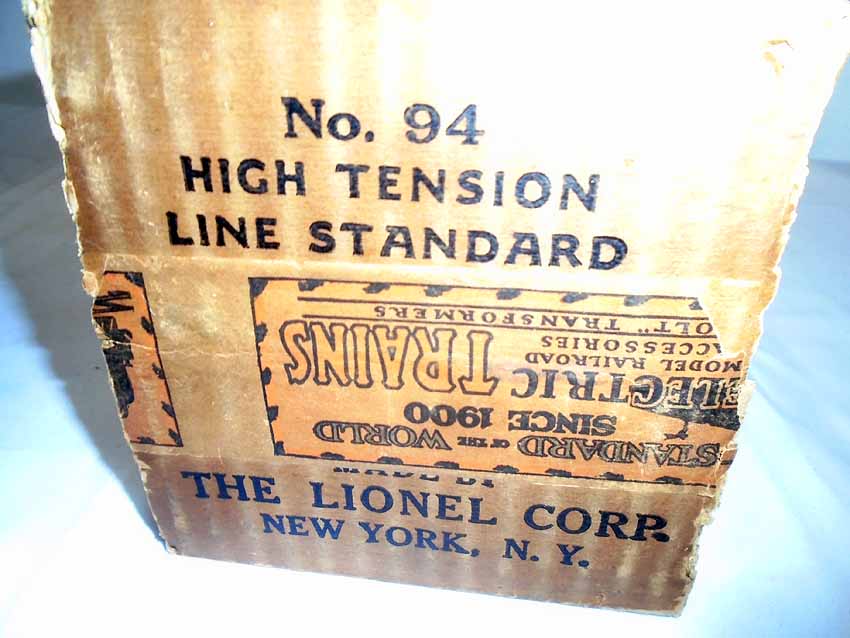 This is the Lionel Standard Gauge #94 High Tension Tower (1 broken coil) made in the 1920s. Original Box (tattered). Examine very closely; what is pictured is what you will receive. Please add $40.00 for US-48 Shipping and Insurance (more west of the Mississippi). |