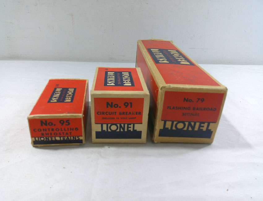 These are the #95 Controlling Rheostat, #91 Circuit Breaker, and #79 Flashing RR Signal that Lionel made Pre War. Original Boxes. Examine closely; what is pictured is what you will receive. Please add $35.00 for US-48 Shipping and Insurance (more west of the Mississippi).