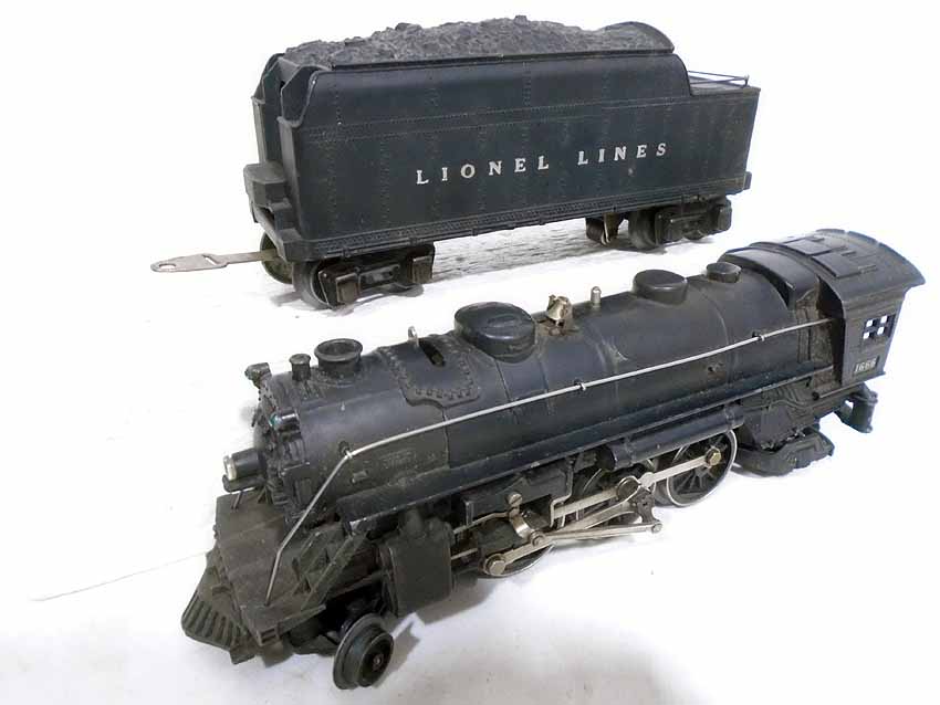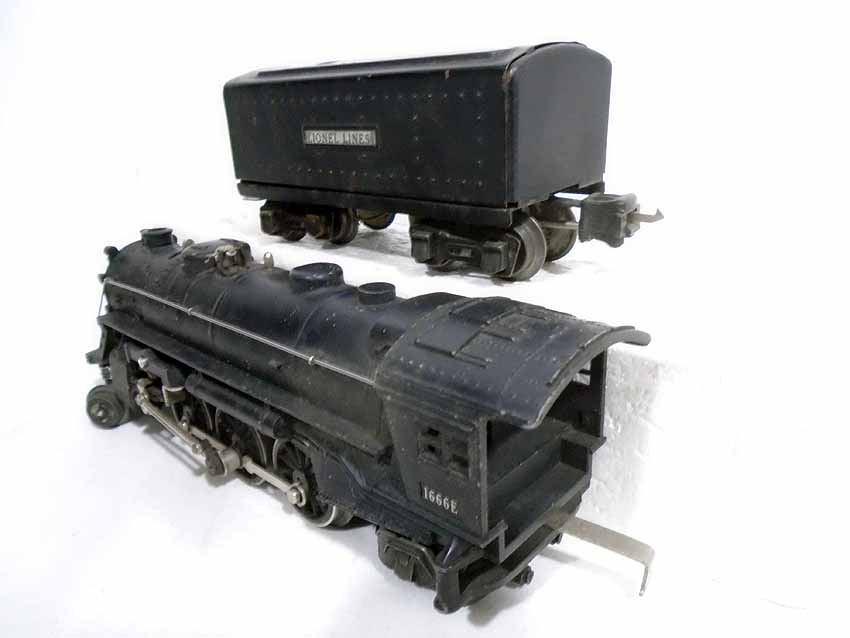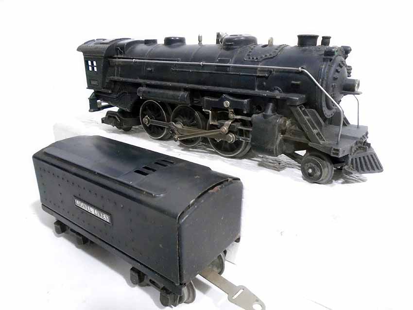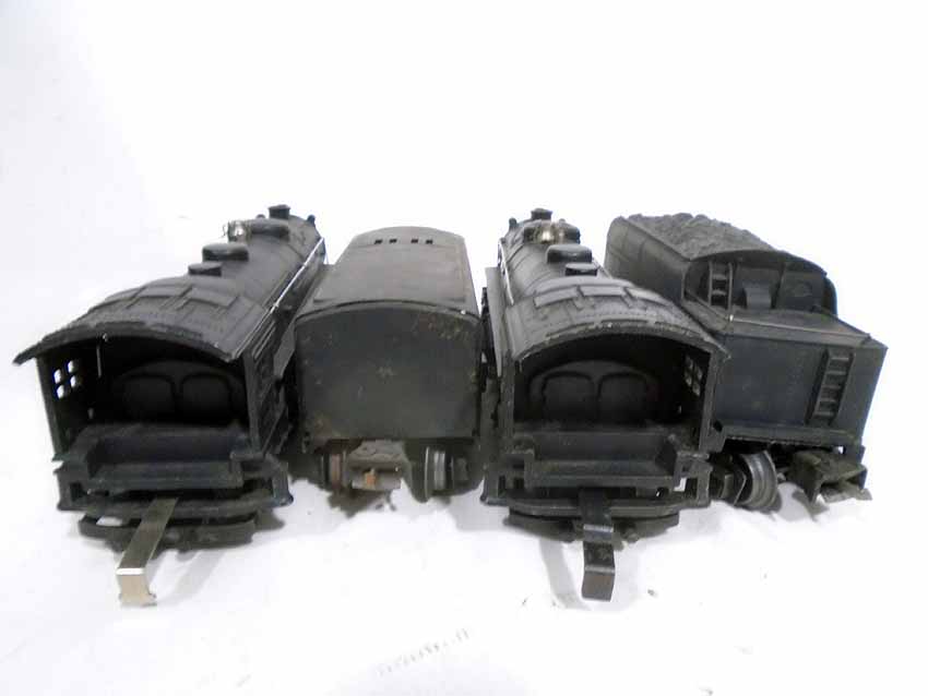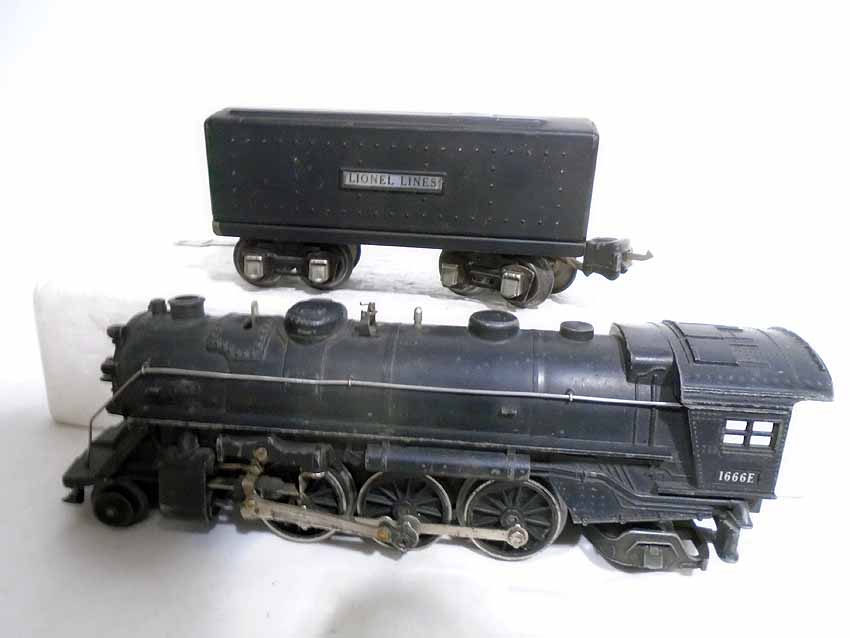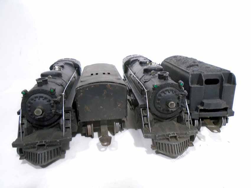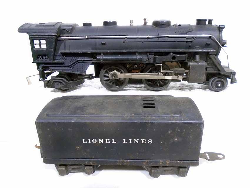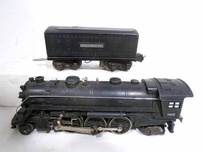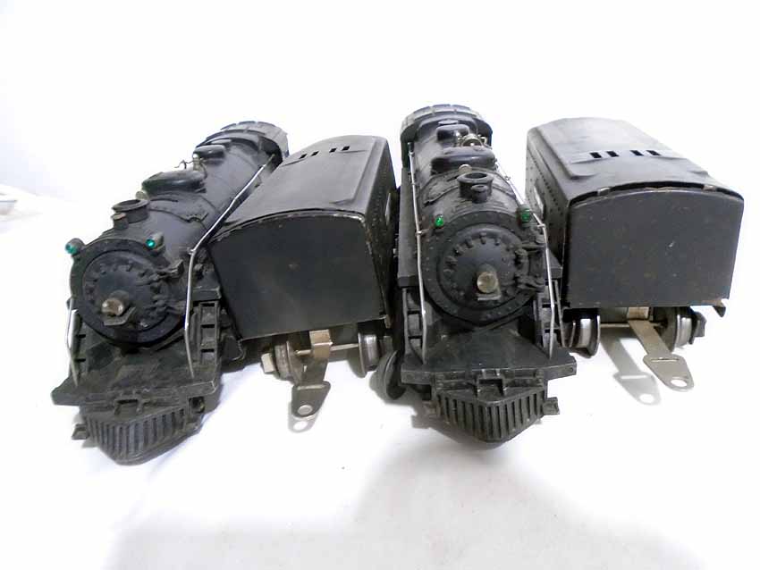 These are two #1666E 2-6-2 Steam Engines & Tenders, #1664 2-4-2 Engine & Tender, and #1666 2-6-2 Engine & Tender that Lionel made Pre War (2 whistle tenders). No Boxes. Examine very closely; what is pictured is what you will receive. Please add $60.00 for US-48 Shipping and Insurance (more west of the Mississippi).