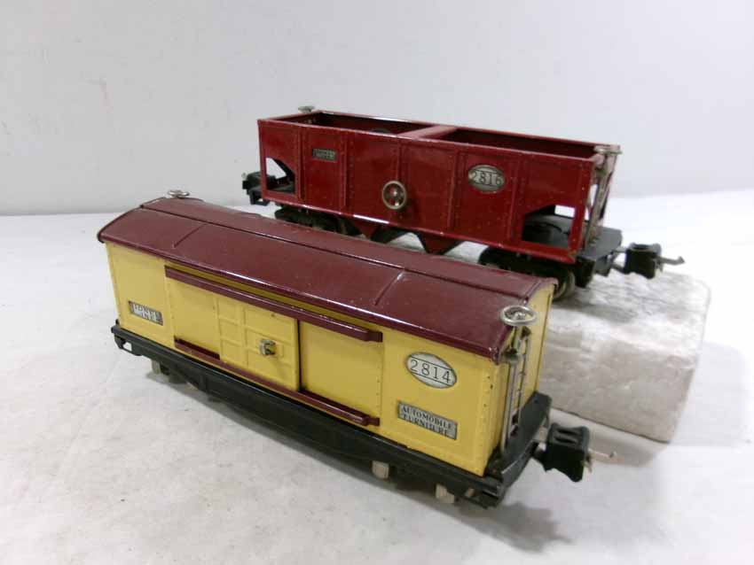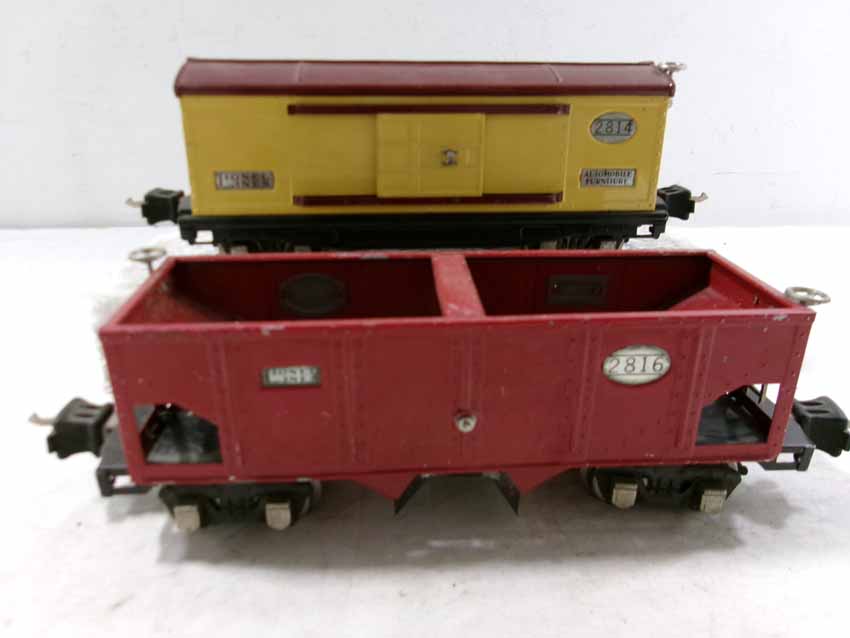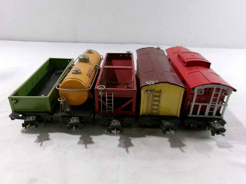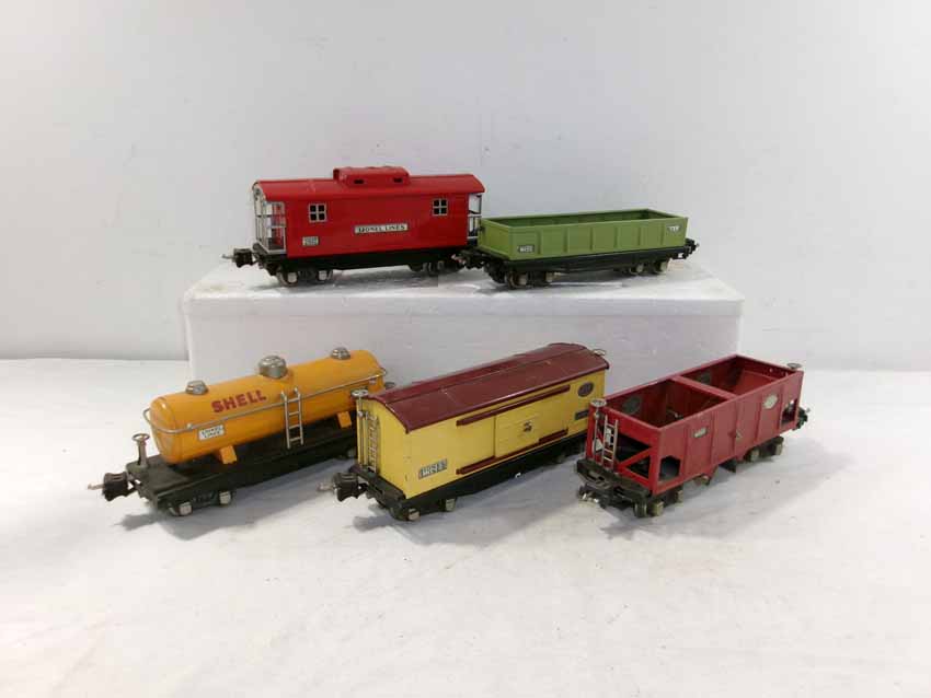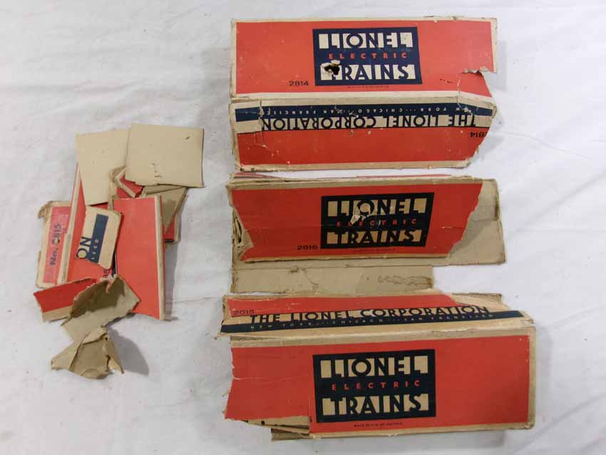 These are the #2812 Gondola, #2814 Refrigerator Car, #2815 Shell Tank Car, #2816 Hopper and #2817 Caboose that Lionel made Pre War. No Boxes/three sleeves. Examine very closely; what is pictured is what you will receive. Please add $35.00 for US-48 Shipping and Insurance (more west of the Mississippi).