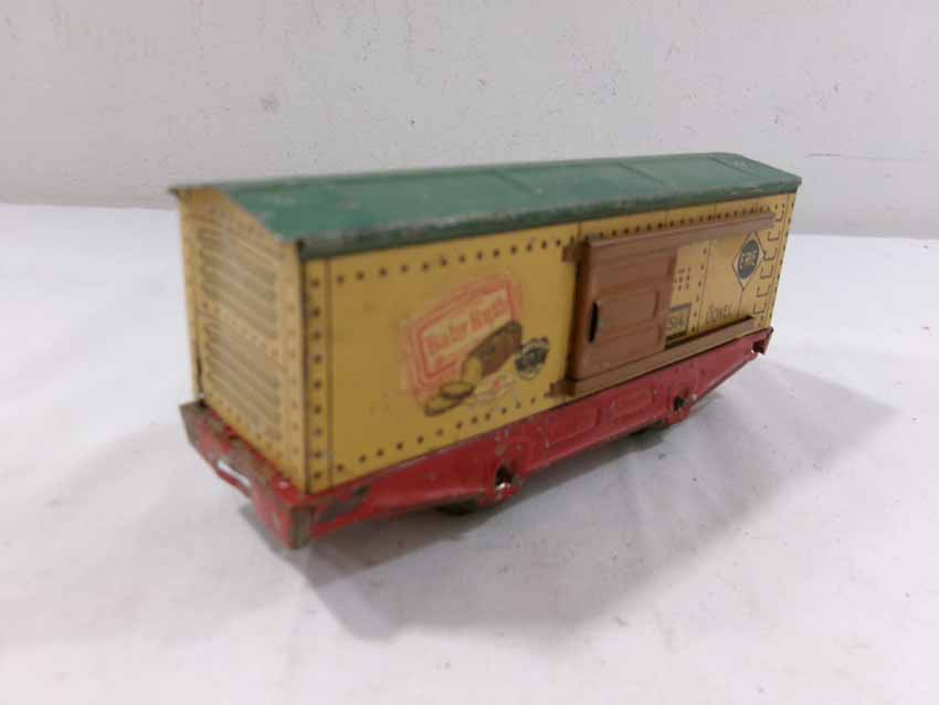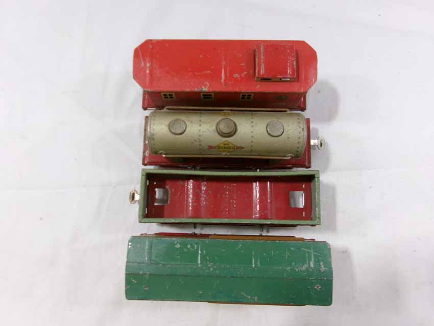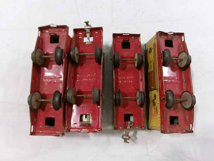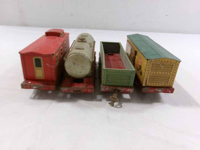 These are the #1512 Gondola, #1514 Baby Ruth Box Car, #1515 Sunoco Tank Car, and #1517 Caboose that Lionel made in the middle 1930s. Red Frame Clockworks. No Boxes. Examine closely; what is pictured is what you will receive. Please add $35.00 for US-48 Shipping and Insurance (more west of the Mississippi).