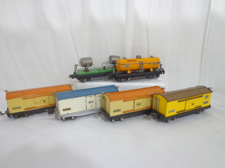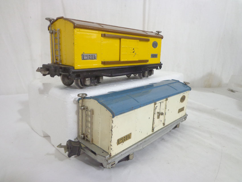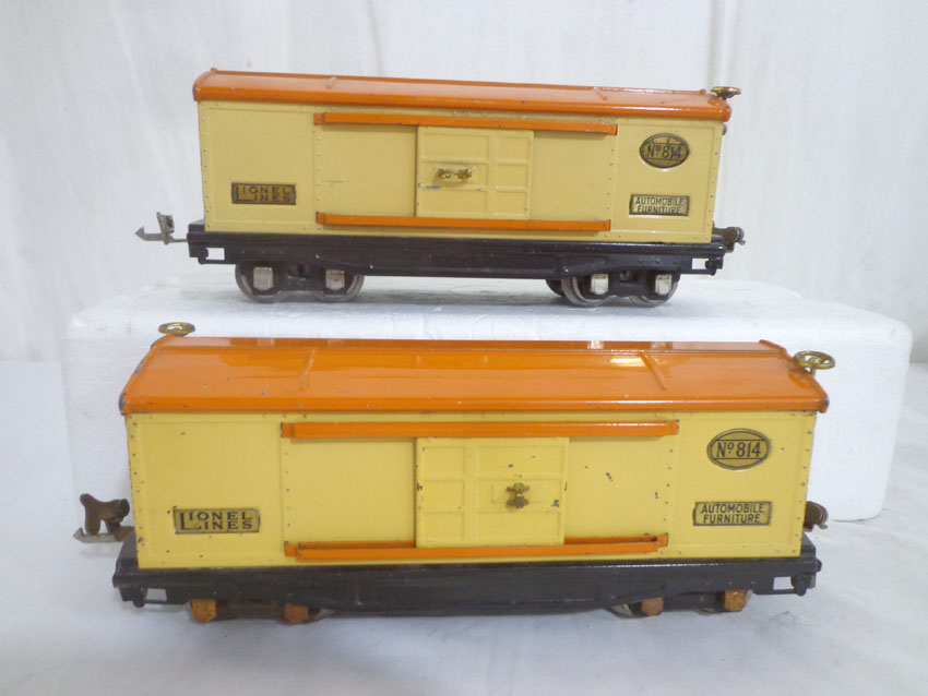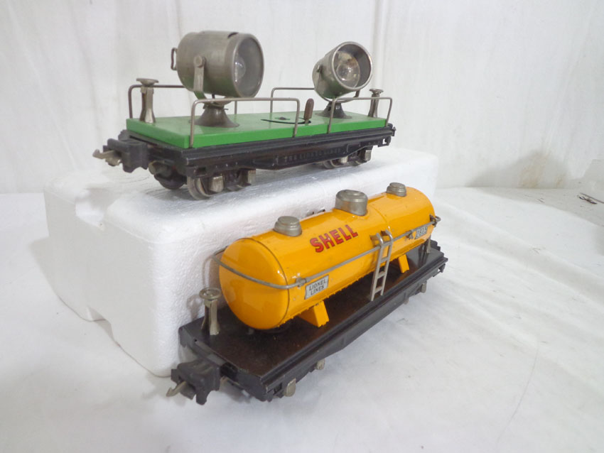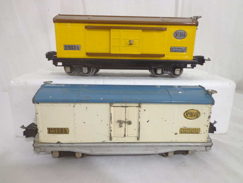 These are three #814 Series Box Cars, #814R Reefer, #2815 Shell Tank Car, and #2820 Searchlight Car (missing door handles) that Lionel made Pre War. No Boxes. Examine closely; what is pictured is what you will receive. Please add $50.00 for US-48 Shipping and Insurance (more west of the Mississippi).