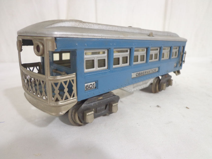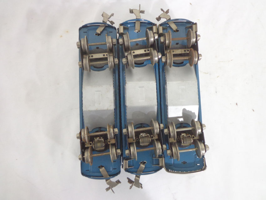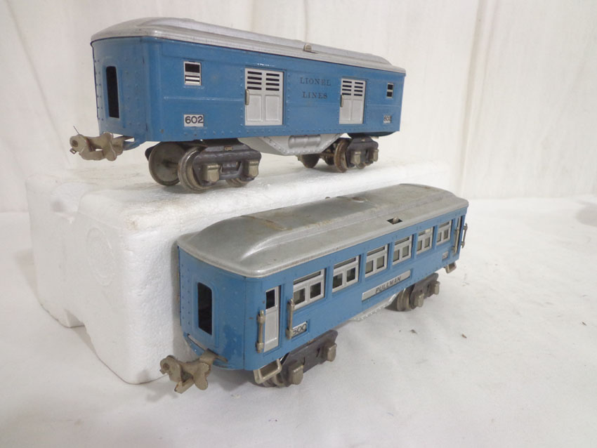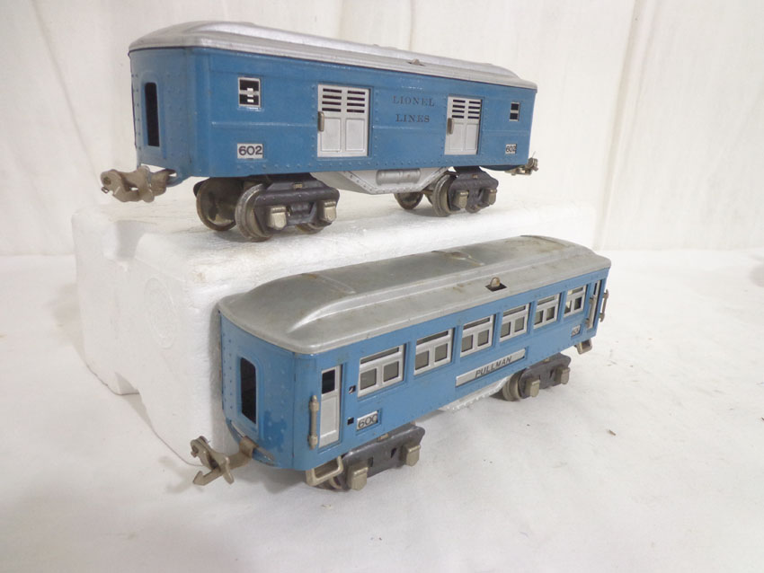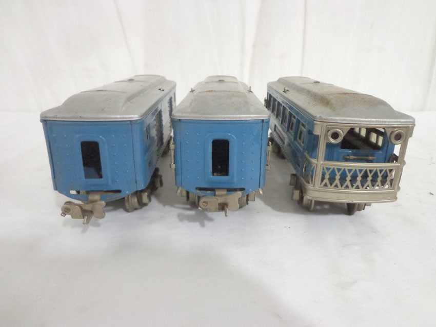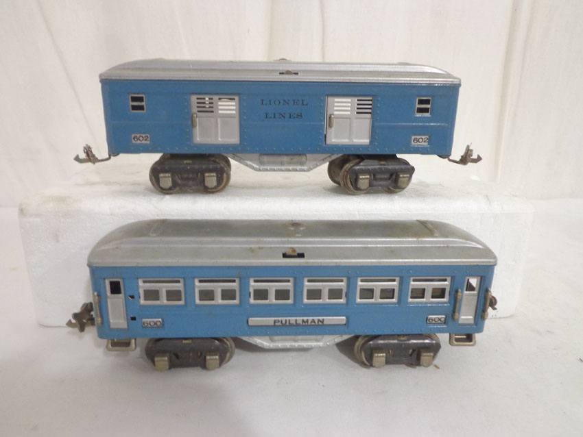 These are the #600/601/602 Light Blue/Aluminum Passenger Cars that Lionel made in the middle 1930s. No Boxes. Examine very closely; what is pictured is what you will receive. Please add $35.00 for US-48 Shipping and Insurance (more west of the Mississippi).