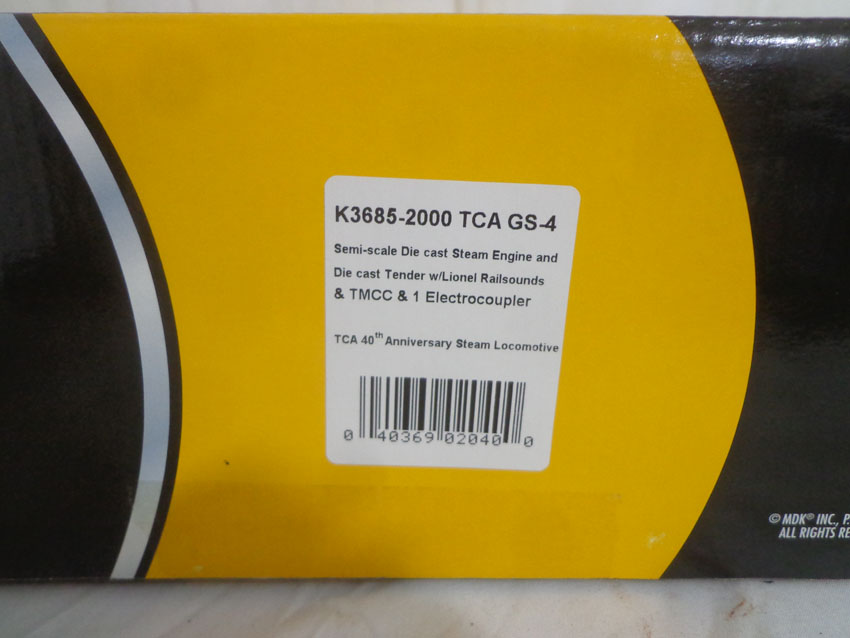 These are the #K3685-2000 TCA GS-4 4-8-4 Engine and Tender, the TCA Caboose, and the #40 TCA ABA Cabs that K-Line made circa 1994. Features Lionel Command Control, Railsounds and Electrocoupler. Our Opinion is that they are generally in Like New Condition. Original Box. All Original in our Opinion. Please add $50.00 for US-48 Shipping and Insurance (more west of the Mississippi).