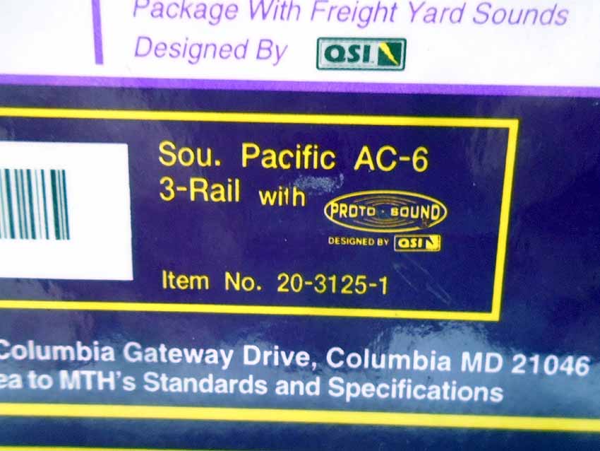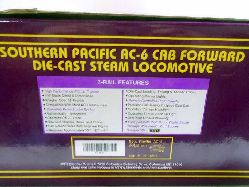 This is the #20-3125-1 SP 4-8-8-2 AC-6 Cab Forward Steam Engine & Tender (protosound 2) that MTH made a few years ago. Our Opinion is that it is generally in Like New Condition. Original Box. All Original in our Opinion. Please add $50.00 for US-48 Shipping and Insurance (more west of the Mississippi). |