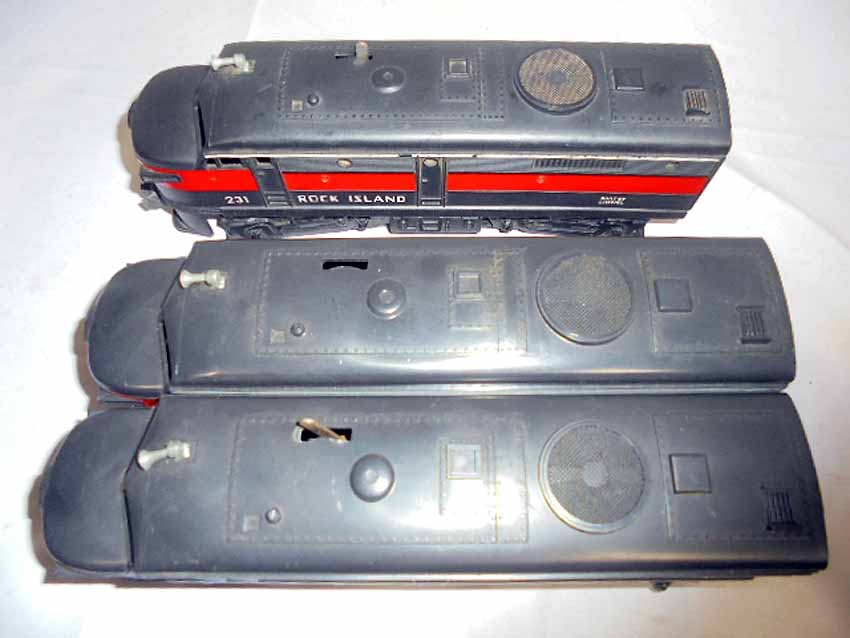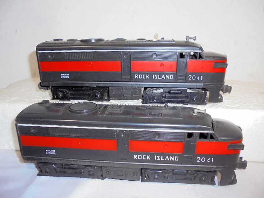 These are the #2041 Rock Island AA Twin Alcos and #231 Rock Island Power Unit that Lionel made in the 1950s/60s. No Boxes. Examine closely; what is pictured is what you will receive. Please add $45.00 for US-48 Shipping and Insurance (more west of the Mississippi).