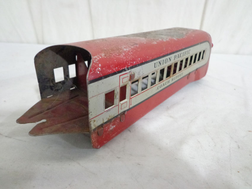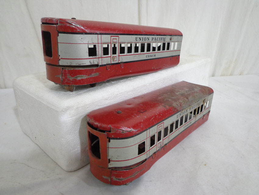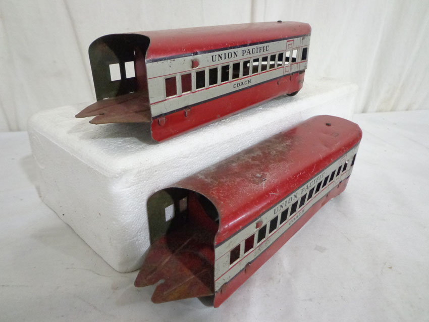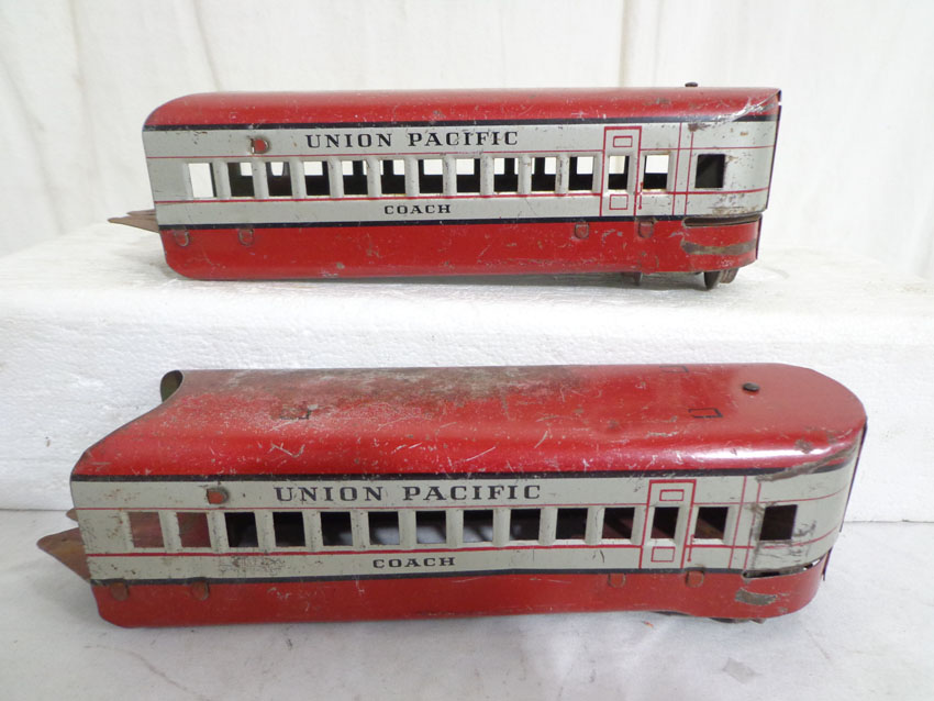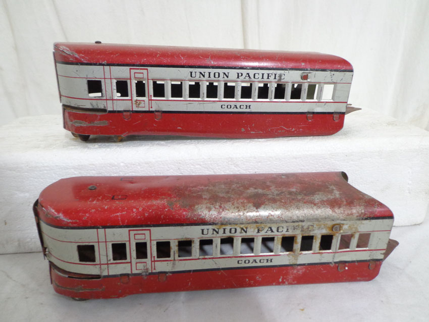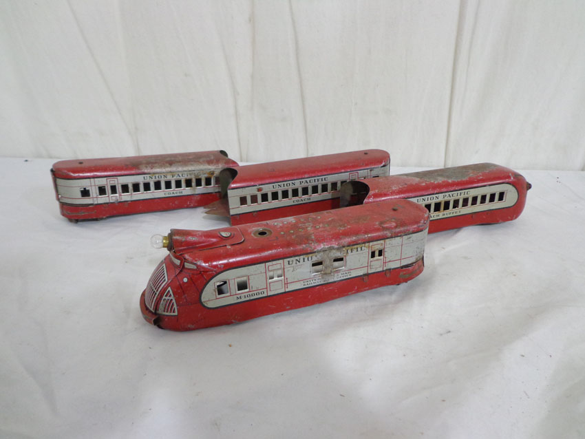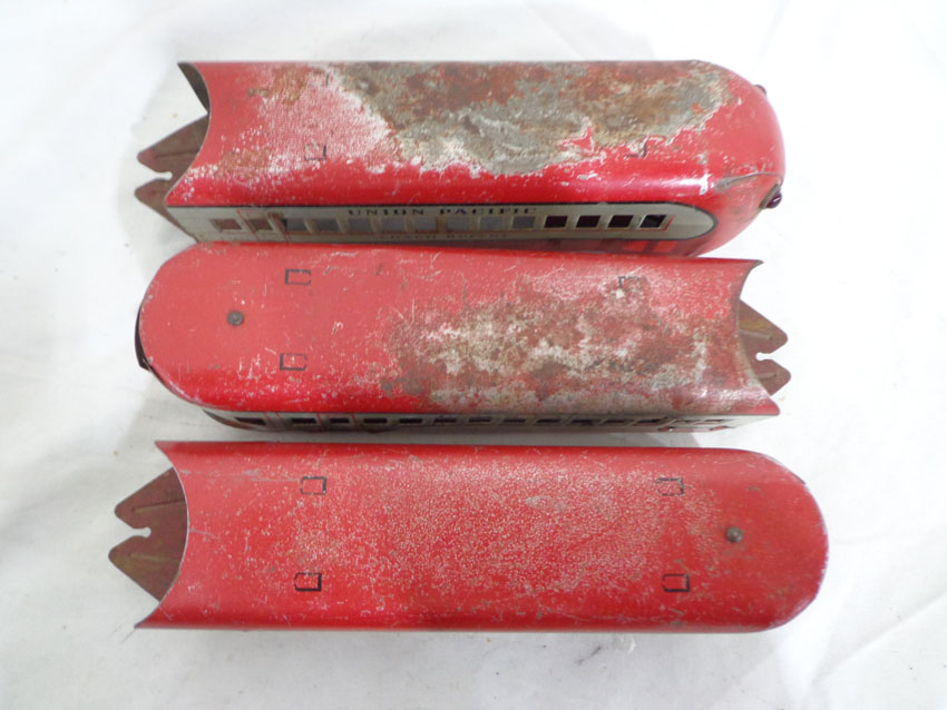 These are the Marx #M10000 Union Pacific Engine Shell and three Union Pacific Passenger Cars from the 1940s. No Boxes. Examine closely; what is pictured is what you will receive. Please add $35.00 for US-48 Shipping and Insurance (more west of the Mississippi).
