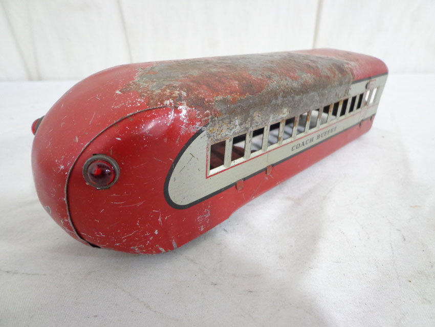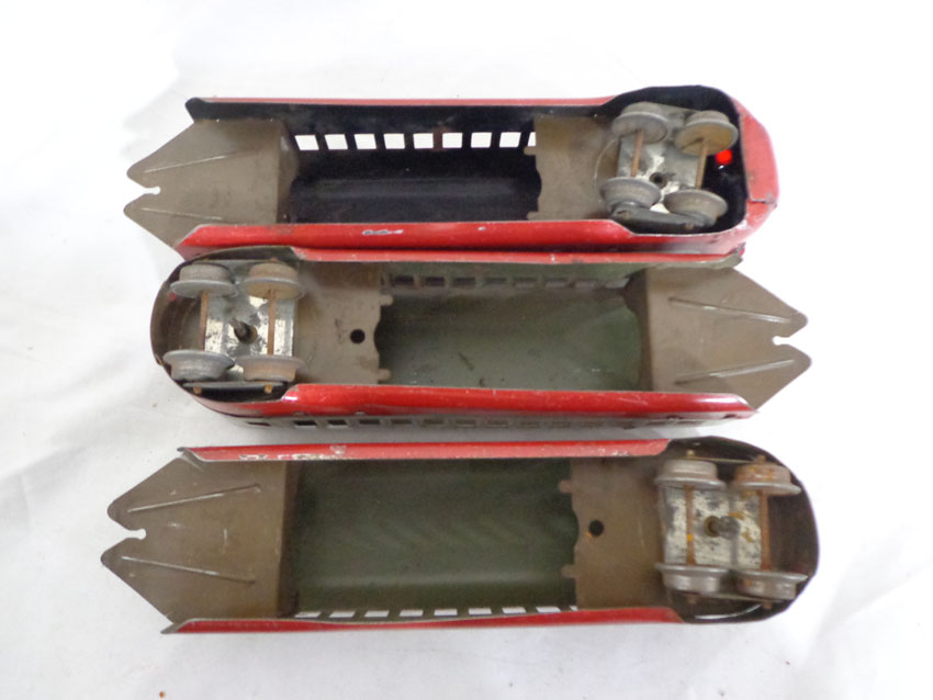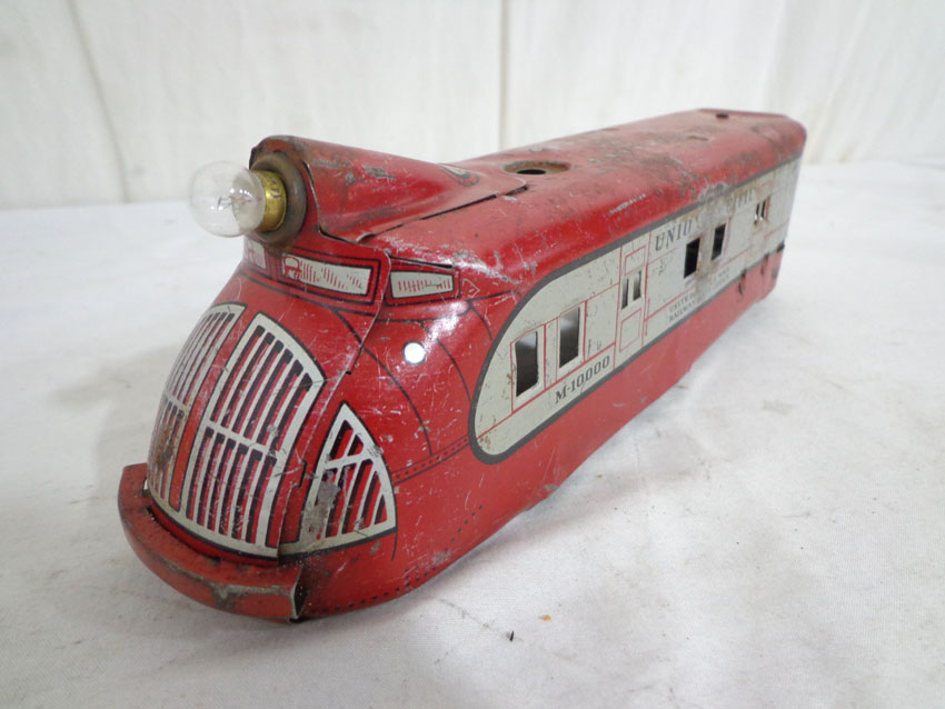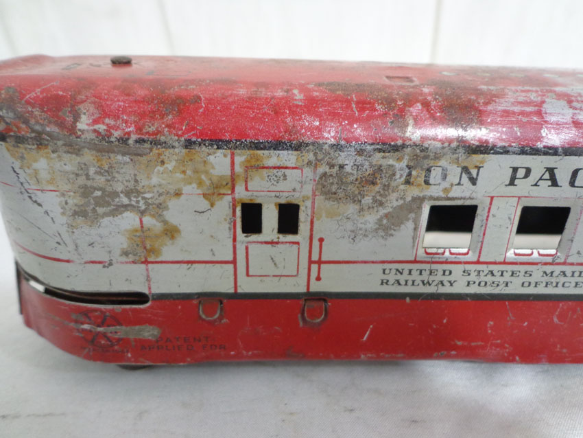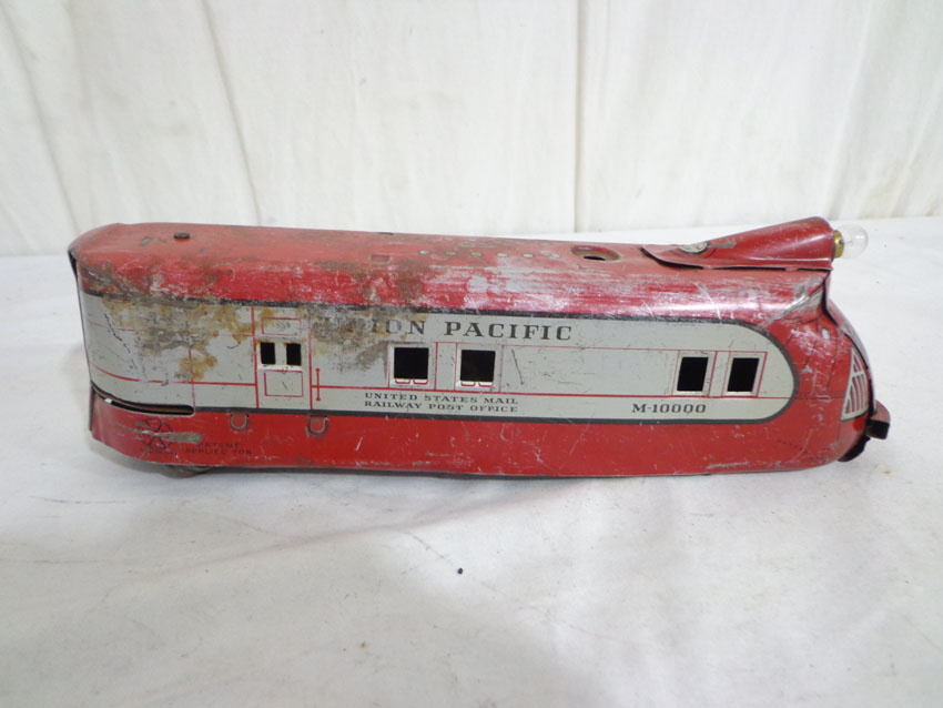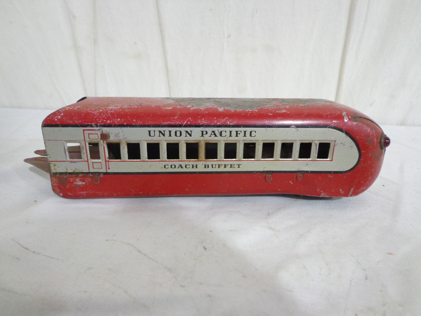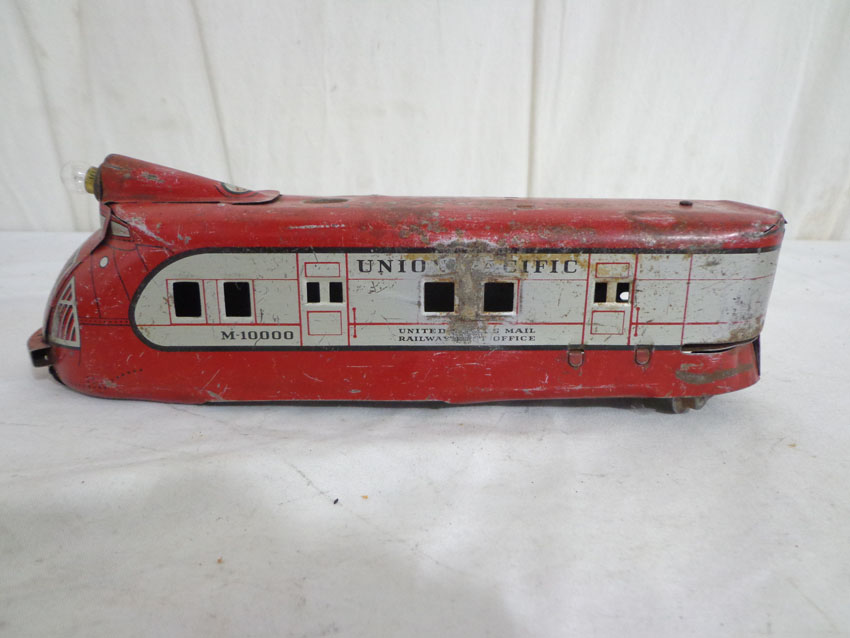 These are the Marx #M10000 Union Pacific Engine Shell and three Union Pacific Passenger Cars from the 1940s. No Boxes. Examine closely; what is pictured is what you will receive. Please add $35.00 for US-48 Shipping and Insurance (more west of the Mississippi).