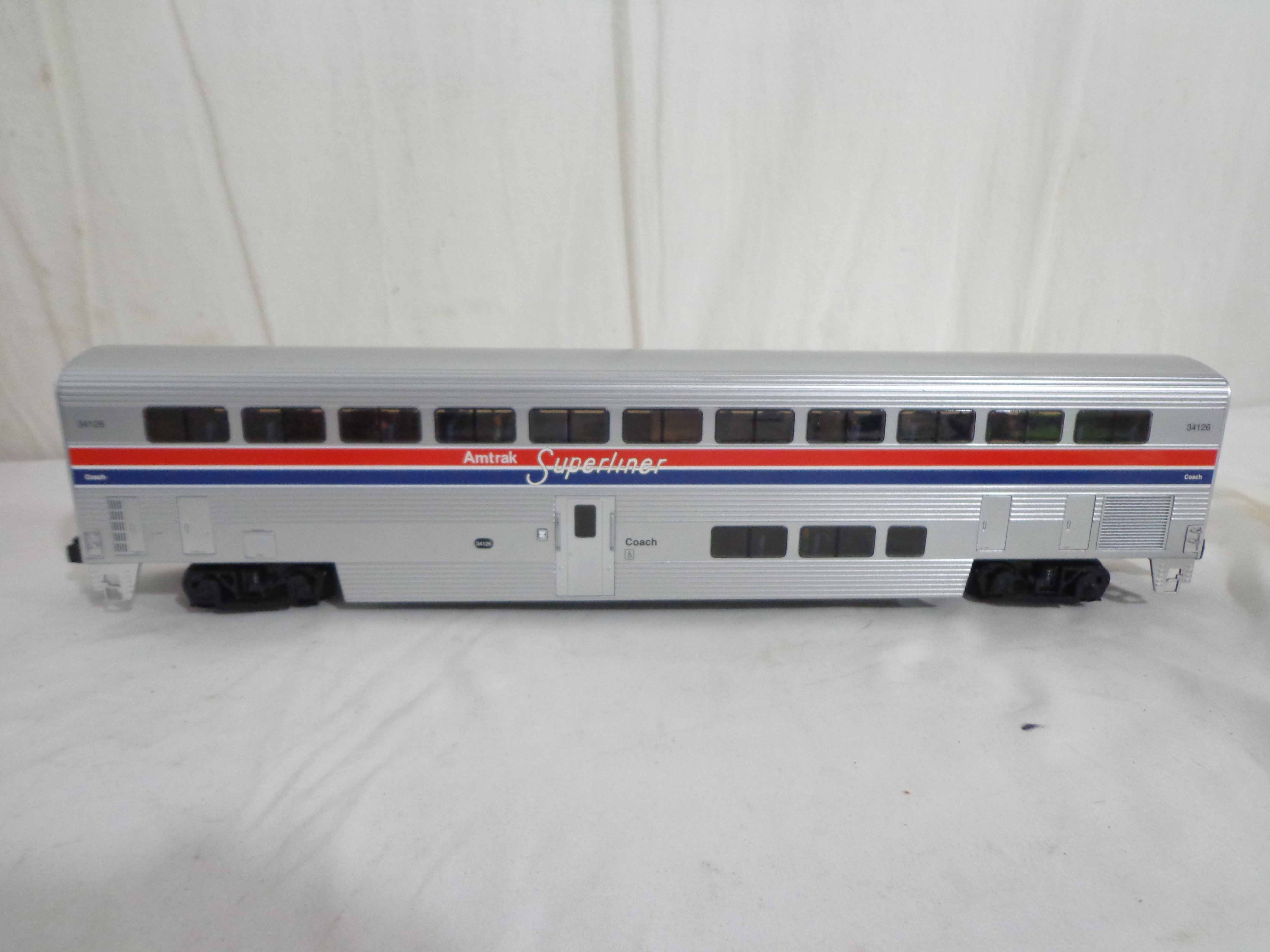 These are the #15351 Amtrak Superliner Lounge Cafe and #34126 Amtrak Superliner Coach that Lionel made a few years ago. Our Opinion is that they are generally in Like New Minus or Better Condition. One Original Box. Examine closely; what is pictured is what you will receive. Please add $35.00 for US-48 Shipping and Insurance (more west of the Mississippi).