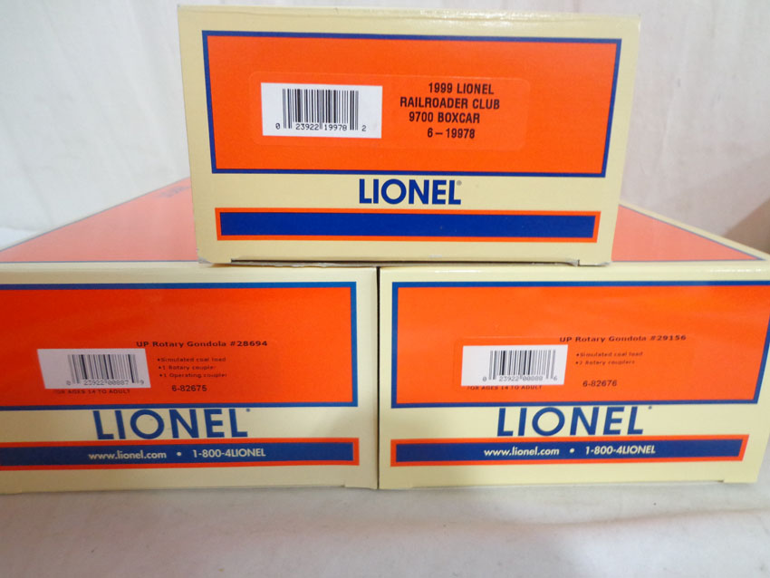 Mint Lionel #39211 6464 Archive Box Cars Set of 3, #27283 Postwar Box Cars Set of 2, #82674 Union Pacific Rotary Gondolas Set of 2 and #19978 Railroader Club Box Car/OBs