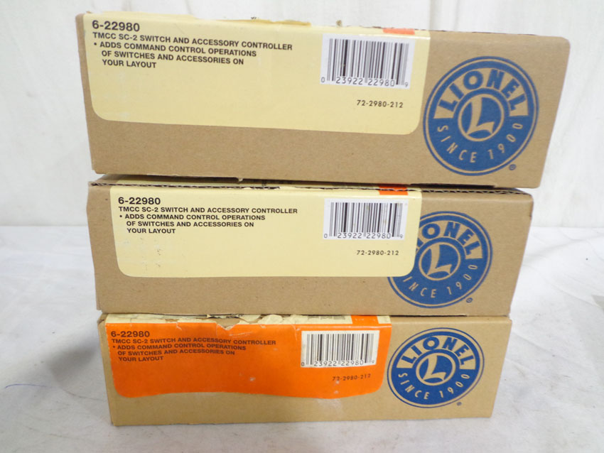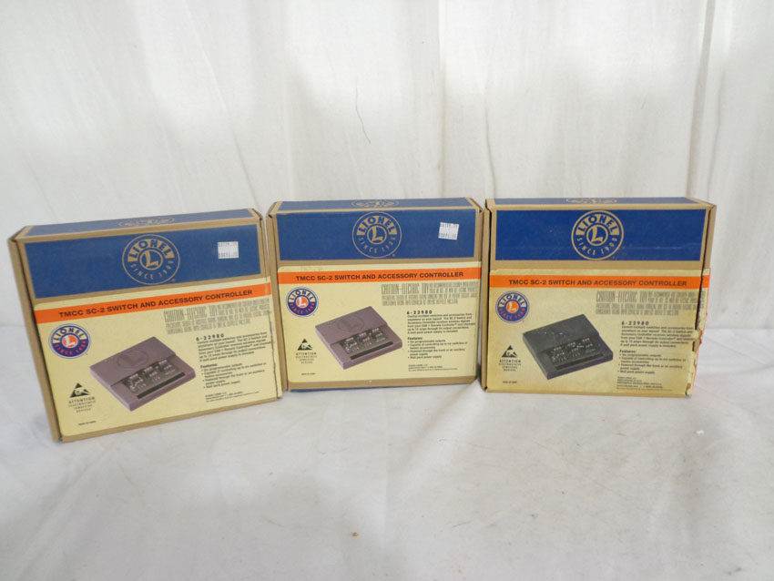 These are three #22980 TMCC SC-2 Switch and Accessory Controllers that Lionel made a few years ago. Our Opinion is that they are generally in Like New Condition. Original Boxes. All Original in our Opinion. Please add $30.00 for US-48 Shipping and Insurance (more west of the Mississippi).