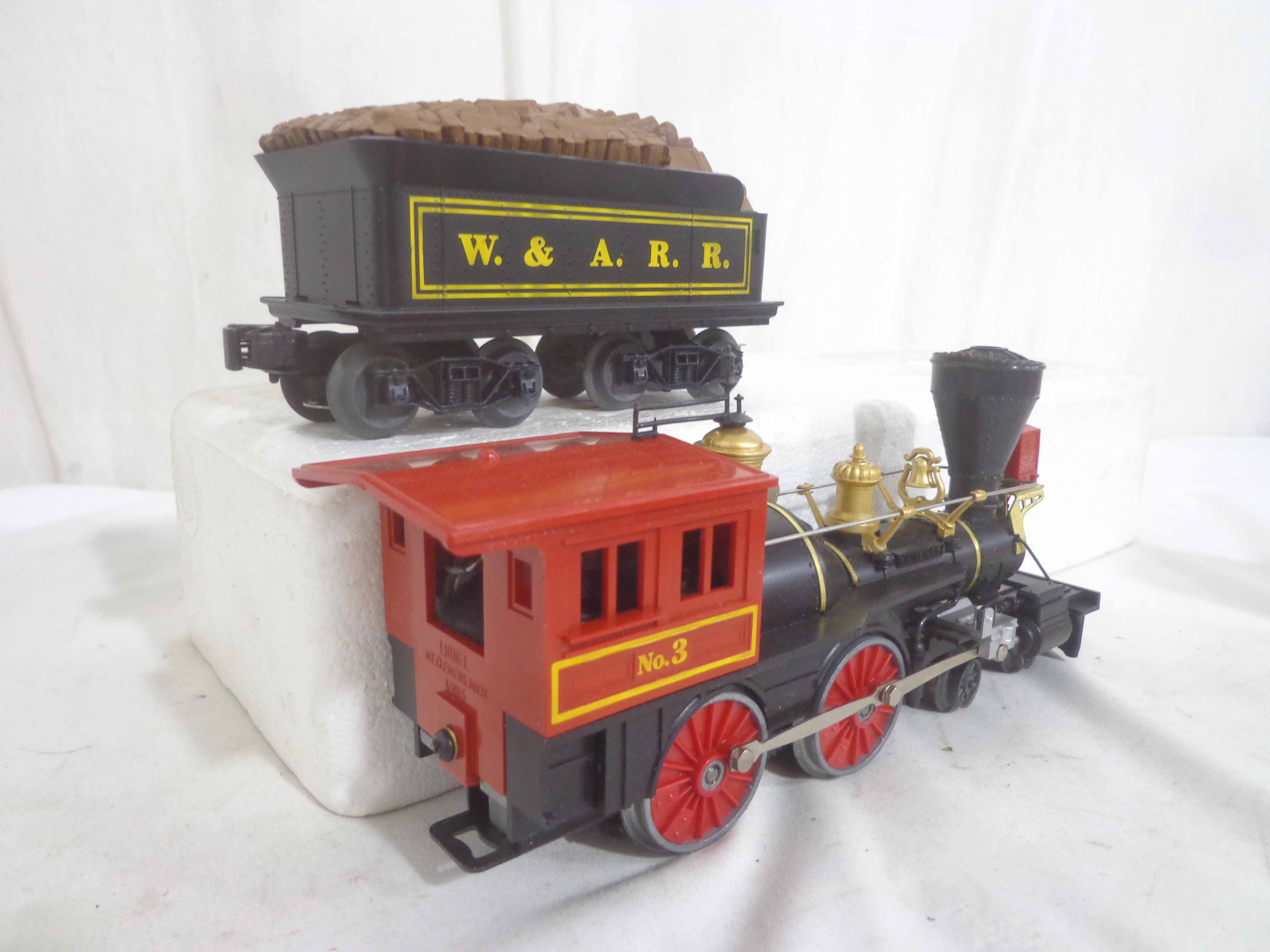These are #3 Western and Atlantic 4-4-0 Engine and Tender, #9551/9552 W&A Passenger Cars and #9553 W&A Flat Car with Horses that Lionel made in the 1970s. No Boxes. Examine closely; what is pictured is what you will receive. Please add $45.00 for US-48 Shipping and Insurance (more west of the Mississippi). |