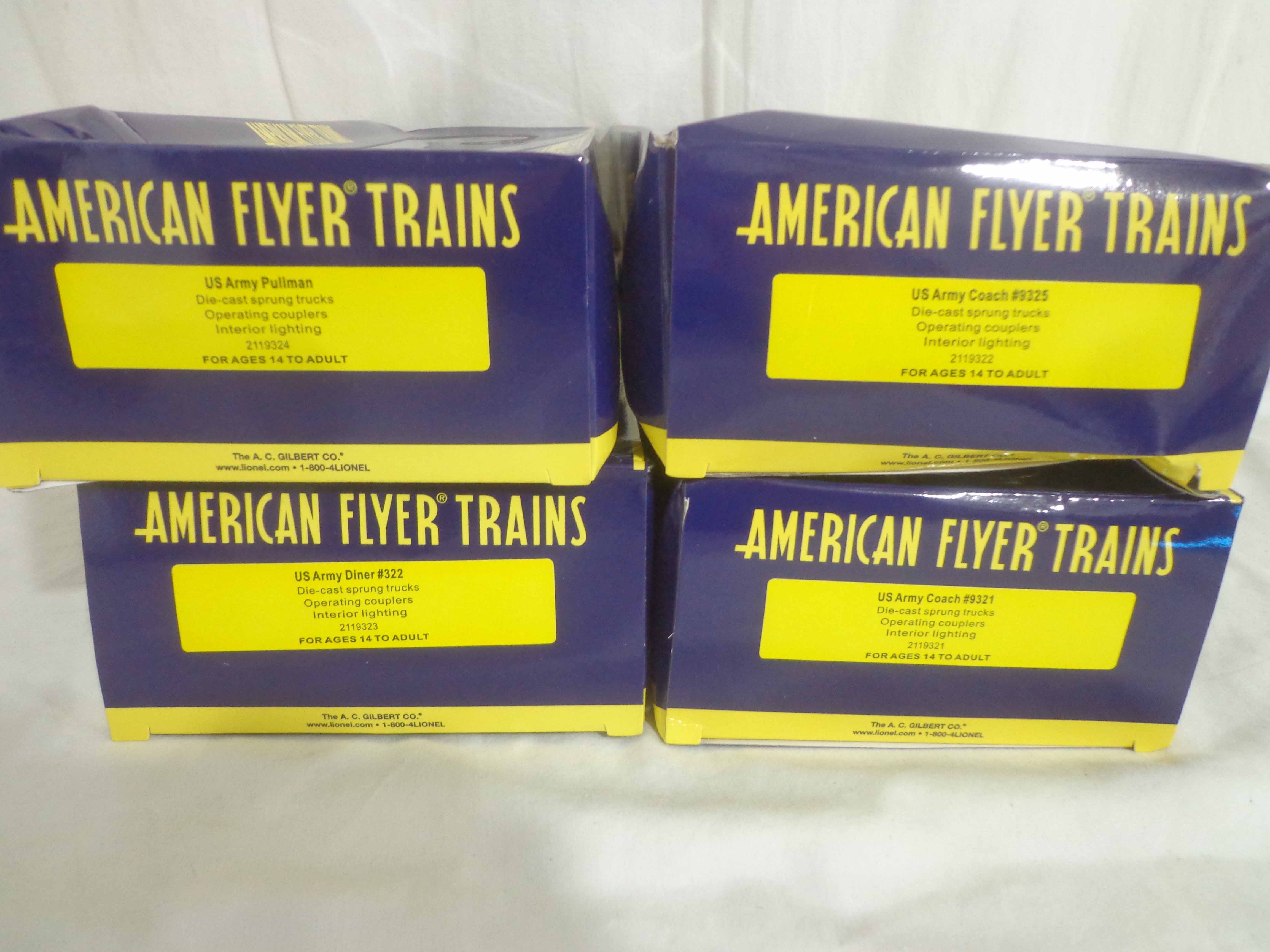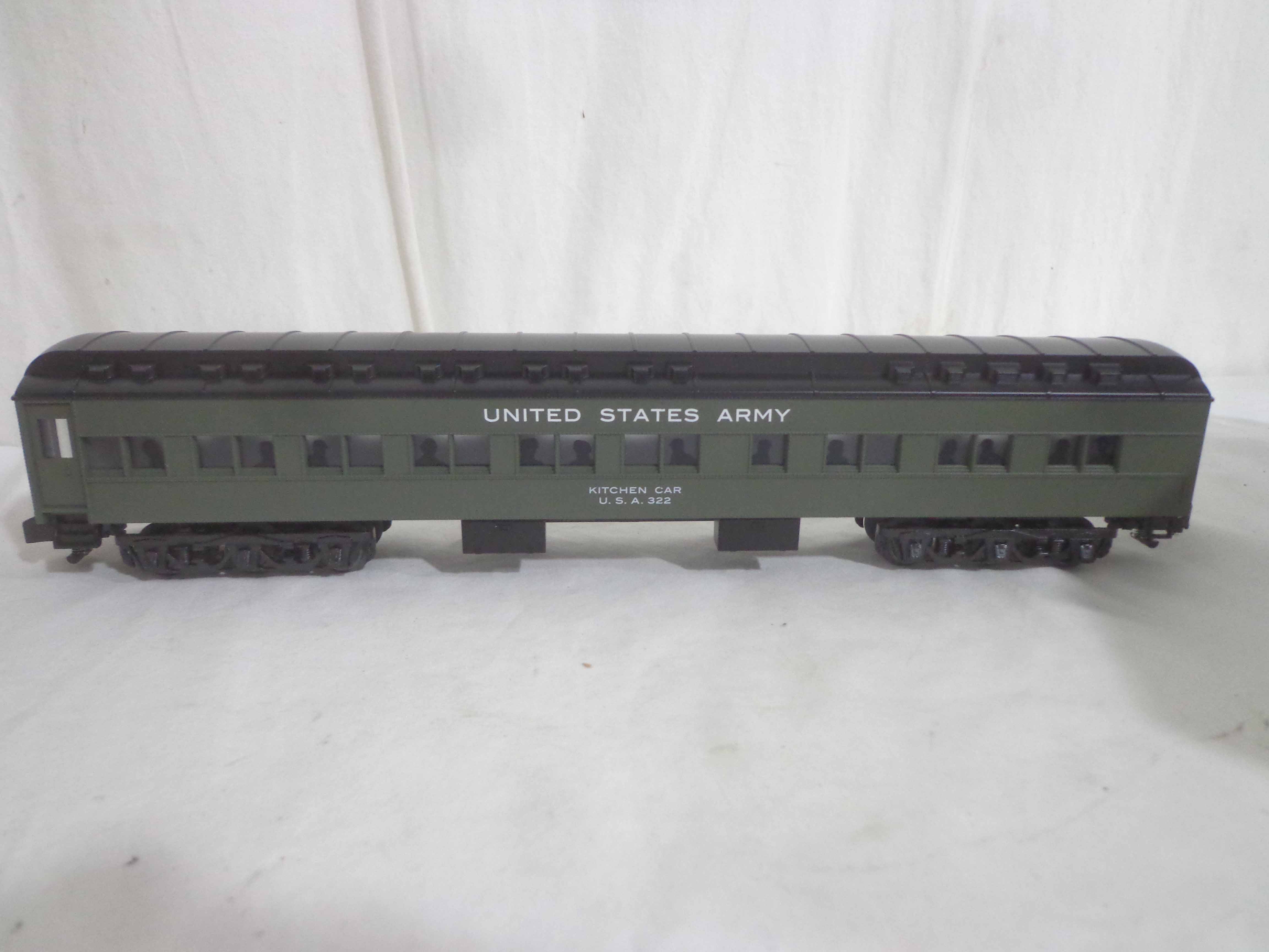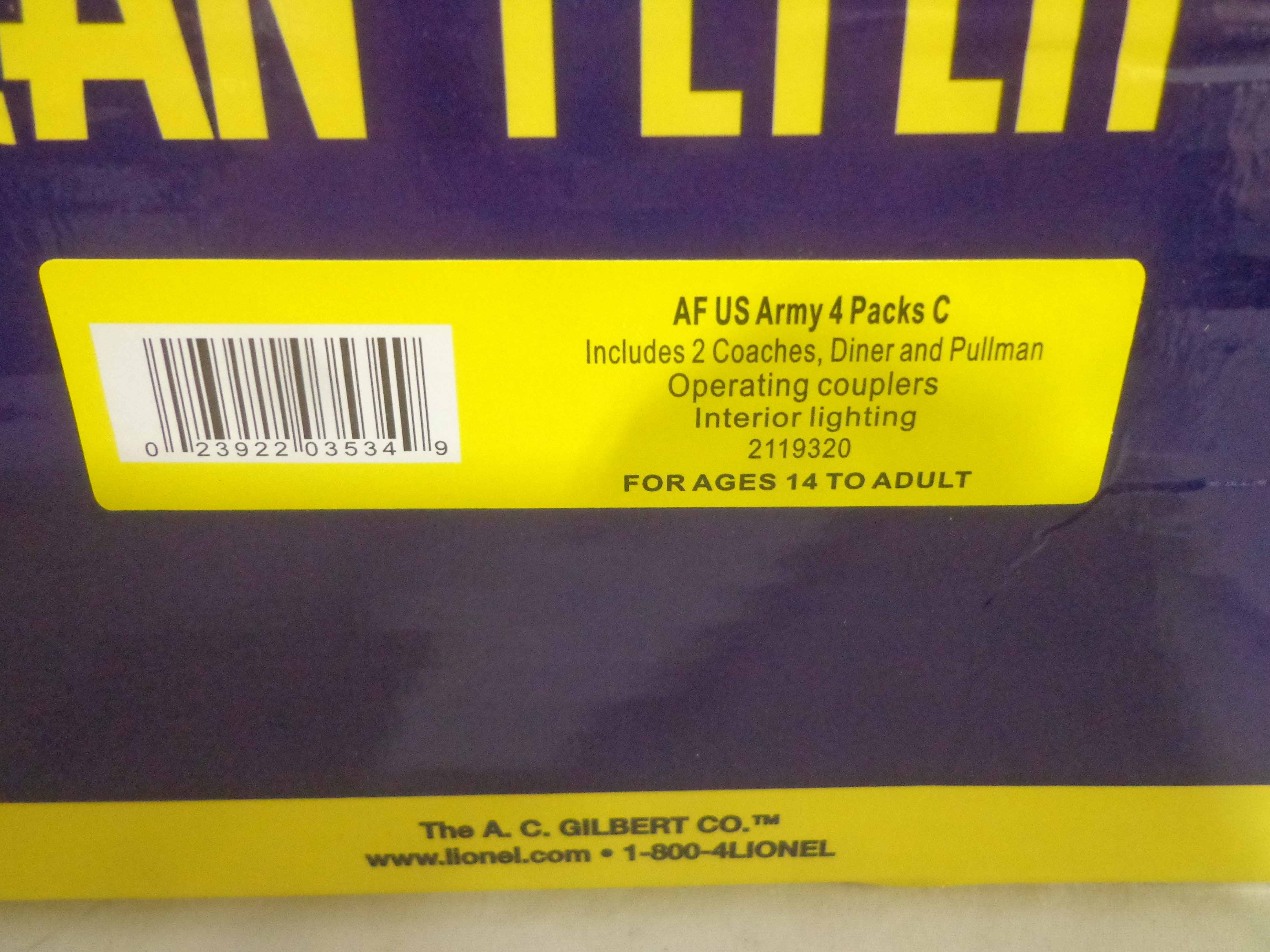 This is the #2119320 US Army Passenger Cars Set of 4 that Lionel/AF made is S Gauge. Original Boxes. Examine closely; what is pictured is what you will receive. Please add $35.00 for US-48 Shipping and Insurance (more west of the Mississippi).