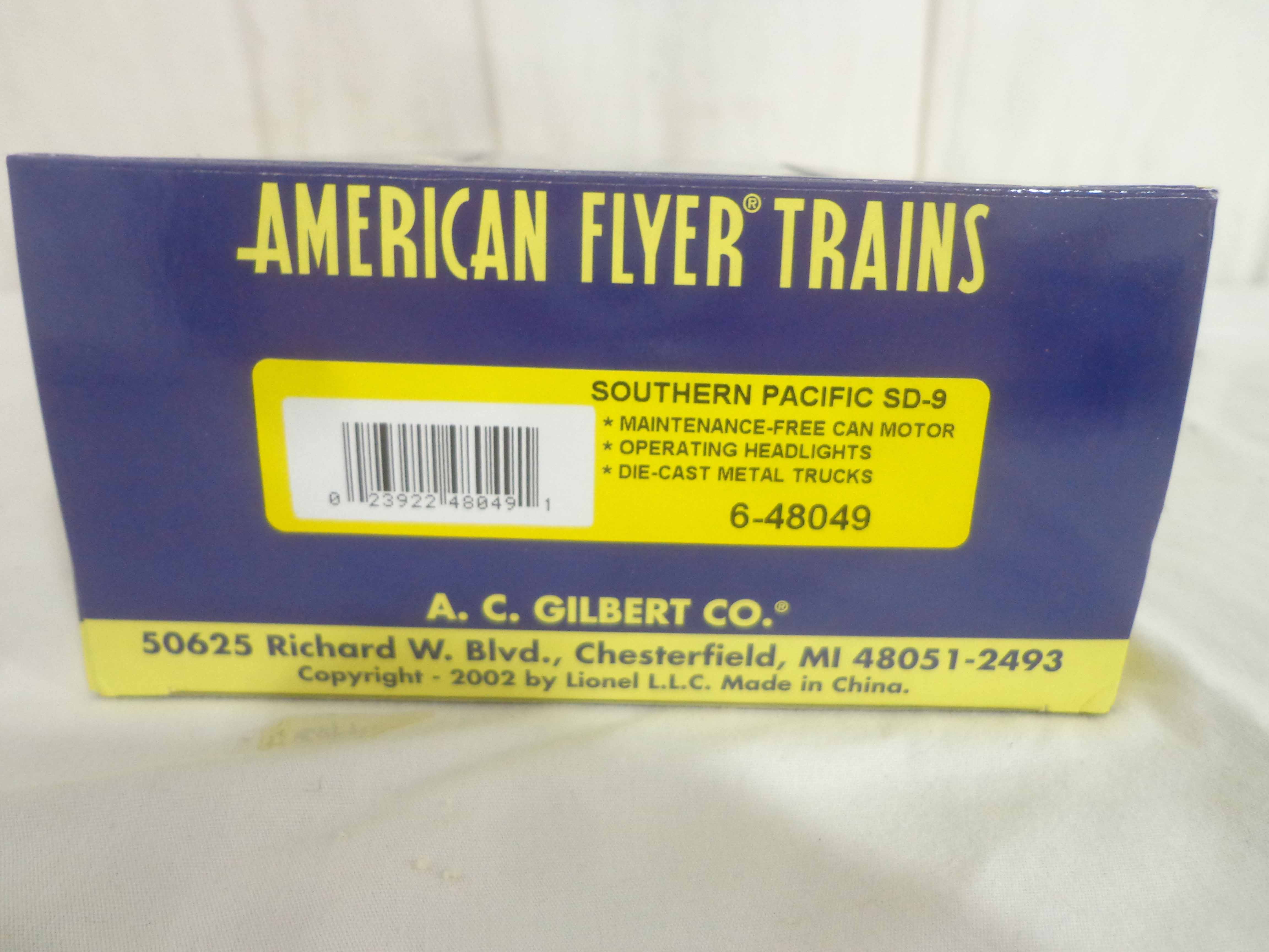 This is the #48049 Southern Pacific SD-9 Locomotive that Lionel made a few years ago in its American Flyer S Gauge Line. Original Box. Examine closely; what is pictured is what you will receive. All Original in our Opinion. Please add $30.00 for US-48 Shipping and Insurance (more west of the Mississippi).