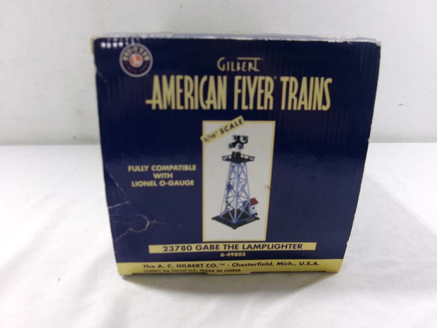This is the American Flyer-Lionel S Gauge #23780 Gabe The Lamplighter Operating Floodlight Tower that was recently made as a copy of the 1950s Accessory. Original Box. Examine closely; what is pictured is what you will receive. Please add $35.00 for US-48 Shipping and Insurance (more west of the Mississippi).