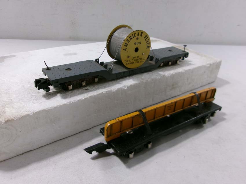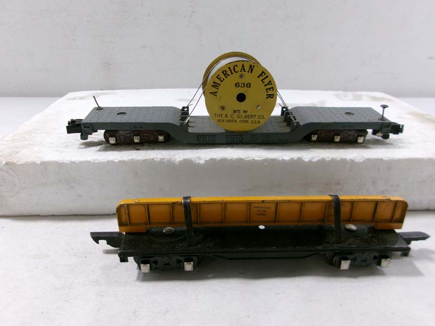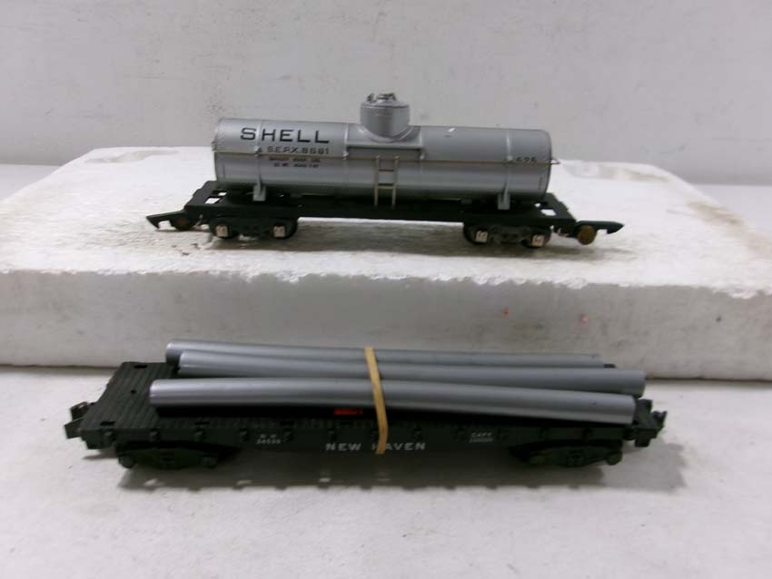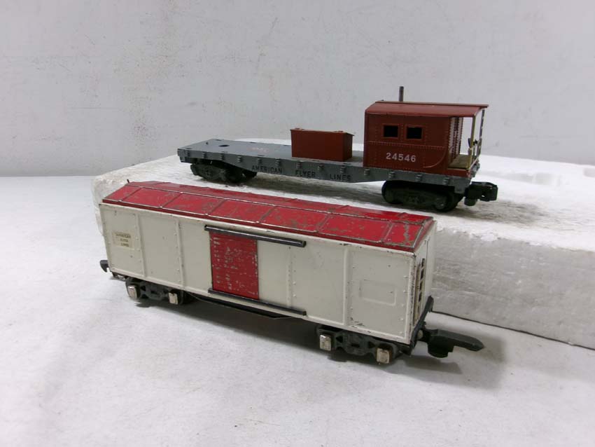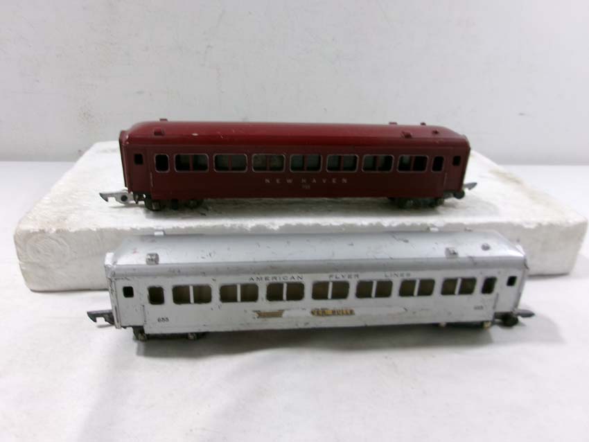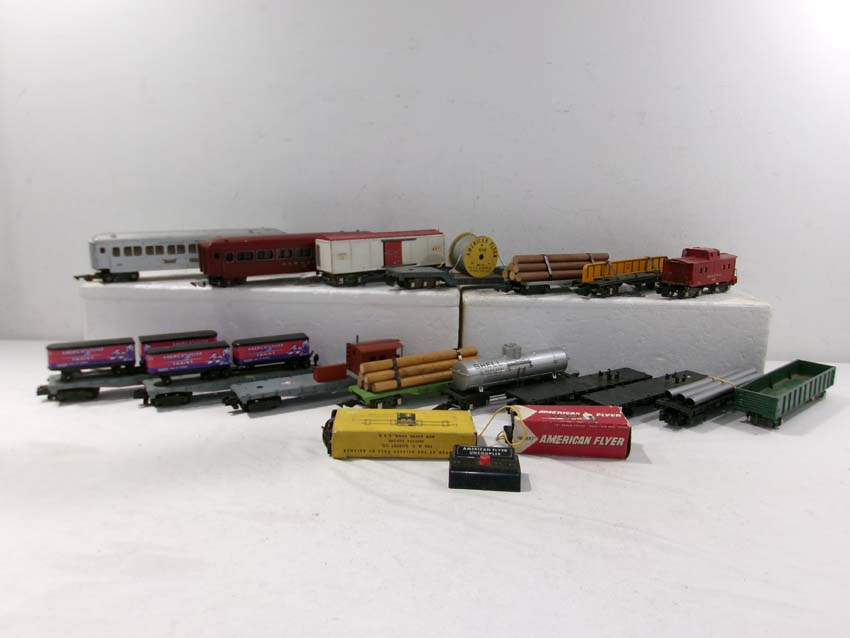 These are the American Flyer S Gauge #735 NH Operating Coach, #655 Silver Bullet Coach, fourteen Assorted Freight Cars (24550s), and two Uncouplers. Two Original Boxes. Examine very closely; what is pictured is what you will receive. Please add $50.00 for US-48 Shipping and Insurance (more west of the Mississippi).