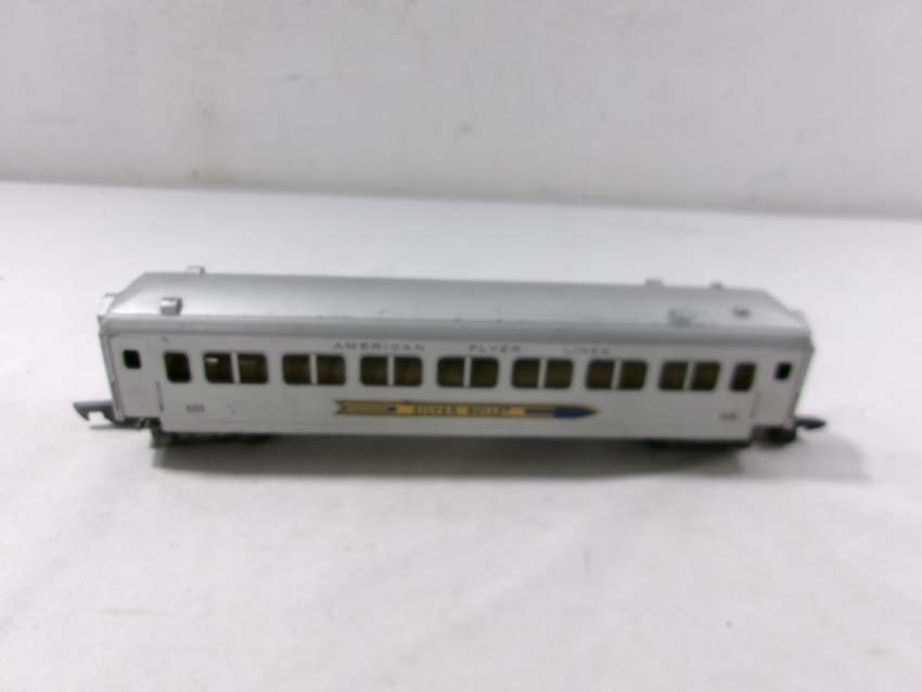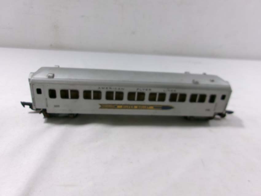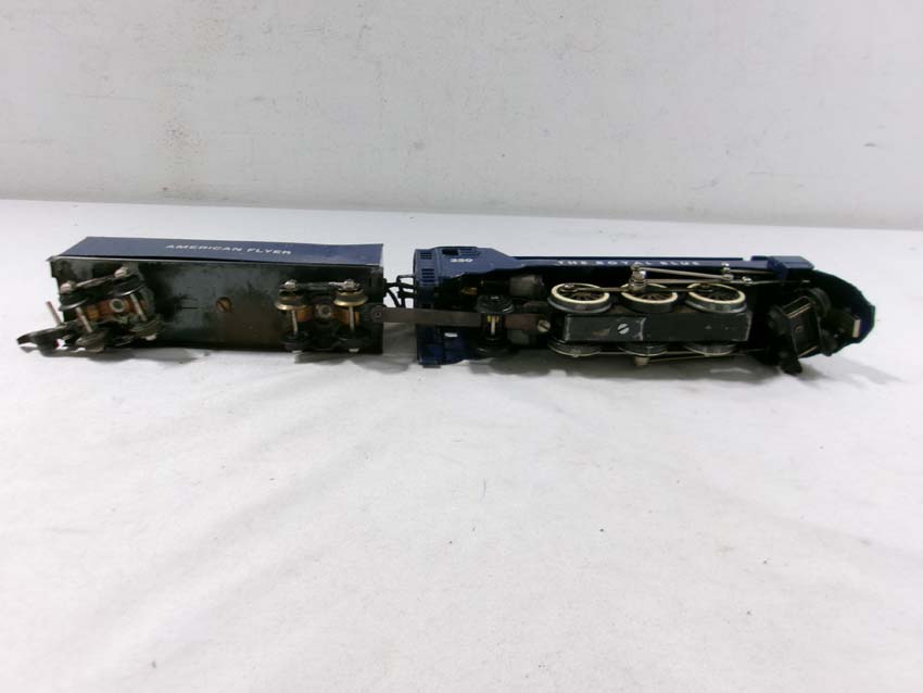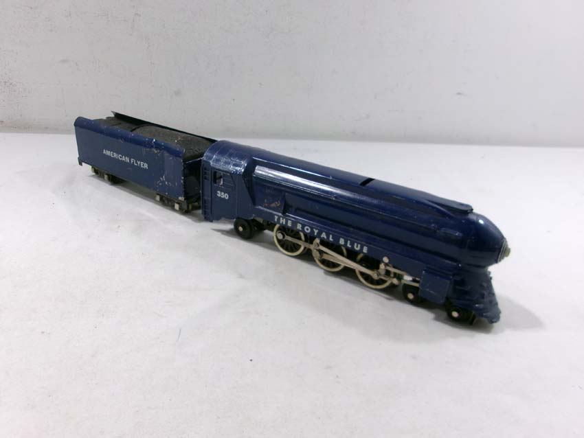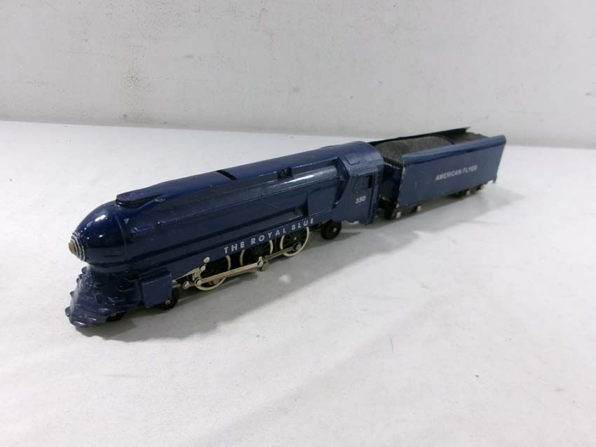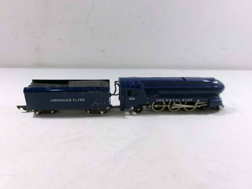 These are the American Flyer S Gauge #350 Royal Blue 4-6-2 Steam Engine & Tender, #356 Silver Bullet 4-6-2 Steam Engine & Tender and two #655 Silver Bullet Coaches. No Boxes. Examine closely; what is pictured is what you will receive. Please add $50.00 for US-48 Shipping and Insurance (more west of the Mississippi).