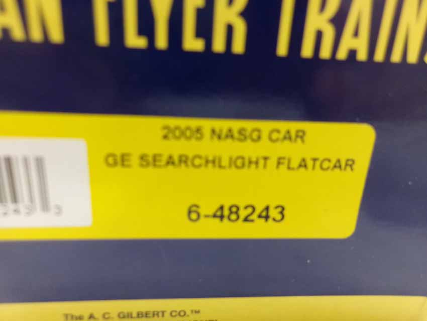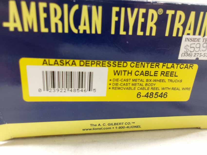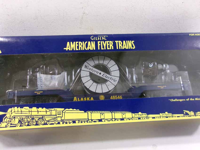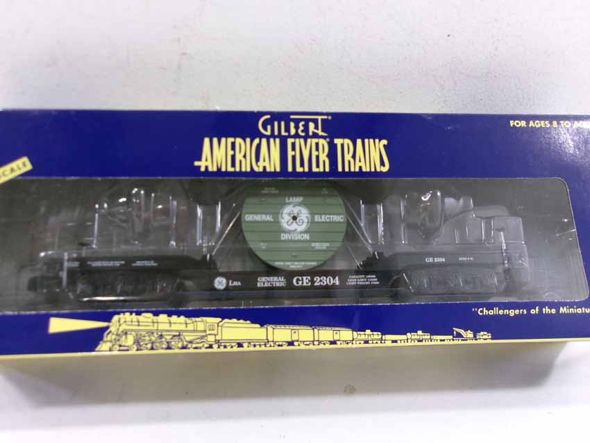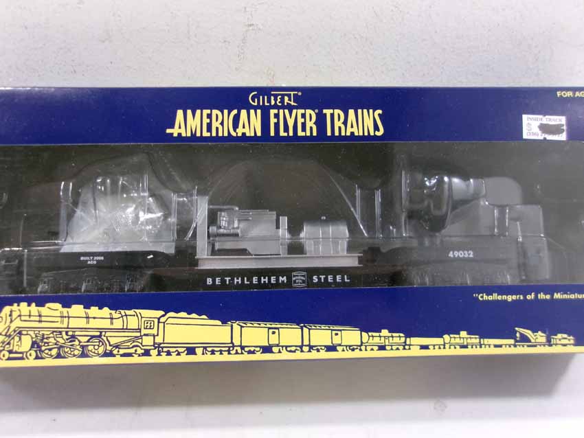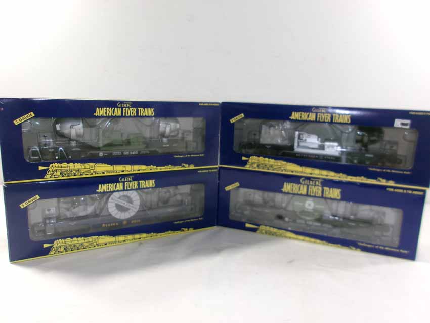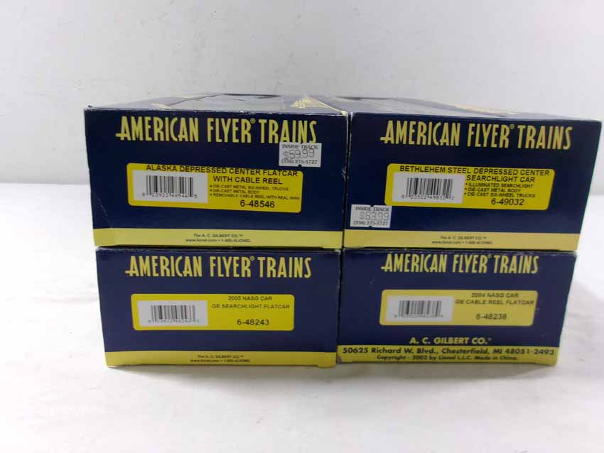 These are the Lionel/American Flyer S Gauge #48243 GE Searchlight Car, #48546 Alaska Flat Car w/Cable Reel, #49032 Bethlehem Steel Searchlight Car and #48238 GE Flat Car w/Cable Reel. Original Boxes. All Original in our Opinion. Please add $35.00 for US-48 Shipping and Insurance (more west of the Mississippi).