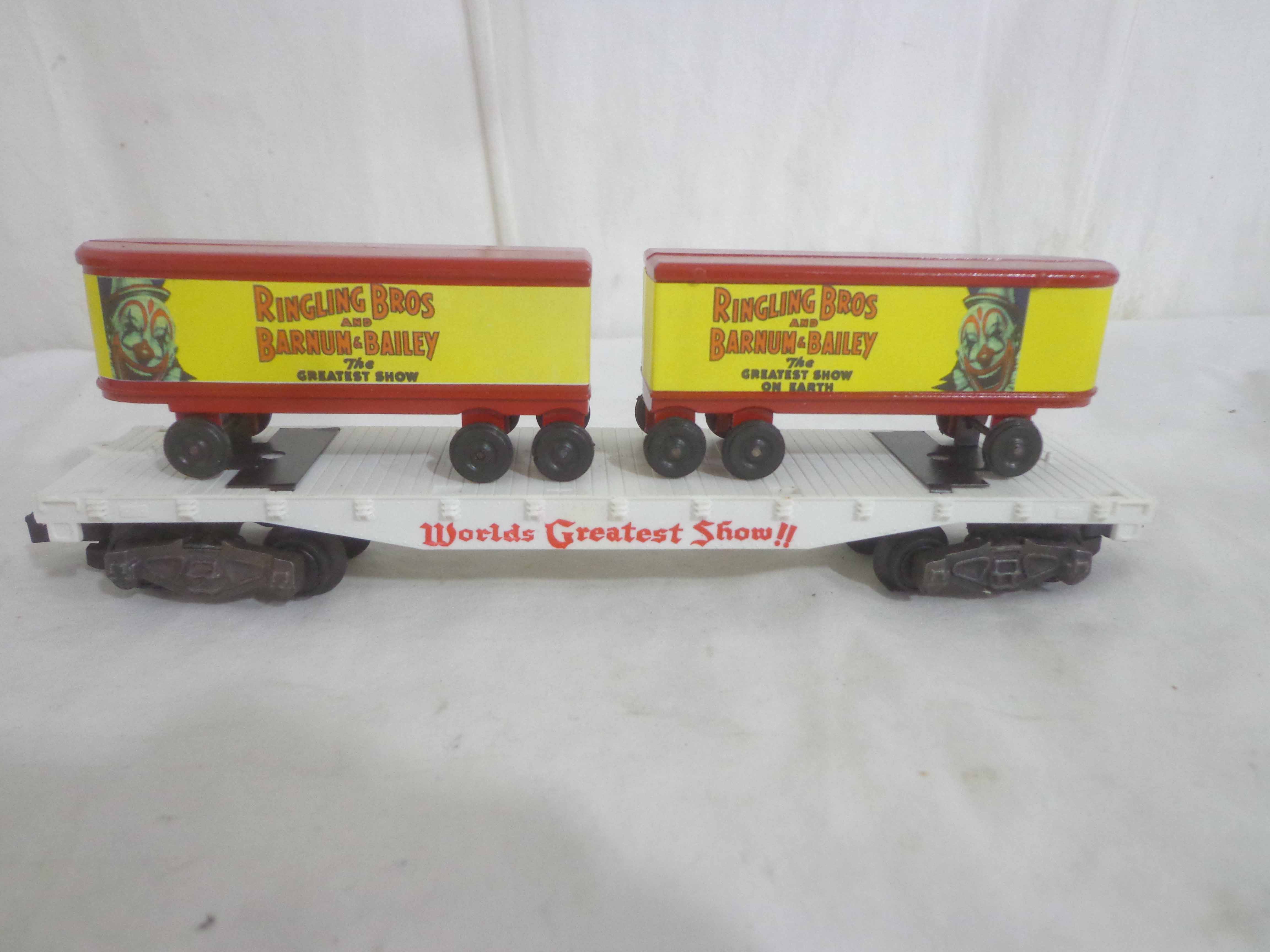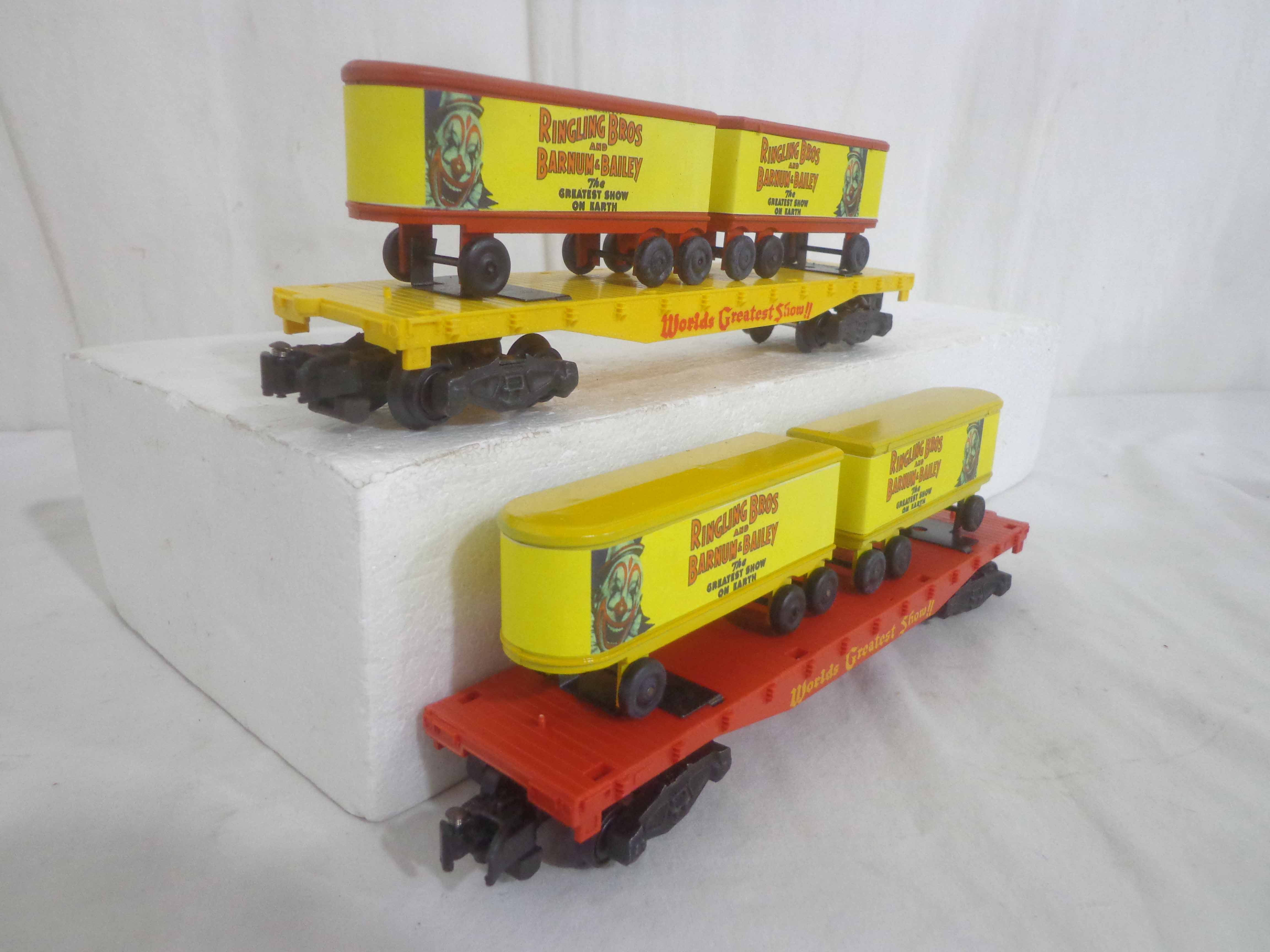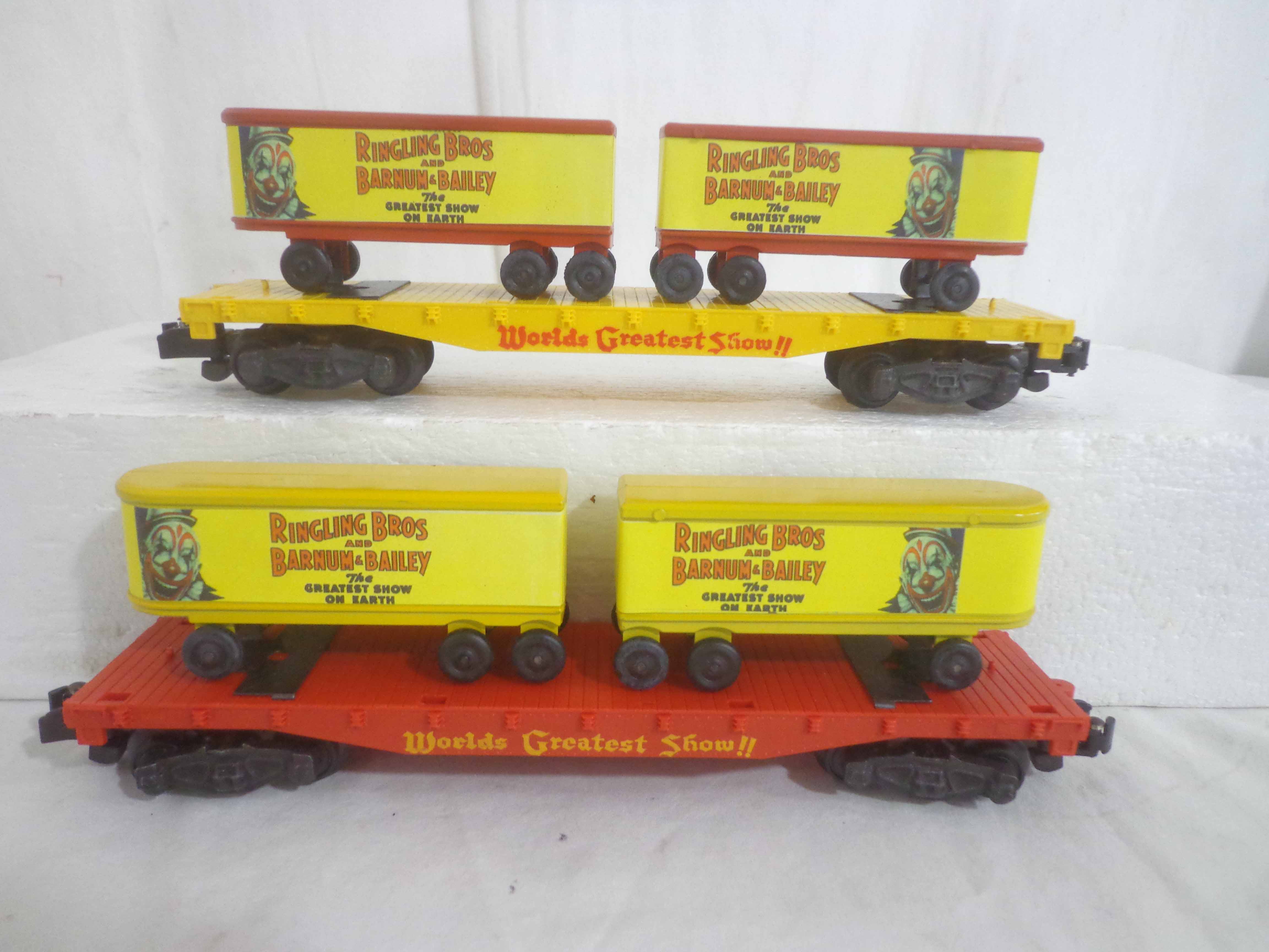 These are three AF S Gauge Ringling Bros and Barnum & Bailey Flat Cars with Trailers (reproductions). No Boxes. Examine closely; what is pictured is what you will receive. Please add $35.00 for US-48 Shipping and Insurance (more west of the Mississippi).