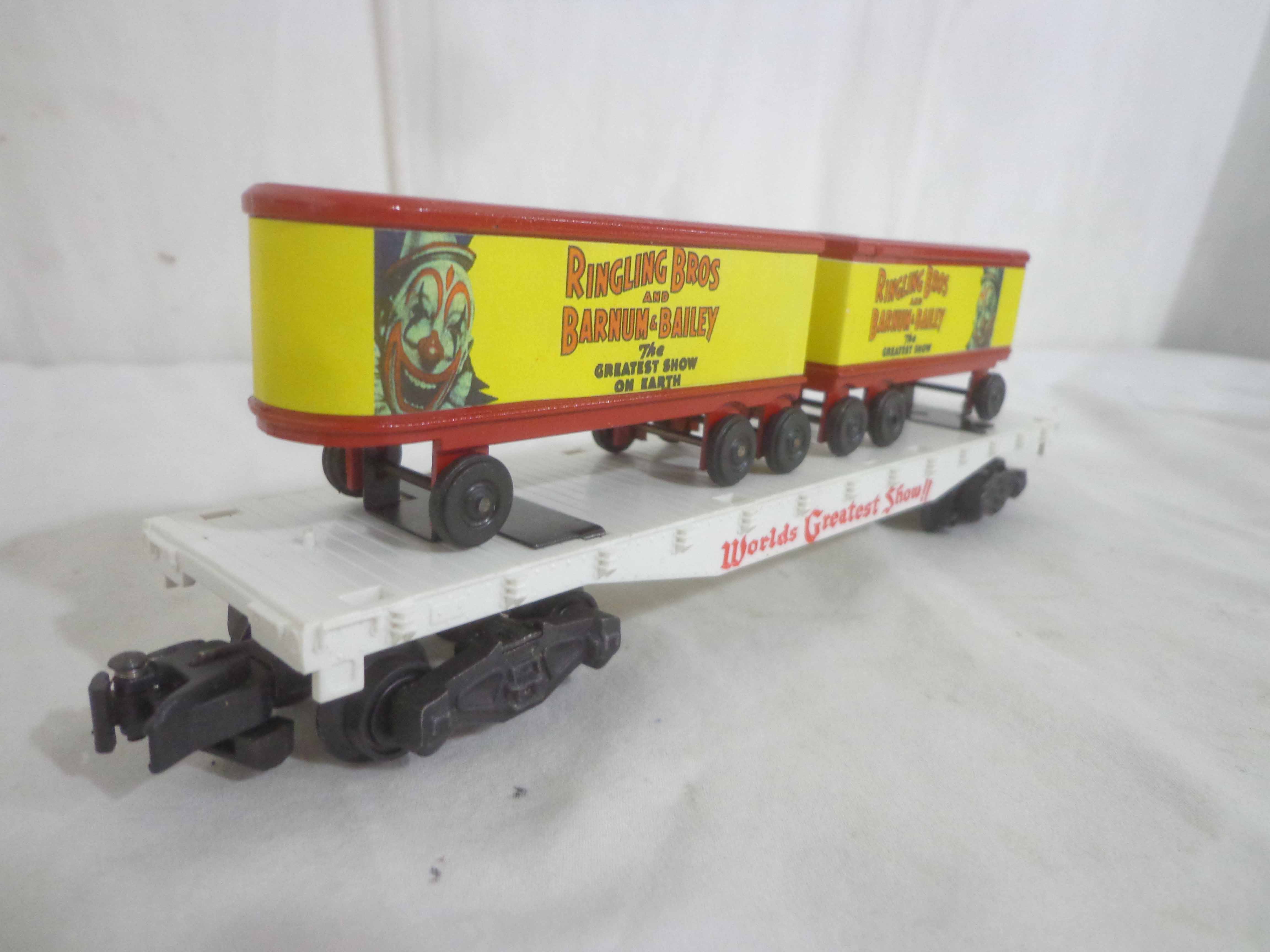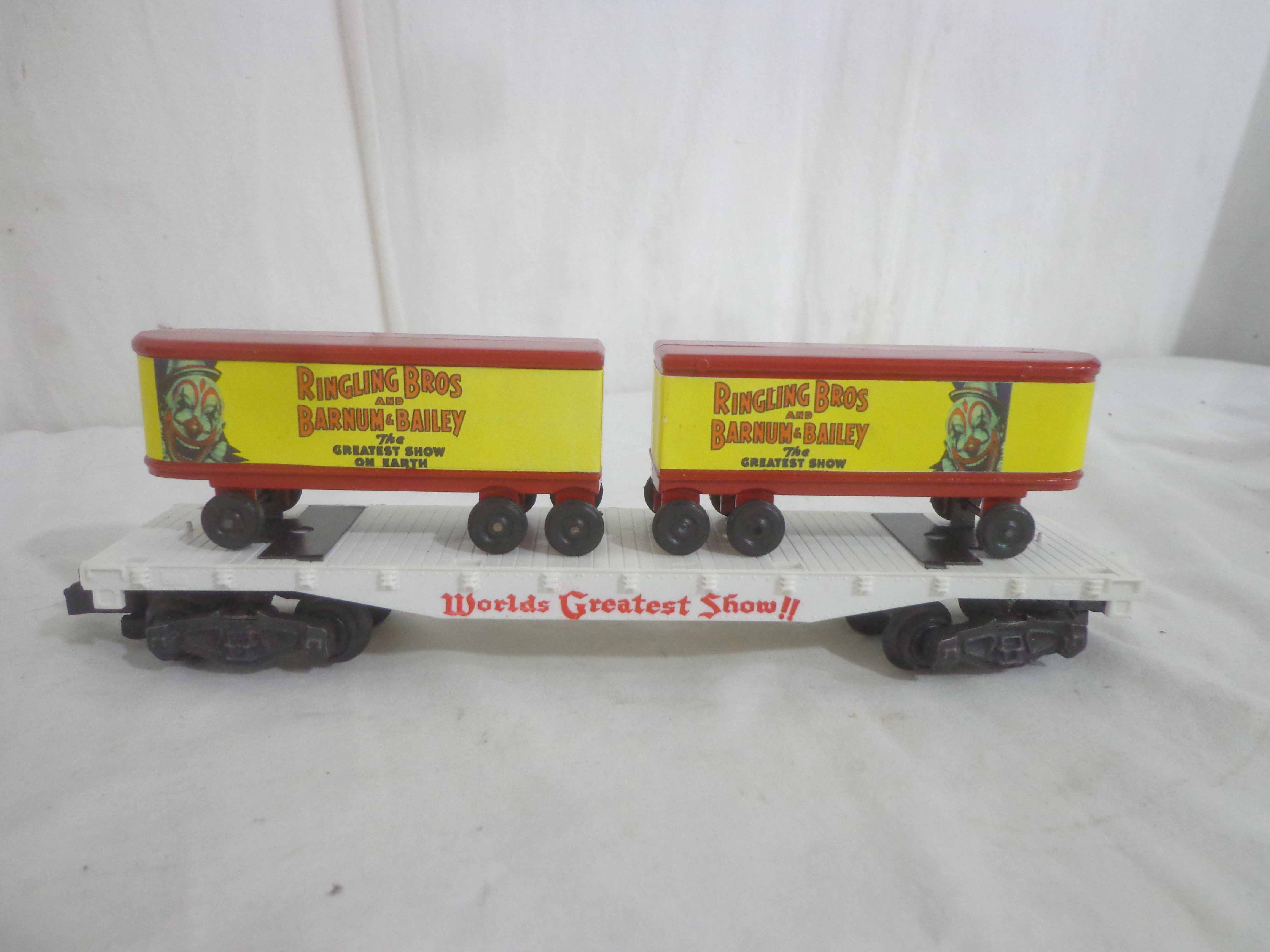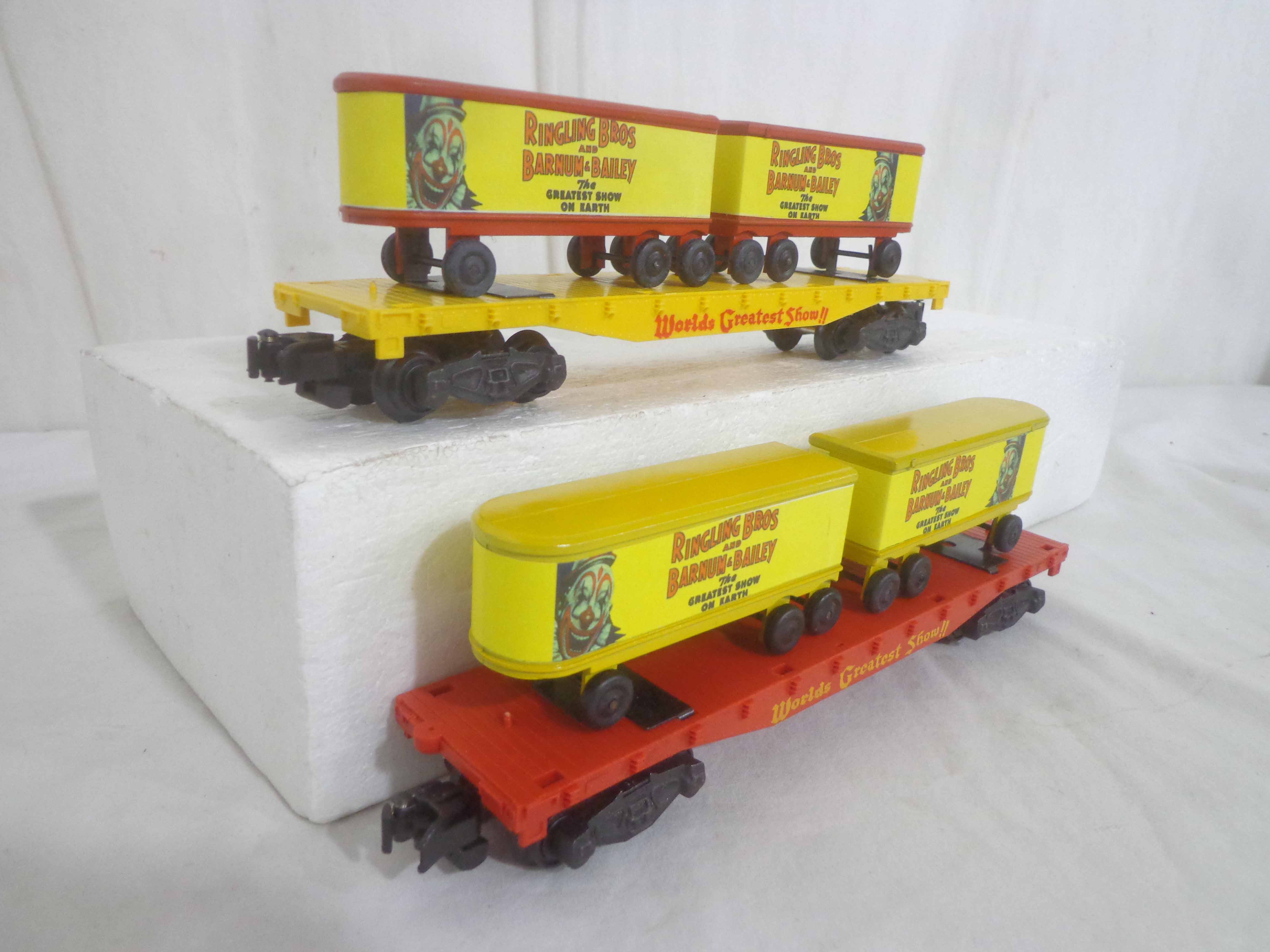 These are three AF S Gauge Ringling Bros and Barnum & Bailey Flat Cars with Trailers (reproductions). No Boxes. Examine closely; what is pictured is what you will receive. Please add $35.00 for US-48 Shipping and Insurance (more west of the Mississippi).