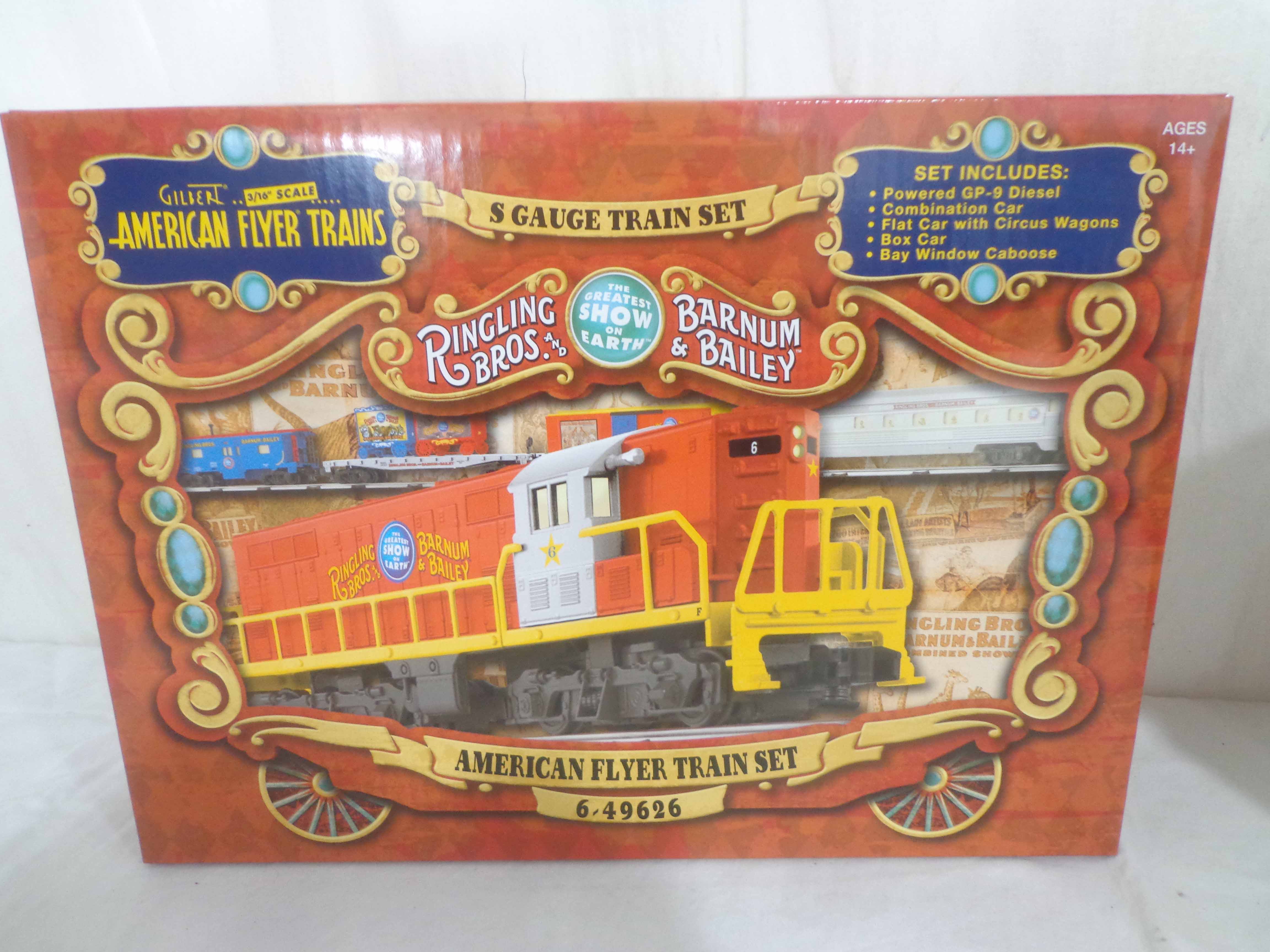 This is the #49626 Ringling Bros and Barnum & Bailey Train Set that AF/Lionel made in S Gauge a few years ago. Original Boxes. Examine closely; what is pictured is what you will receive. Please add $50.00 for US-48 Shipping and Insurance (more west of the Mississippi).