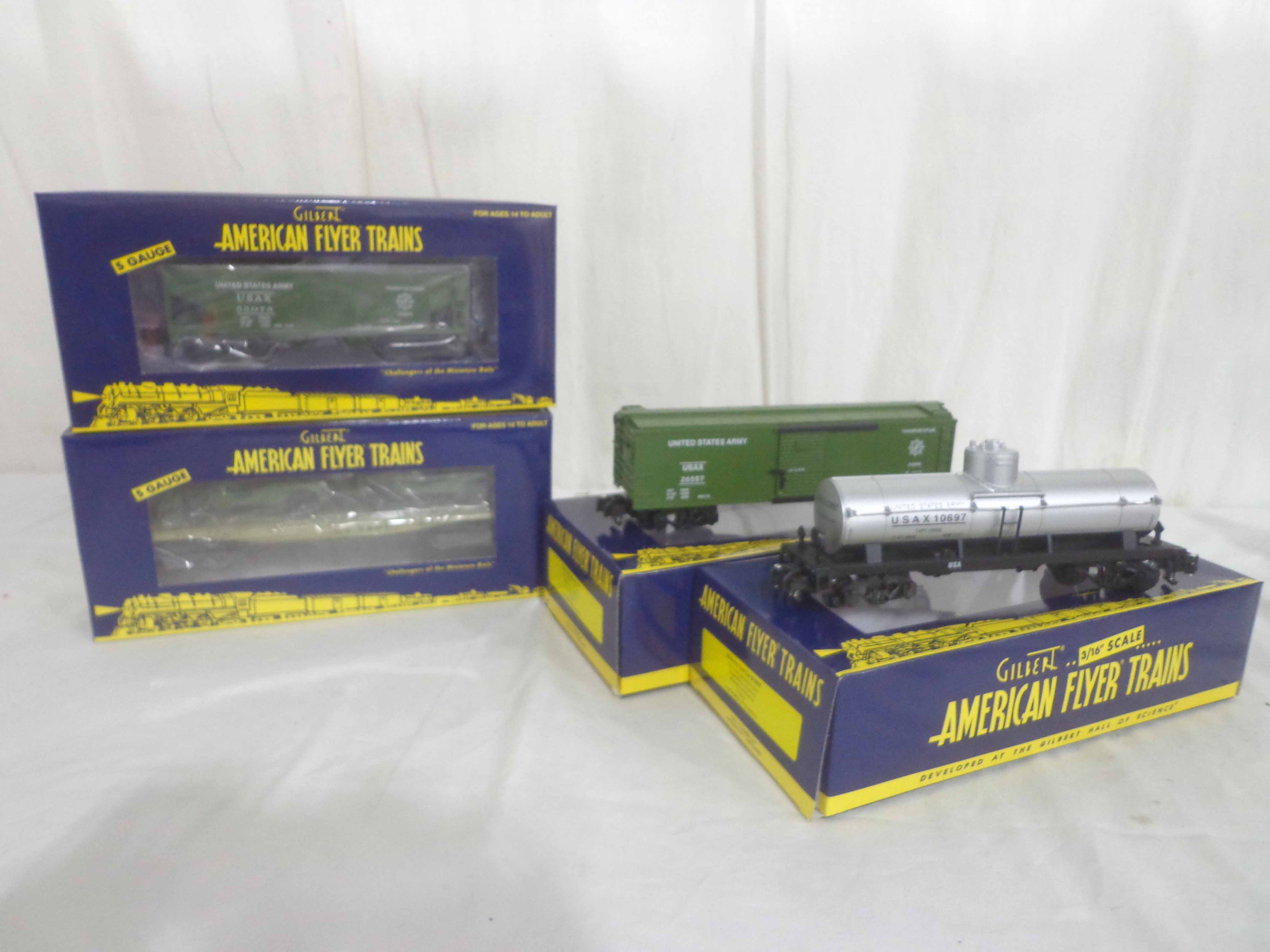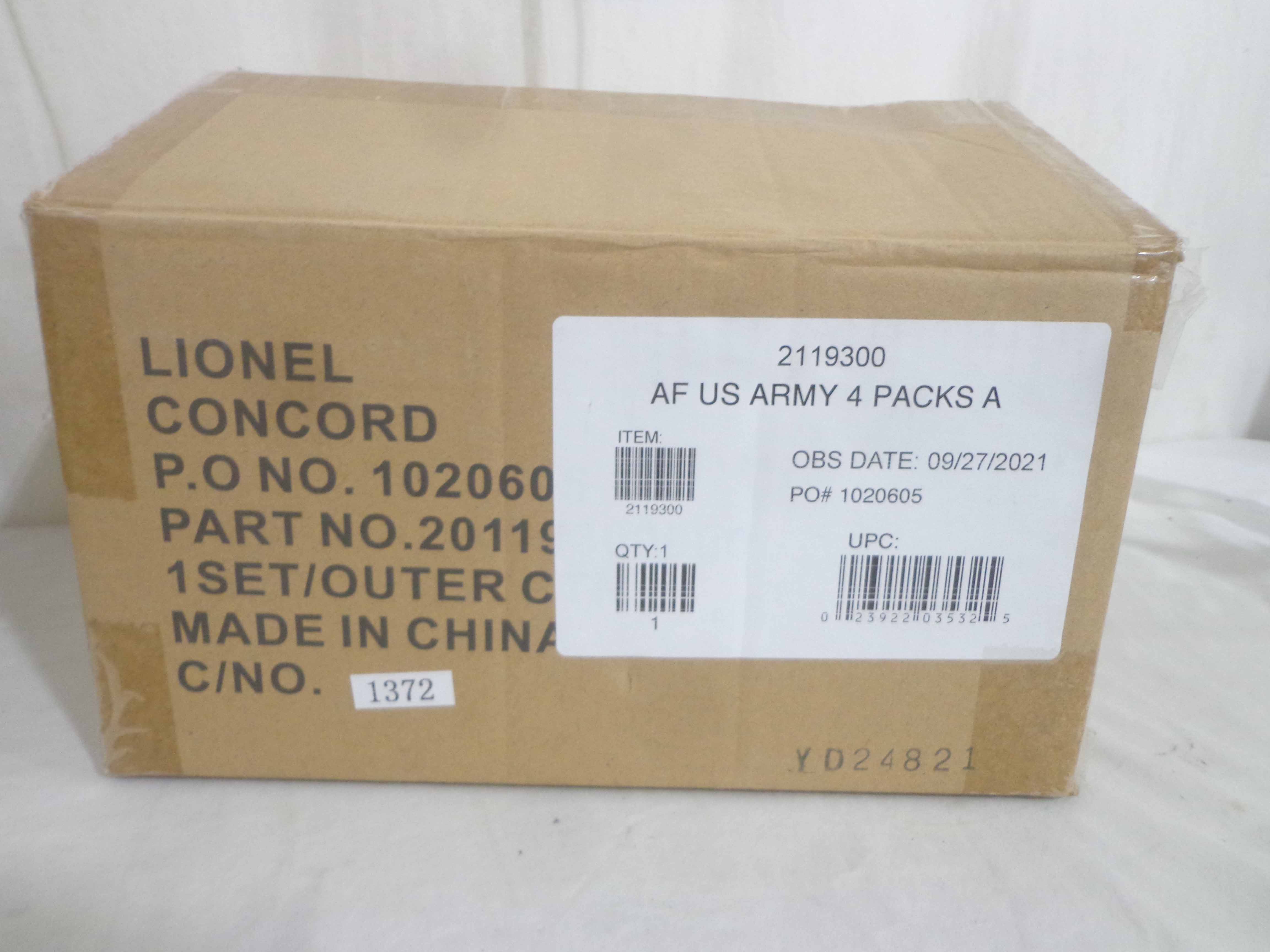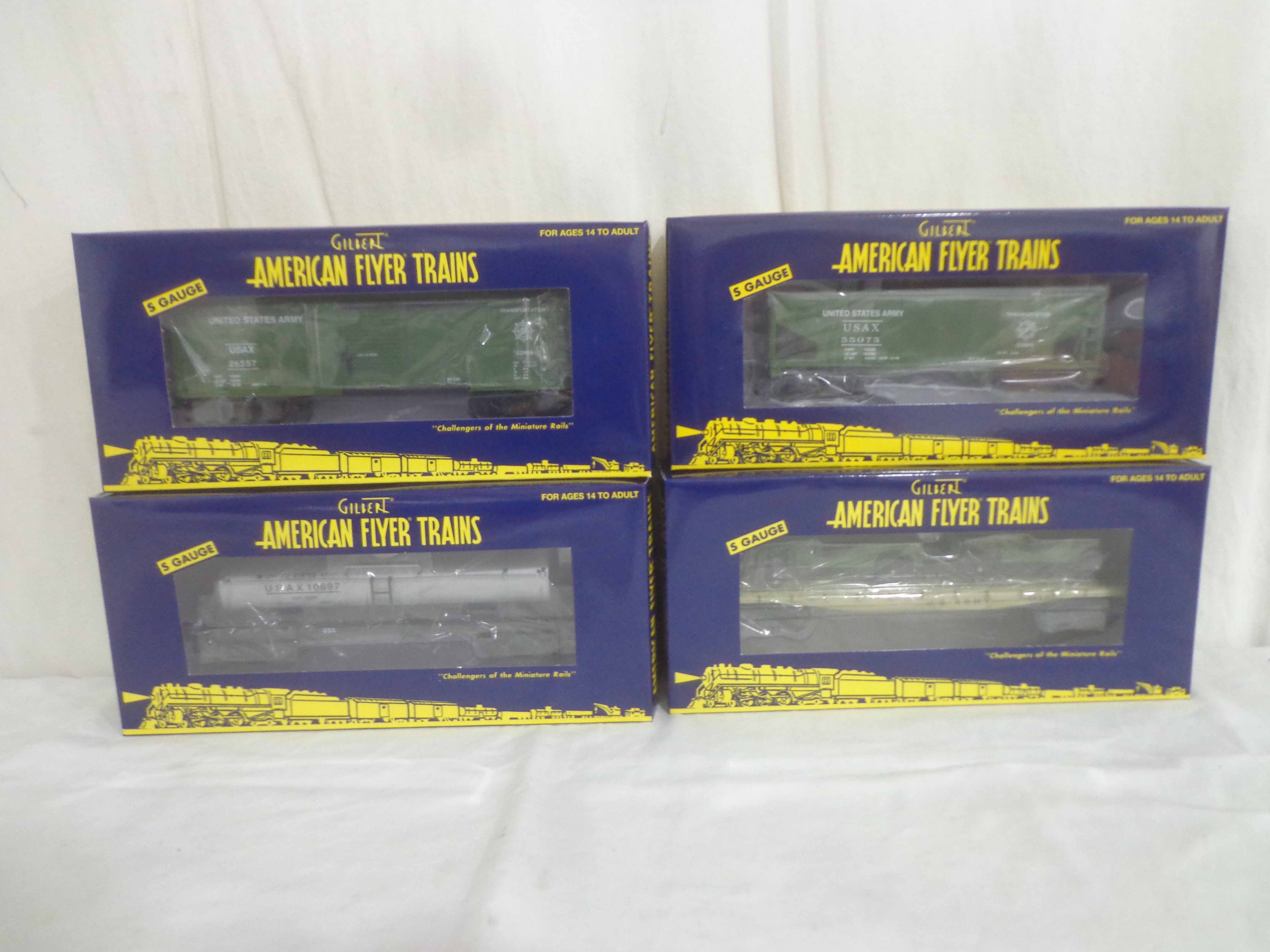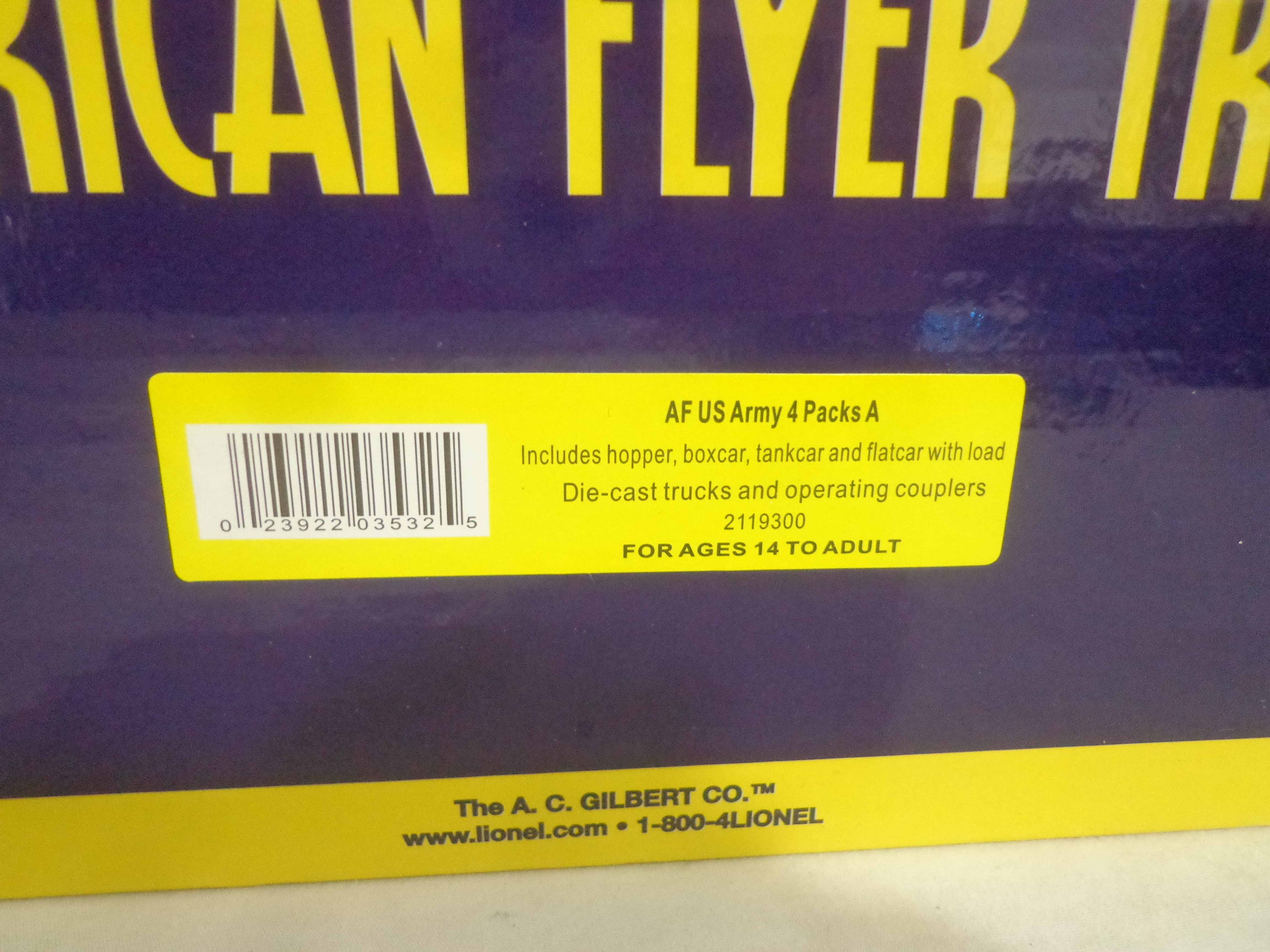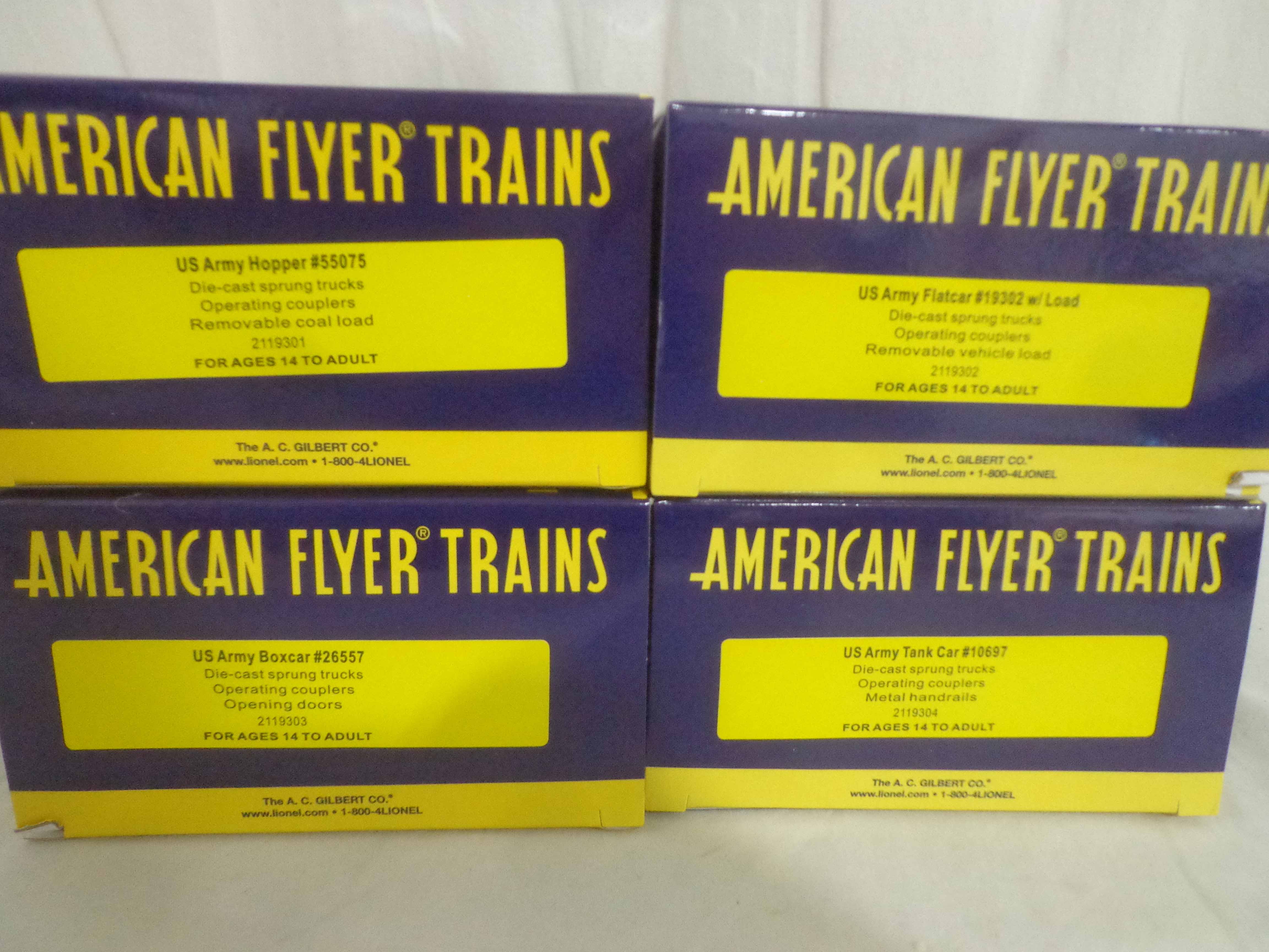 This is the #2119300 US Army Set of 4 Freight Cars that Lionel/AF made is S Gauge. Original Boxes. Examine closely; what is pictured is what you will receive. Please add $35.00 for US-48 Shipping and Insurance (more west of the Mississippi).