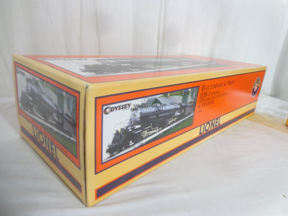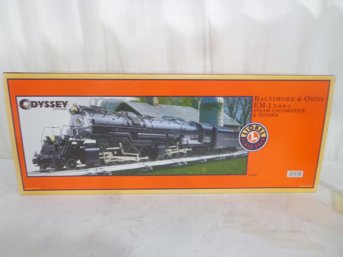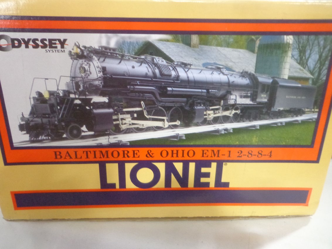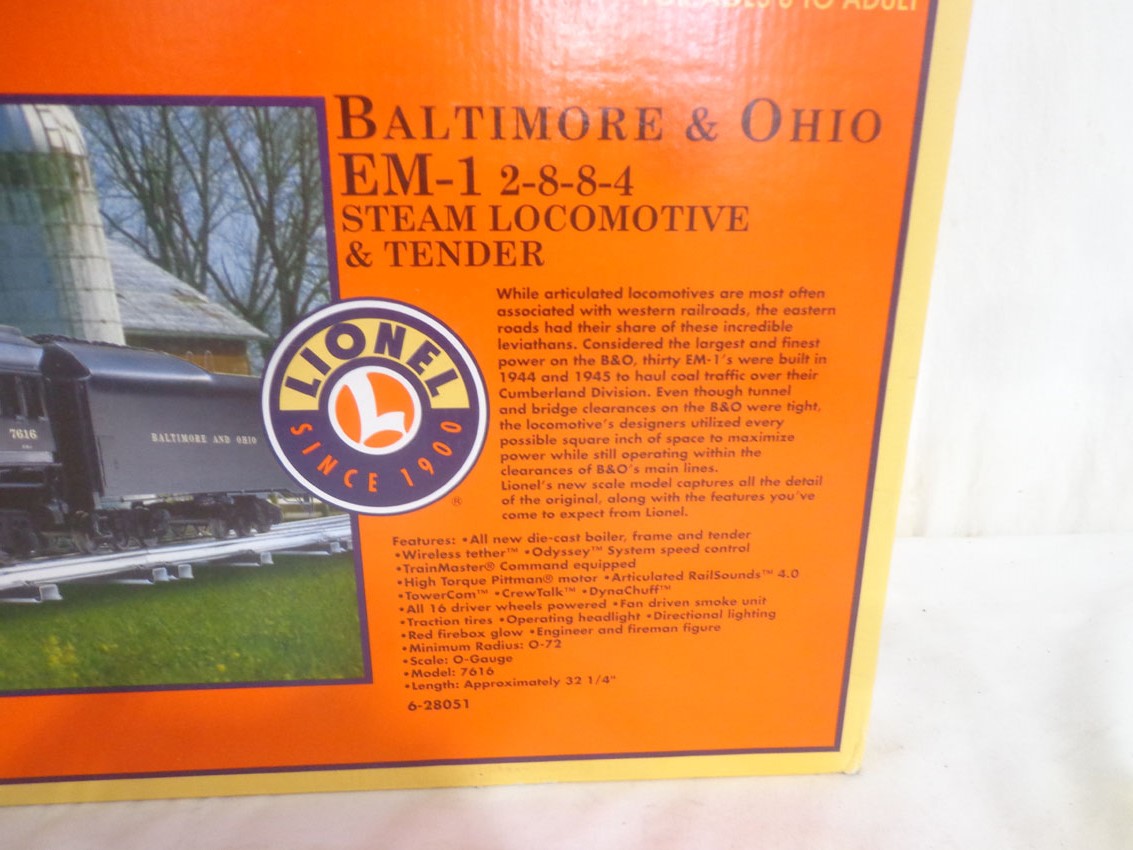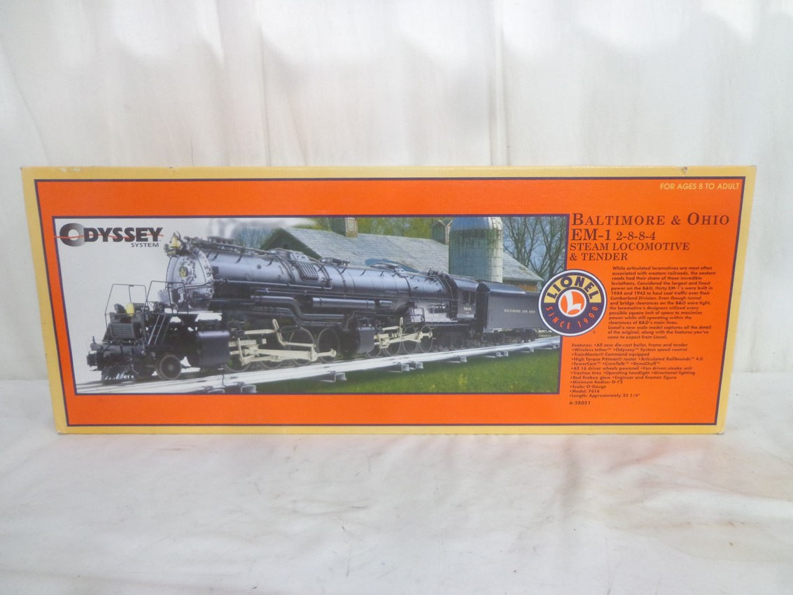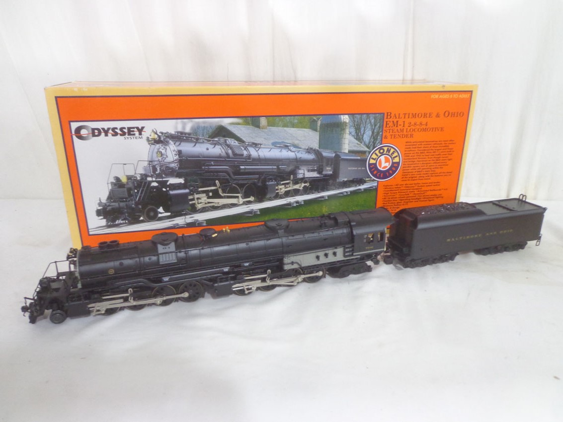 These are the #28051 Baltimore & Ohio EM-1 2-8-8-4 Articulated Diecast Steam Engine and Tender that Lionel made a few years ago. Features Trainmaster Train Control, Railsounds, Electrcoupler, the Odyssey System, Fan-Driven Smoke Unit, CrewTalk, TowerCom, Red Firebox Glow and Directional Lighting. Our Opinion is that they are generally in Like New Condition. Original Box. All Original in our Opinion. Please add $50.00 for US-48 Shipping and Insurance (more west of the Mississippi).