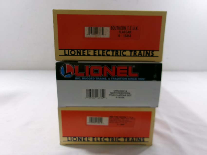 These are the #16334 C&NW TTUX Flat Car Set, the #16363 Southern TTUX Flat Car Set, and the #16904 NYC TTUX Flat Car Set that Lionel made a few years ago. Our Opinion is that the Sets are generally in Like New Condition. Original Boxes. All Original in our Opinion. Please add $45.00 for US-48 Shipping and Insurance (more west of the Mississippi).