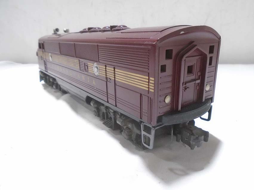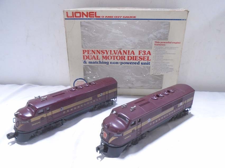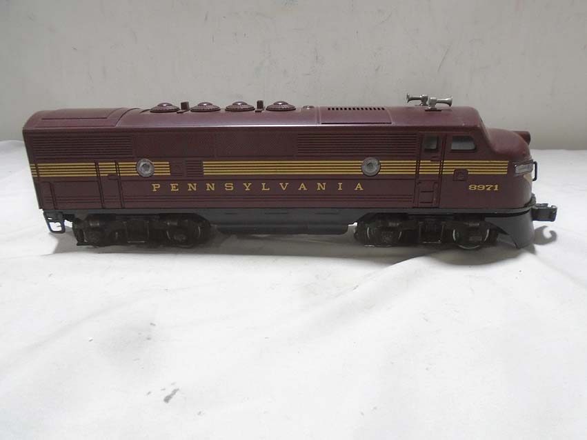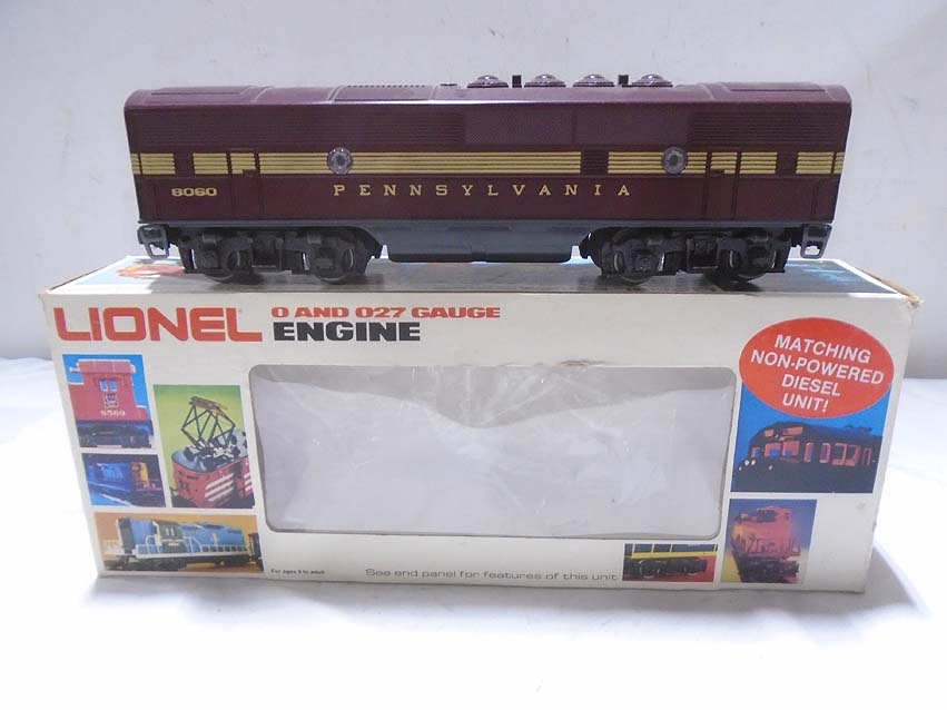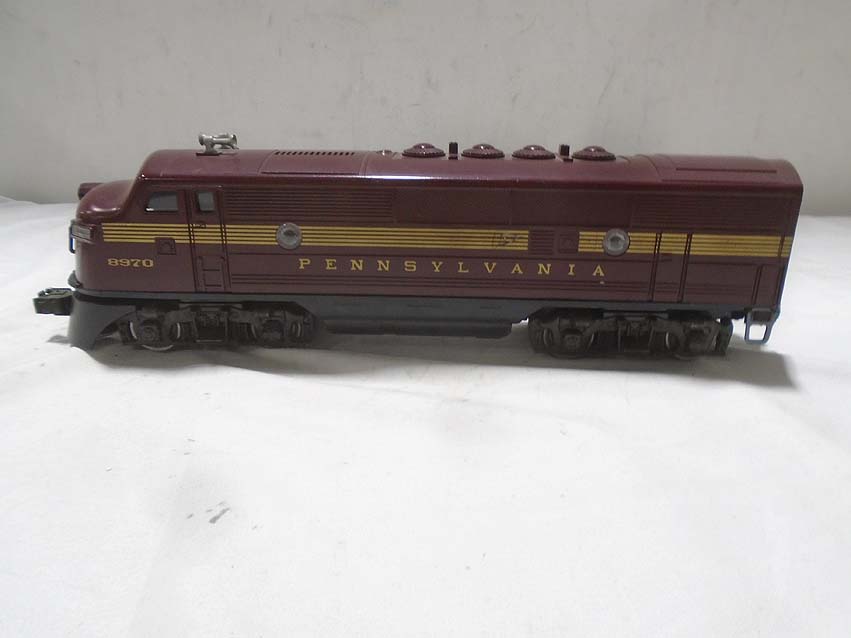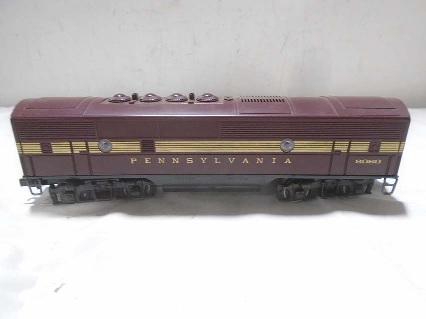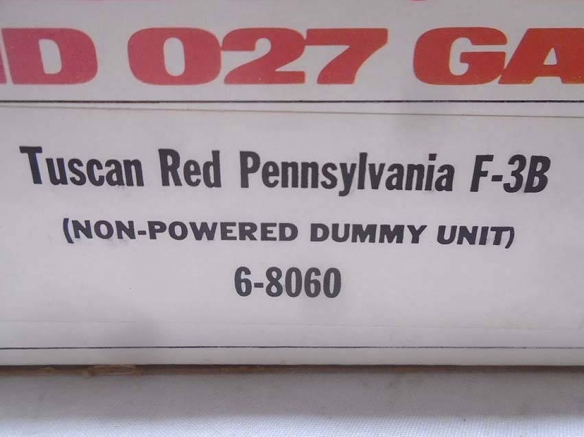 These are the #8970/8060 Tuscan Pennsylvania F-3 ABA Diesels and eight Passenger Cars that Lionel made circa 1980. Included are the #8970/8060 PA ABA Locomotive Units and the #9569/9570/9571/9572/9573/9574/9576/7208 Aluminum Passenger Cars. Our Opinion is that they are generally in Excellent Plus Condition. Original Boxes. All Original in our Opinion. Please add $80.00 for US-48 Shipping and Insurance (more west of the Mississippi). EX+ Lionel #8970/8060 PRR F-3 ABA Diesel Engines and #9569/9570/9571/9572/9573/9574/9576/7208 PRR Aluminum Passenger Cars, OBs GB