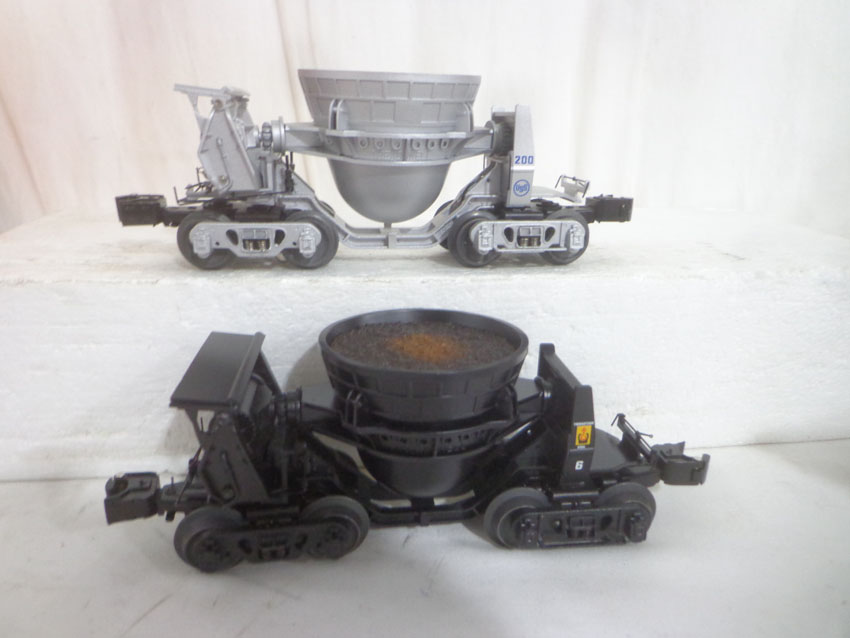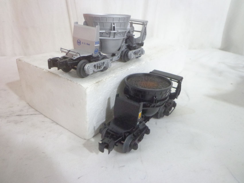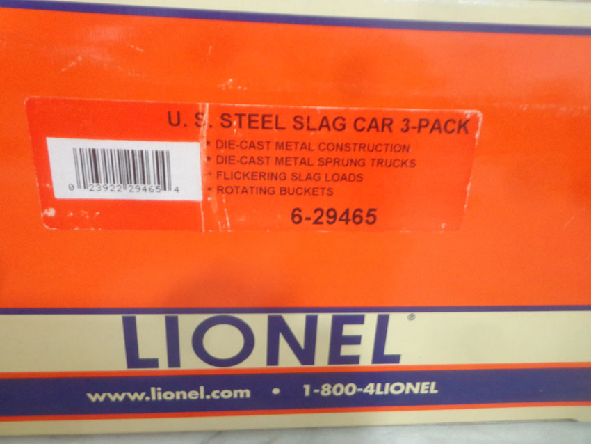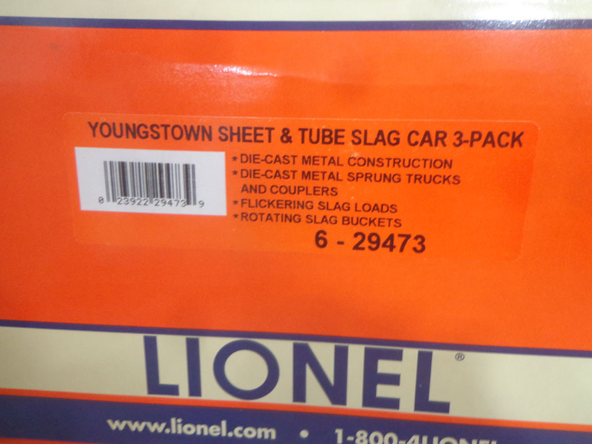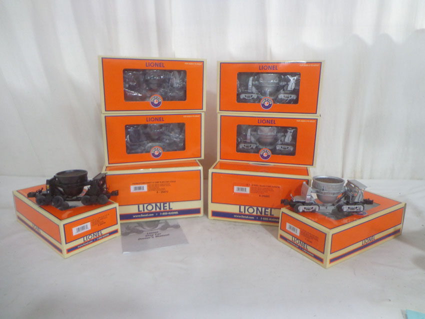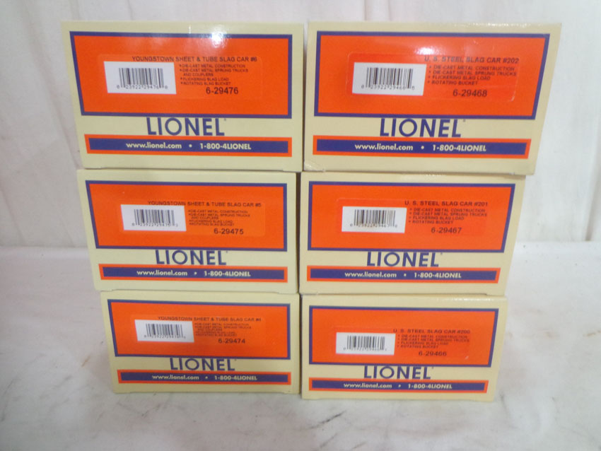 These are the Lionel #29465 US Steel Slag Cars Set of 3 and #29473 Youngstown Sheet and Tube Slag Cars Set of 3. Our Opinion is that the Sets are generally in Like New or Better Condition. Original Boxes. All Original in our Opinion. Please add $45.00 for US-48 Shipping and Insurance (more west of the Mississippi).