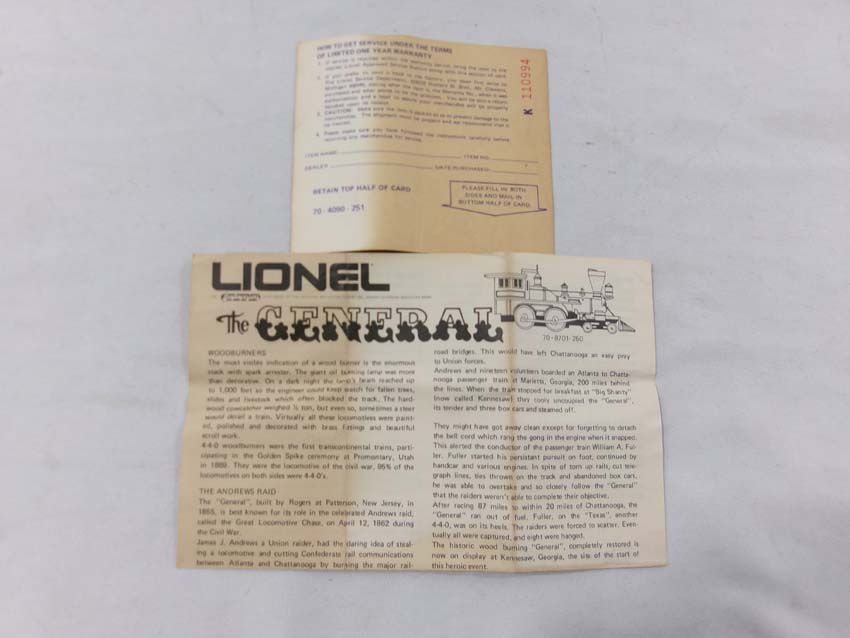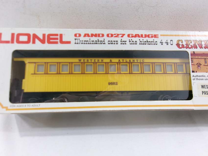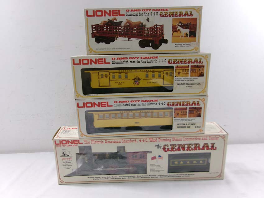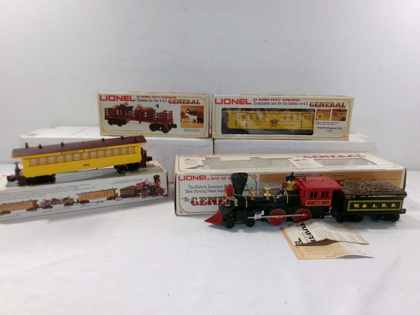 These are the #8701 W&A 4-4-0 General Steam Engine & Tender, #9551 W&A Baggage Car, #9552 W&A Coach, and #9553 W&A Horse Flat Car that Lionel madein the 1970s. Our Opinion is that they are generally in Like New Condition. Original Boxes. All Original in our Opinion. Please add $45.00 for US-48 Shipping and Insurance (more west of the Mississippi).
