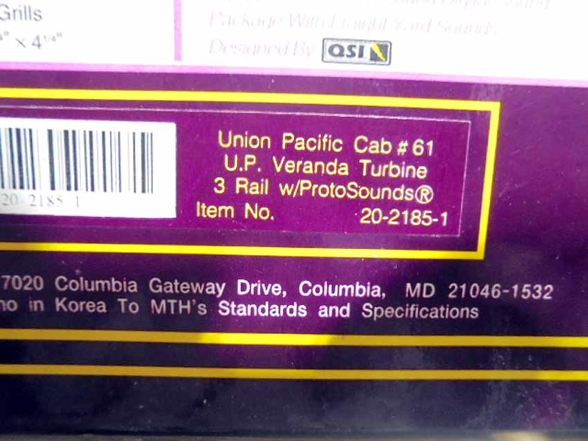 These are the the #20-2185-1 Union Pacific (cab 61) Veranda Turbine 3 Rail w/Proto Sound that MTH made in O Gauge a few years ago. Our Opinion is that they are generally in Like New Condition. Original Box. All Original in our Opinion. Please add $50.00 for US-48 Shipping and Insurance (more west of the Mississippi).