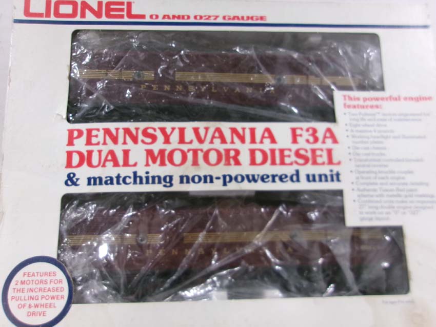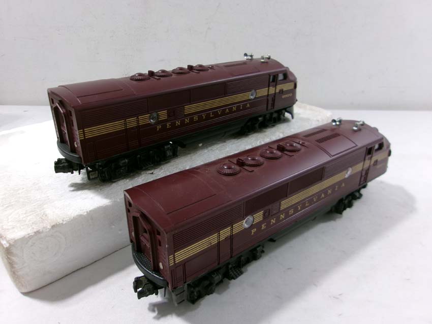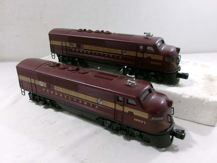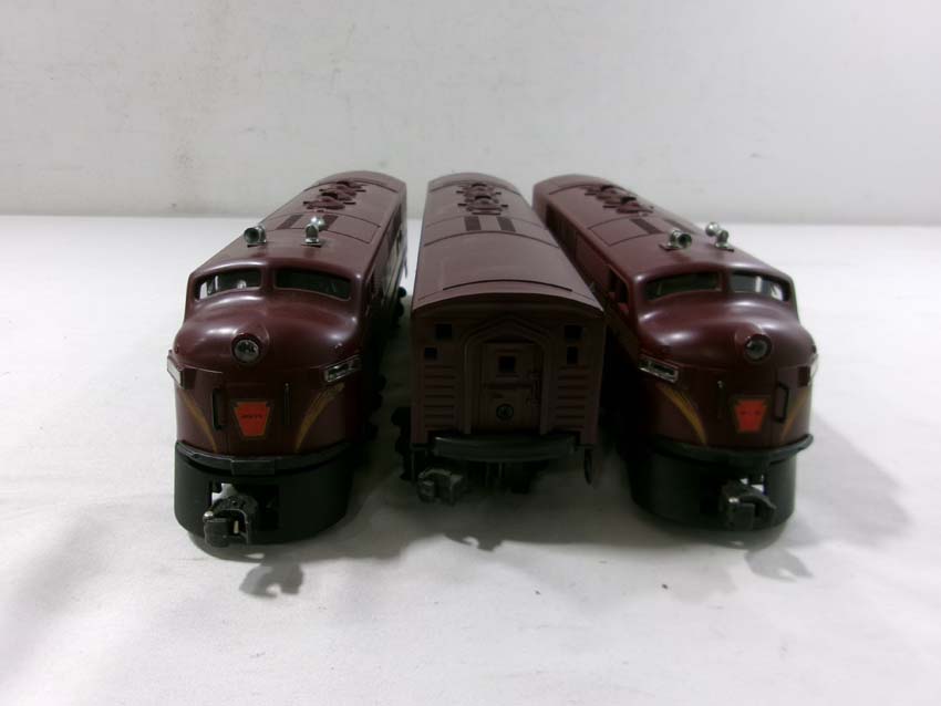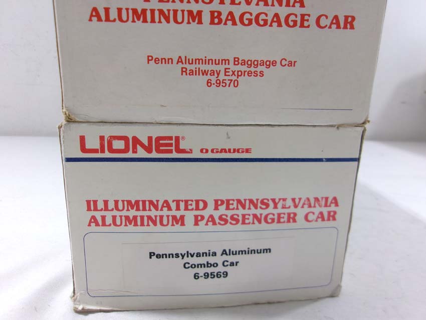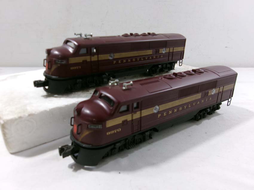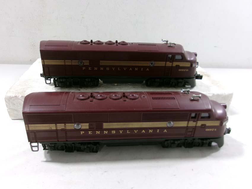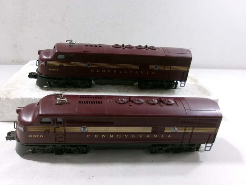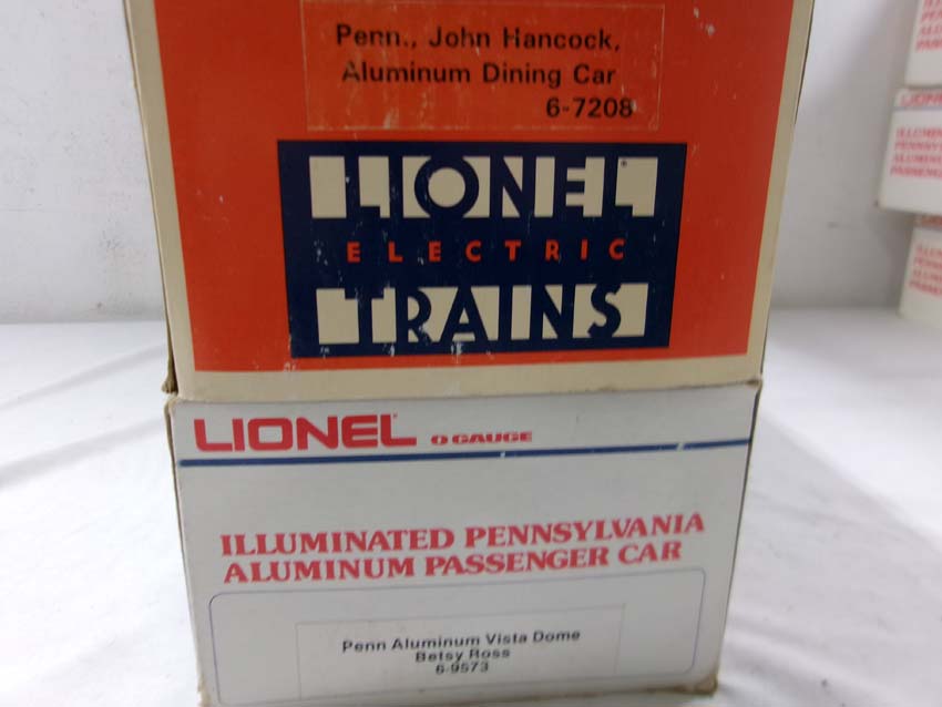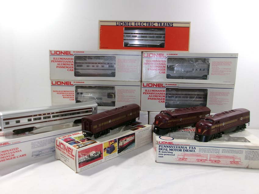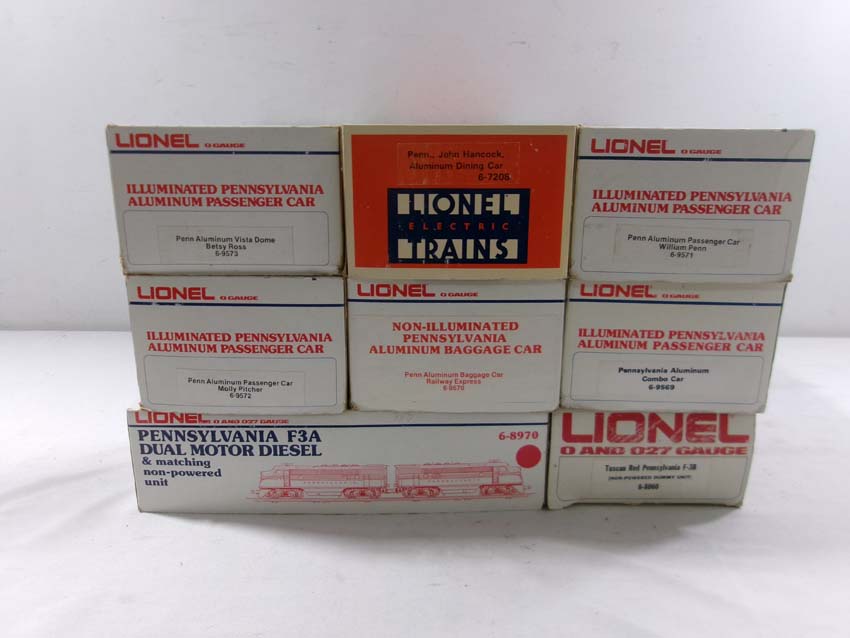 These are the #8970/8971 PRR F-3 AA Diesel Engines, #8060 PRR F-3 B Diesel Engine and six Assorted Passenger Cars that Lionel made in the 1980s. Includes the #9569/9570/9571/9572/9573/7208 PRR Aluminum Passenger Cars. Our Opinion is that they are generally in Like New Condition. Original Boxes. Please add $60.00 for US-48 Shipping and Insurance (more west of the Mississippi).
