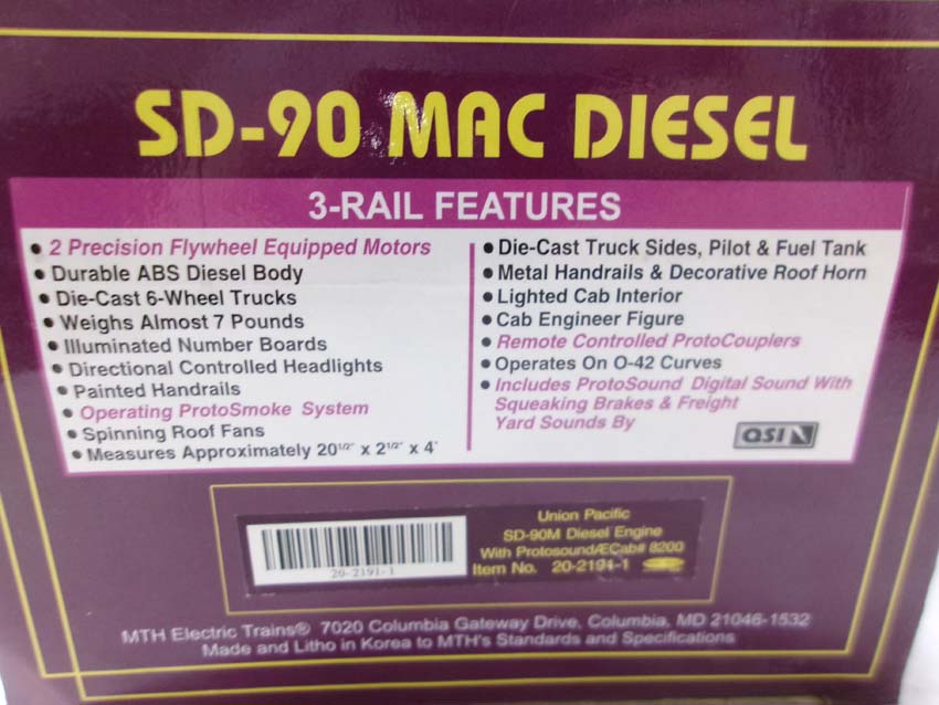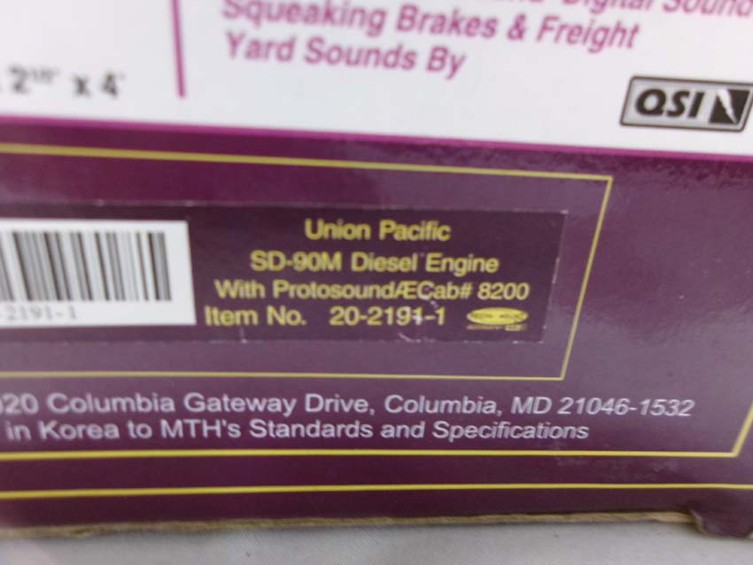 This is the #20-2191-1 Union Pacific SD-90M Engine with Proto-Sound that MTH made a few years ago. Our Opinion is that it is generally in Like New Condition. Original Box. All Original in our Opinion. Please add $45.00 for US-48 Shipping and Insurance (more west of the Mississippi).